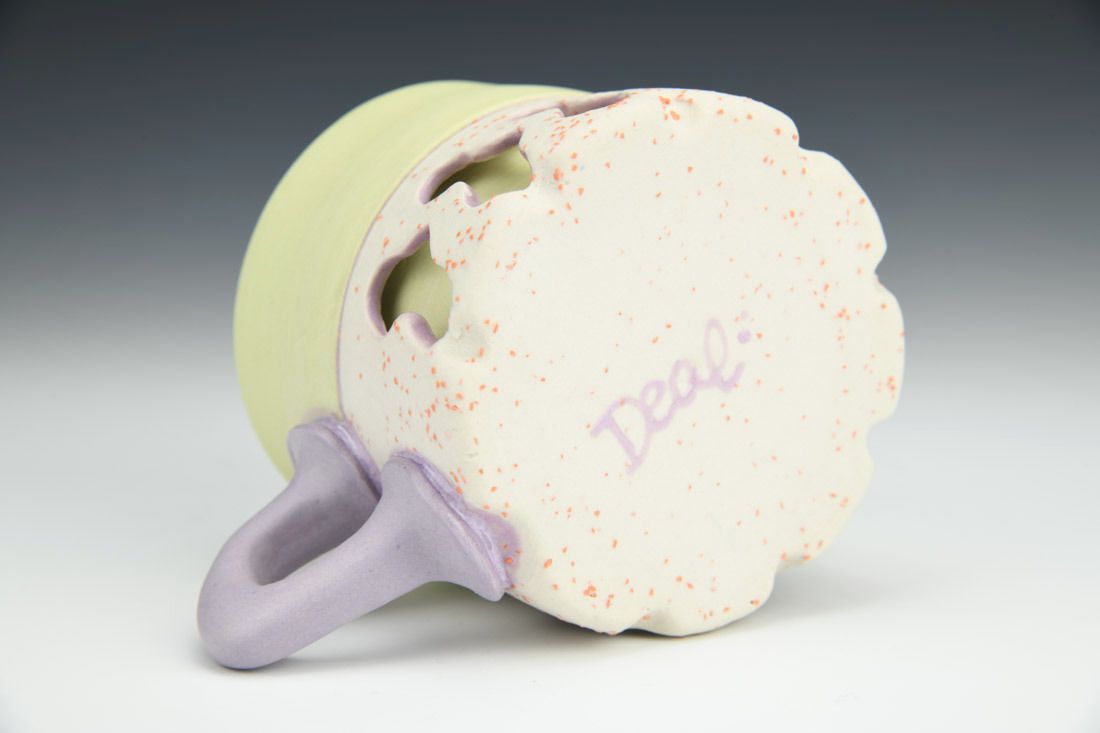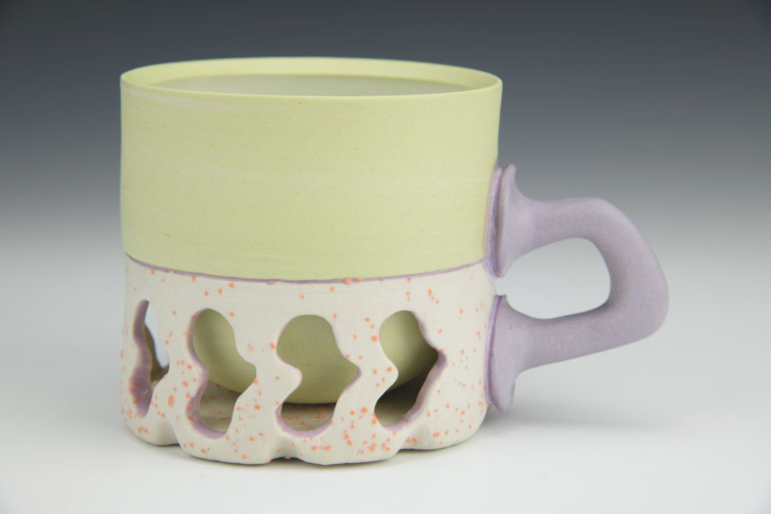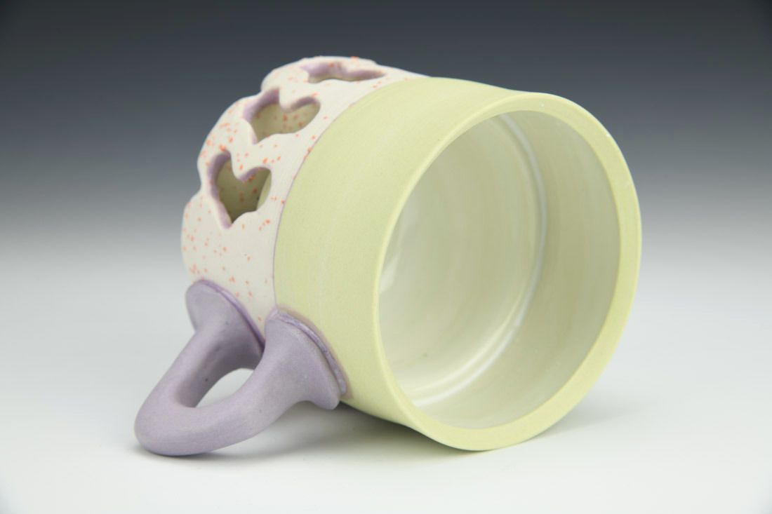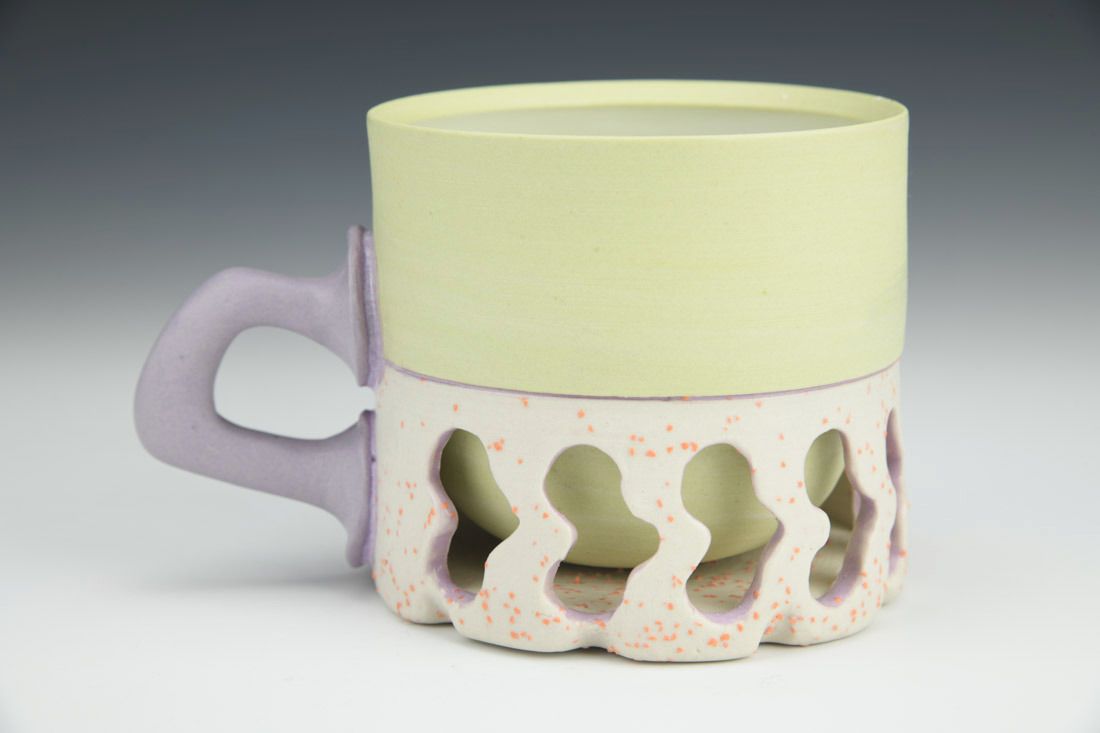 Stained porcelain with stained grog, wheel thrown and altered, glaze, cone 6 oxidation fired, 3.5 x 5.5 x 3.5 inches.