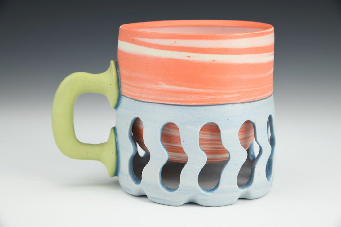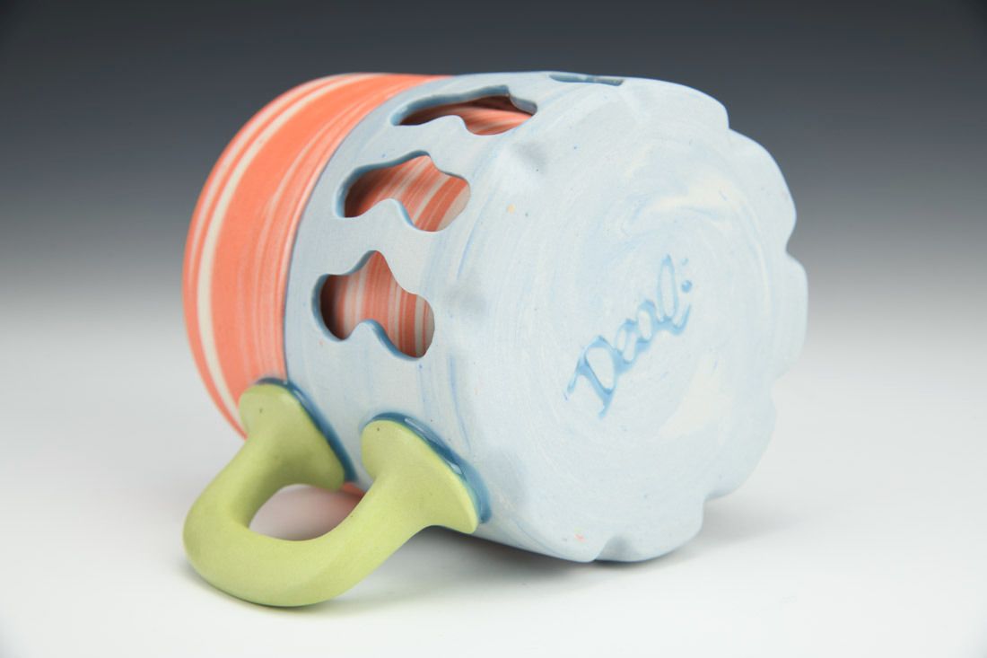 Stained porcelain, wheel thrown and altered, glaze, cone 6 oxidation fired, 4 x 5.25 x 3.75 inches.
