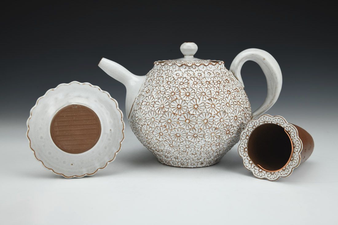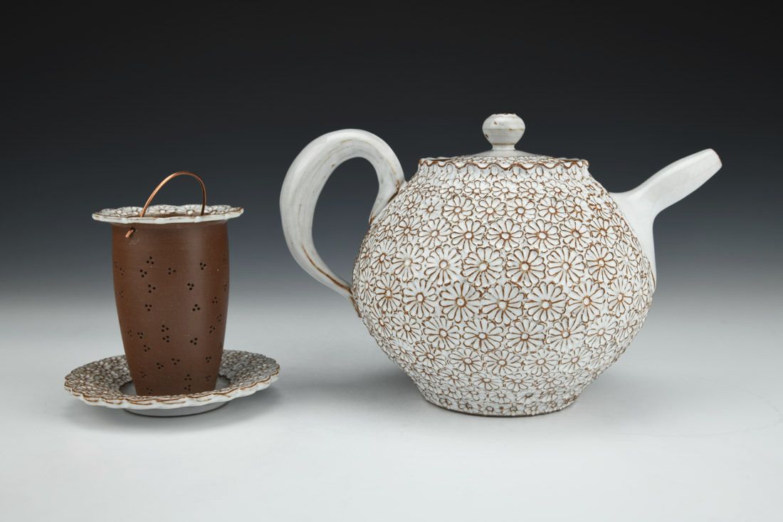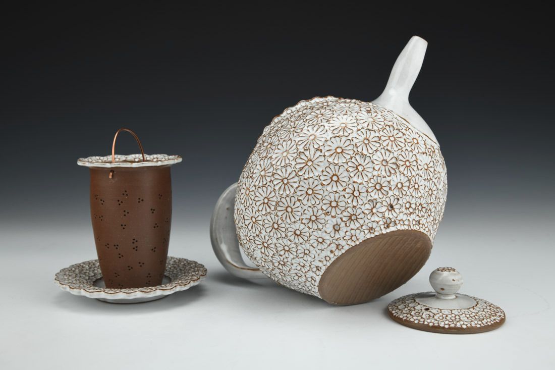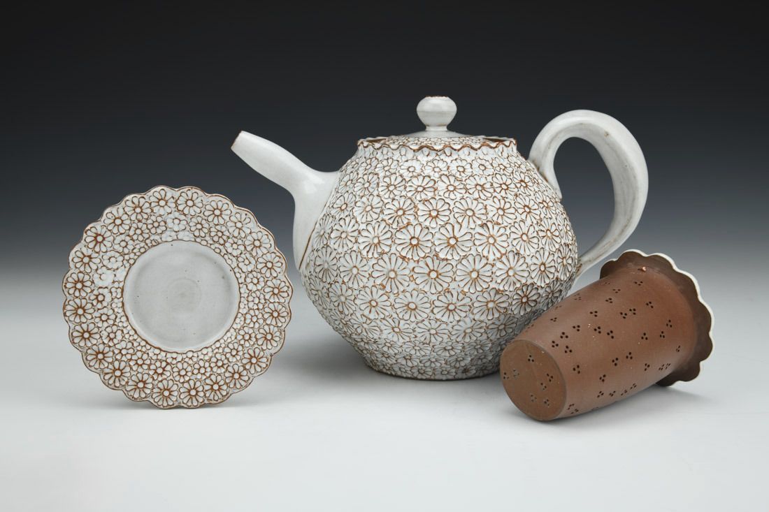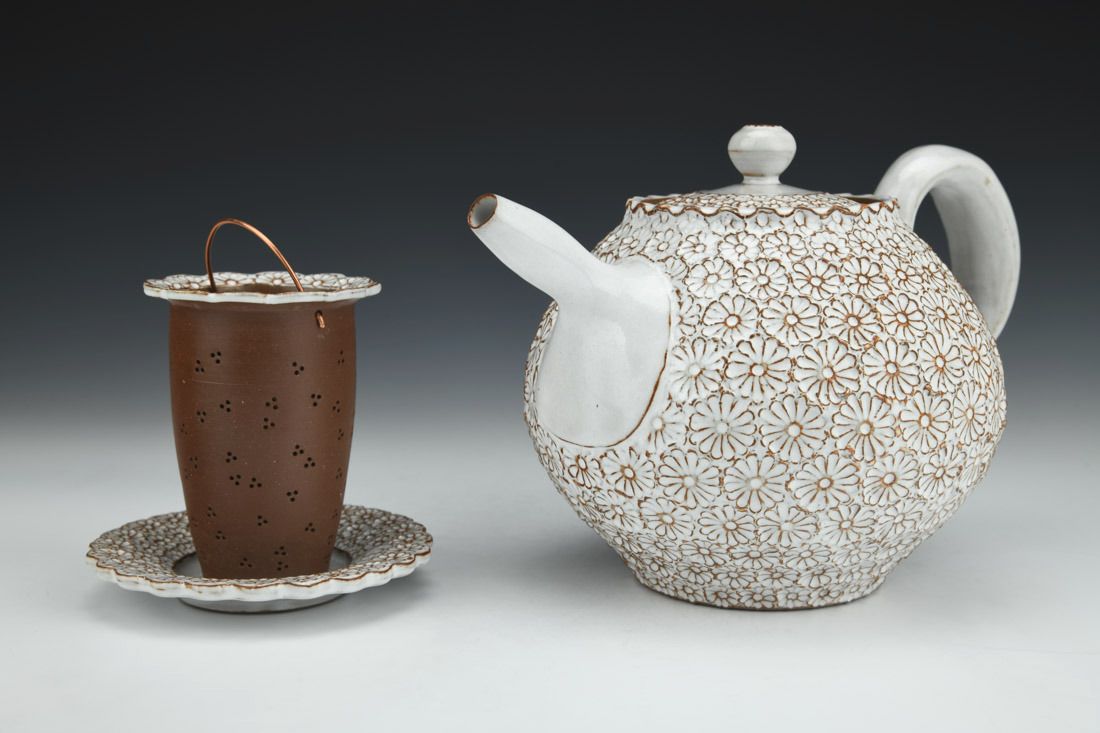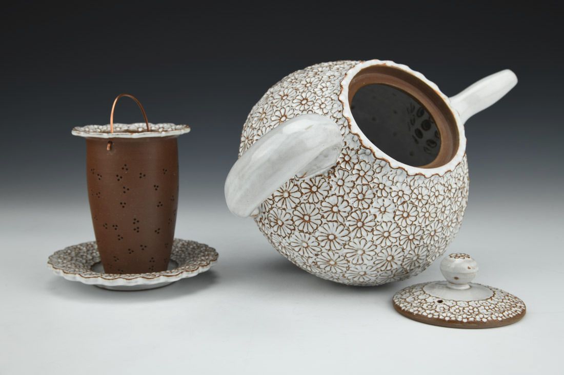 Red stoneware with copper wire, wheel thrown, hand carved, glaze, cone 5 electric fired, teapot: 6 x 9 x 6.5 inches, infuser: 3.75 x 3 x 3 inches, saucer: 0.75 x 4.5 x 4.5 inches.