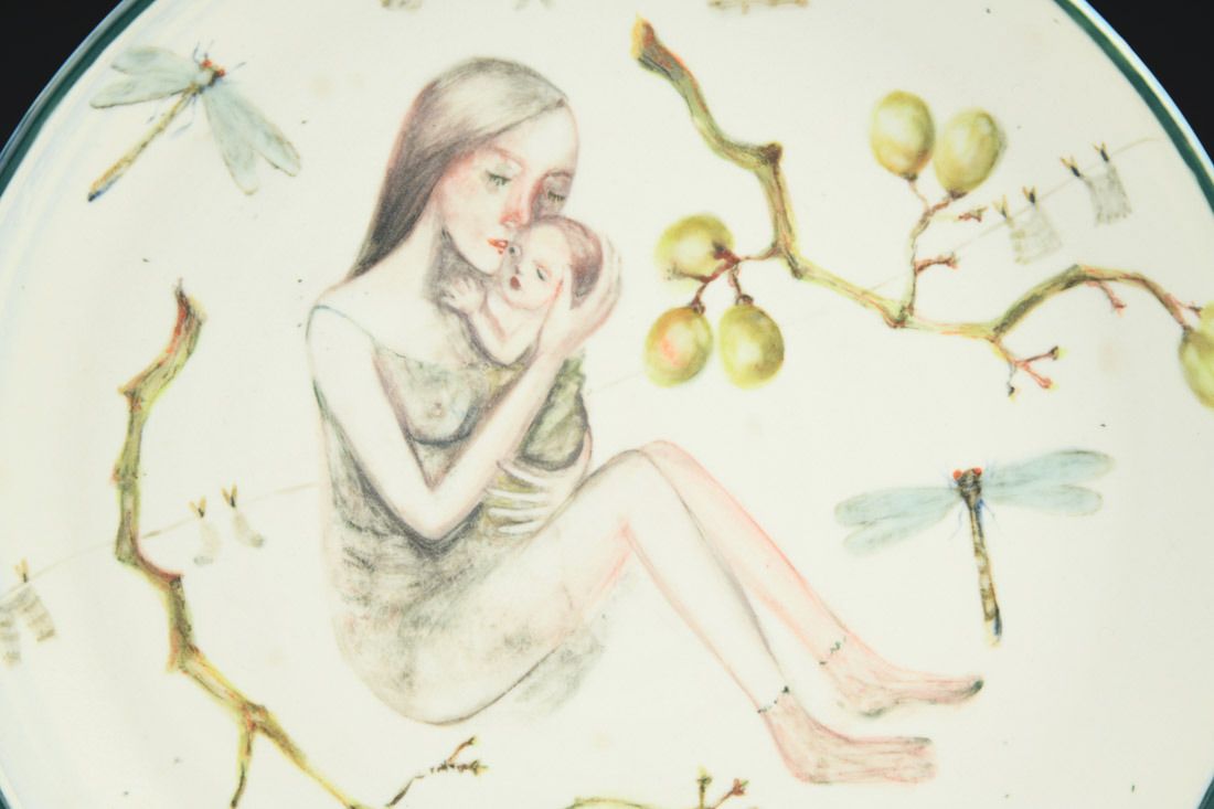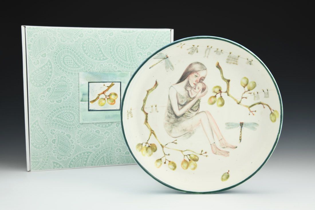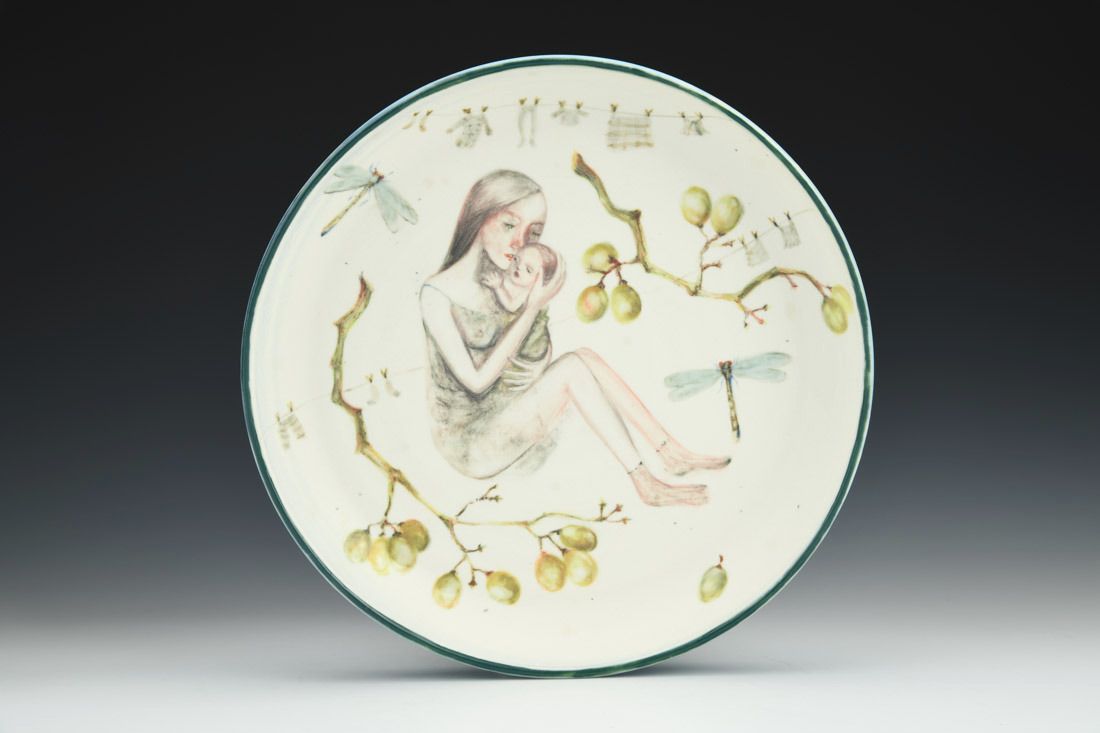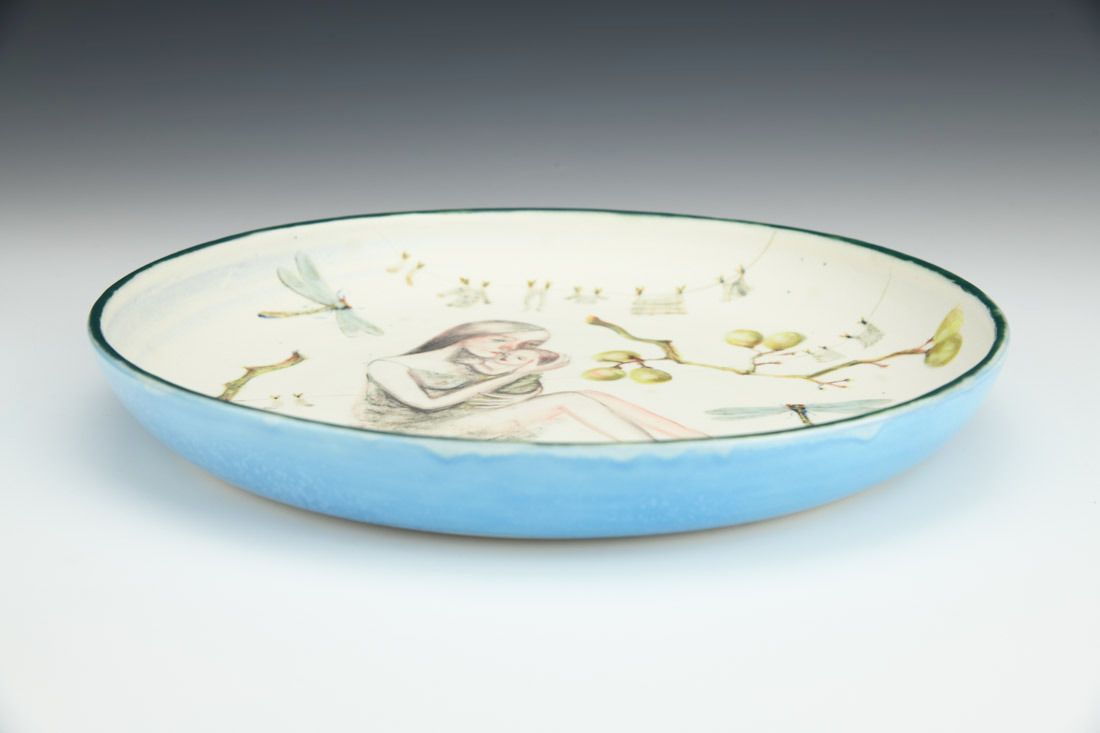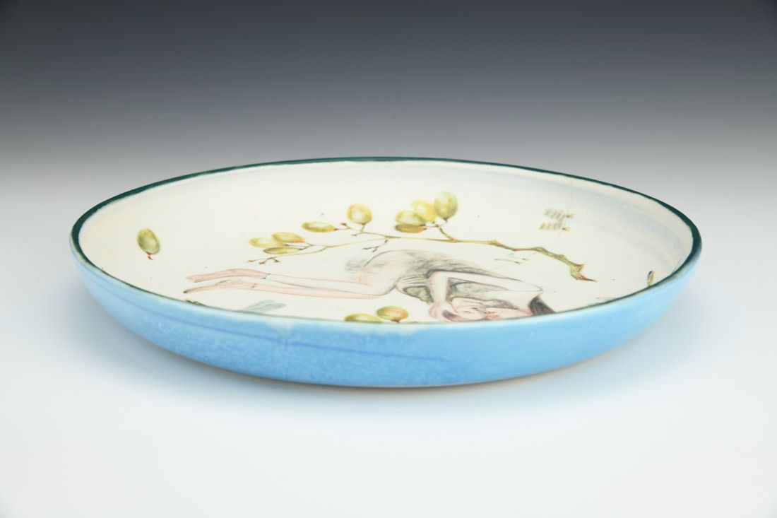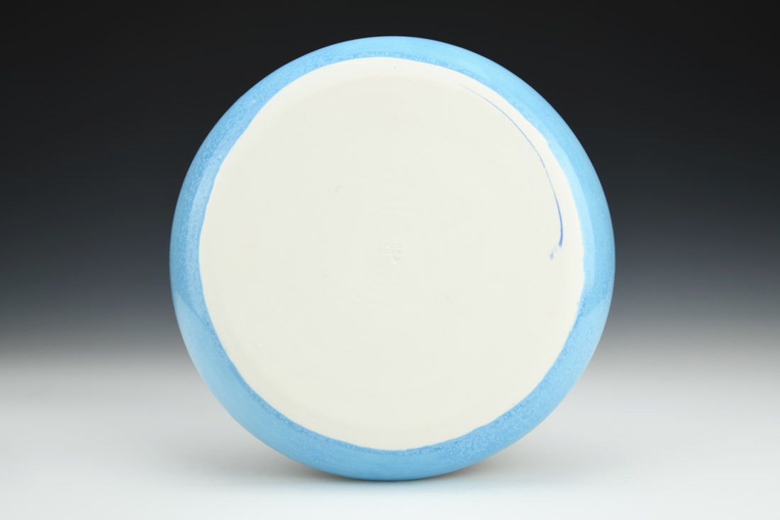 Audrey Blackman porcelain, wheel thrown, hand painted underglaze, various glazes, cone 9 electric fired, 1.5 x 9.5 x 9.5 inches.