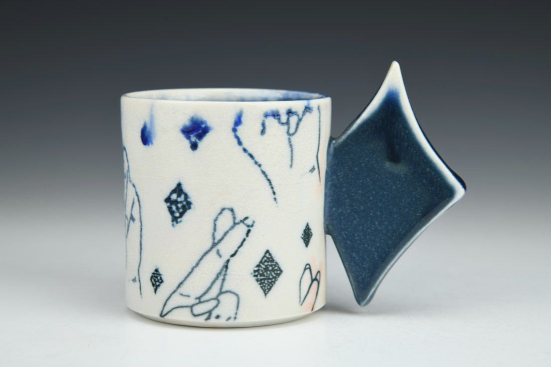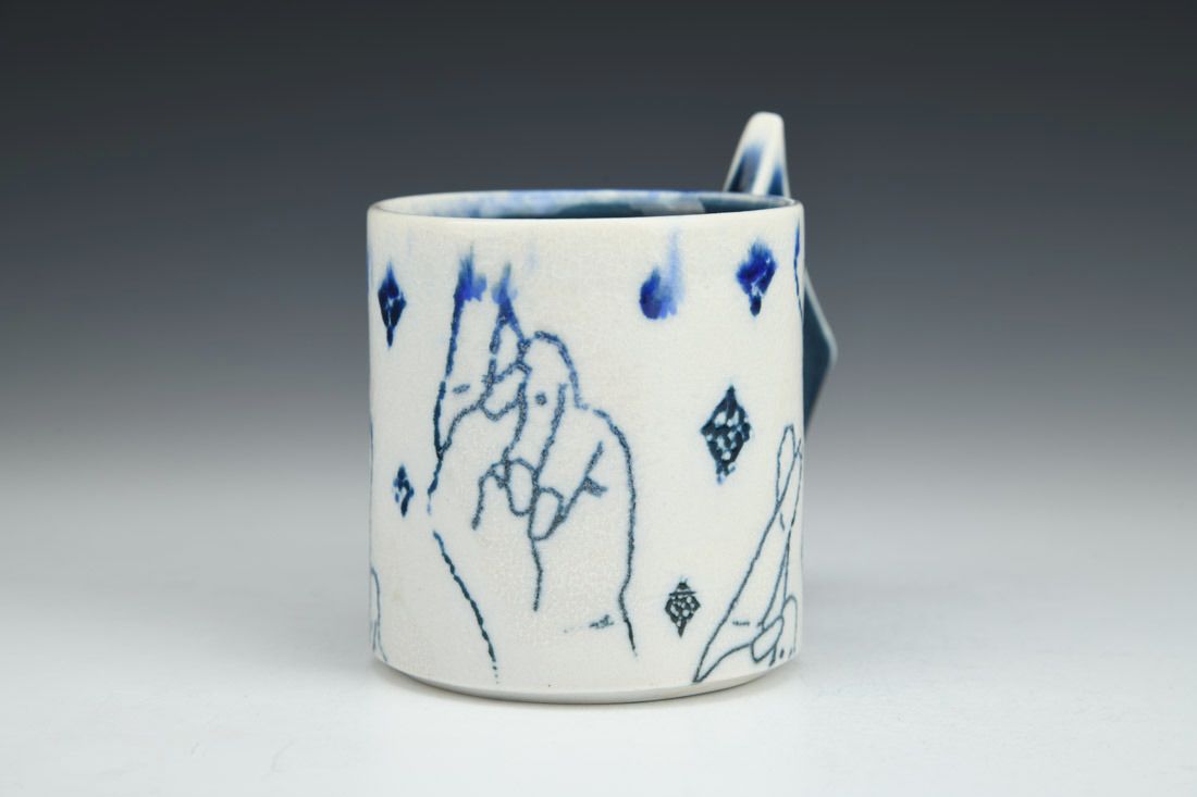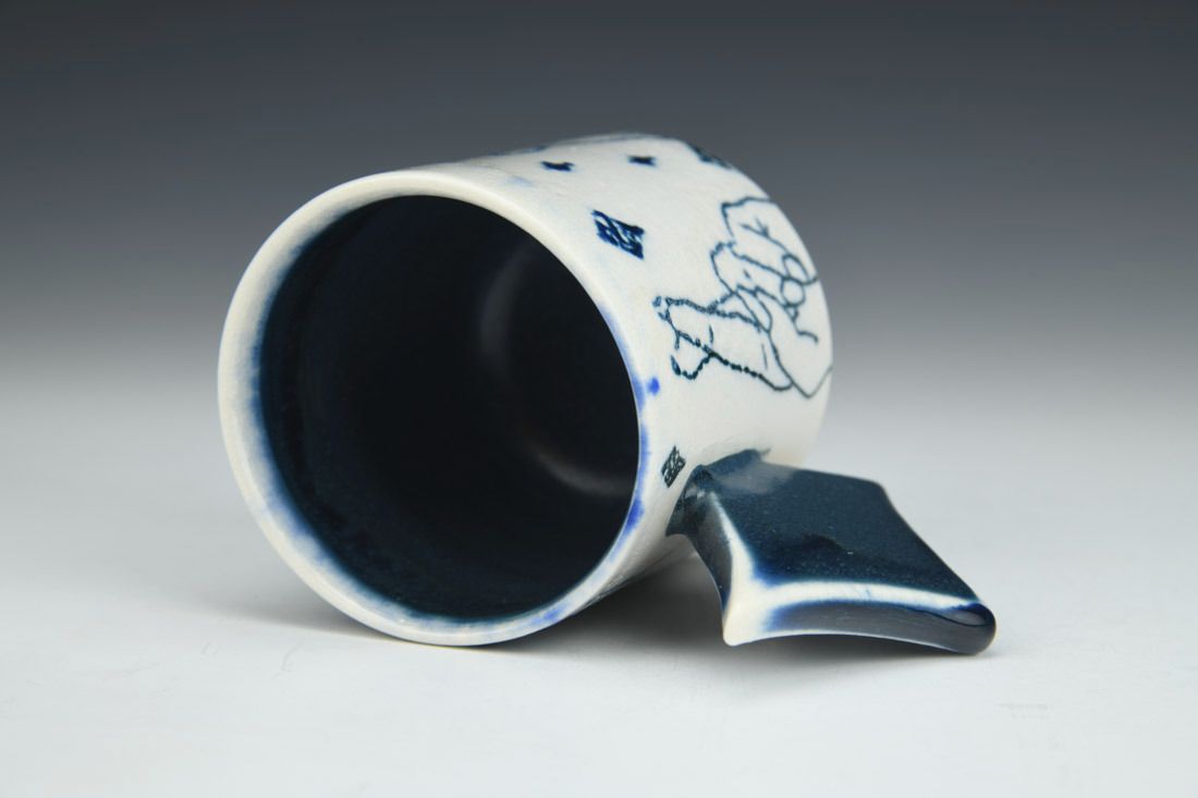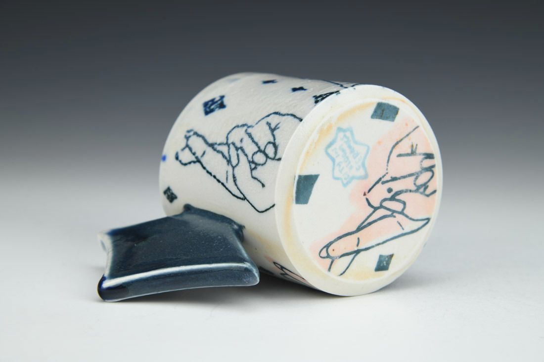 Porcelain, wheel thrown, screenprinted underglaze, glaze, cone 6 soda reduction fired, 3.25 x 4.5 x 2.75 inches.