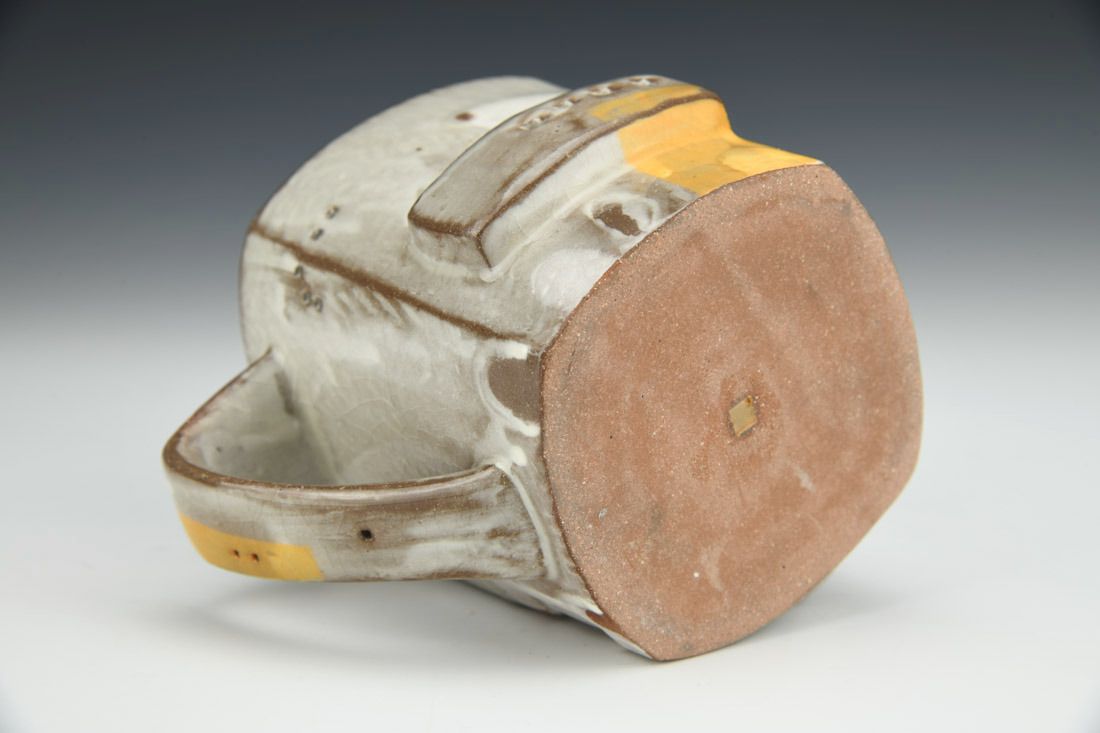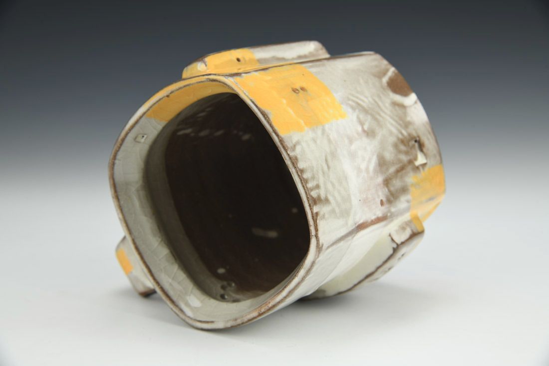 Red earthenware, hand built, resist markings, sanded and polished, porcelain slip, underglaze, glaze, cone 6 oxidation fired, 4 x 5 x 4.25 inches.