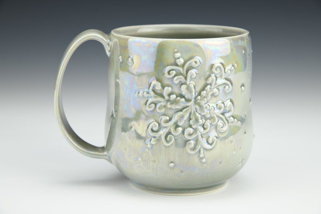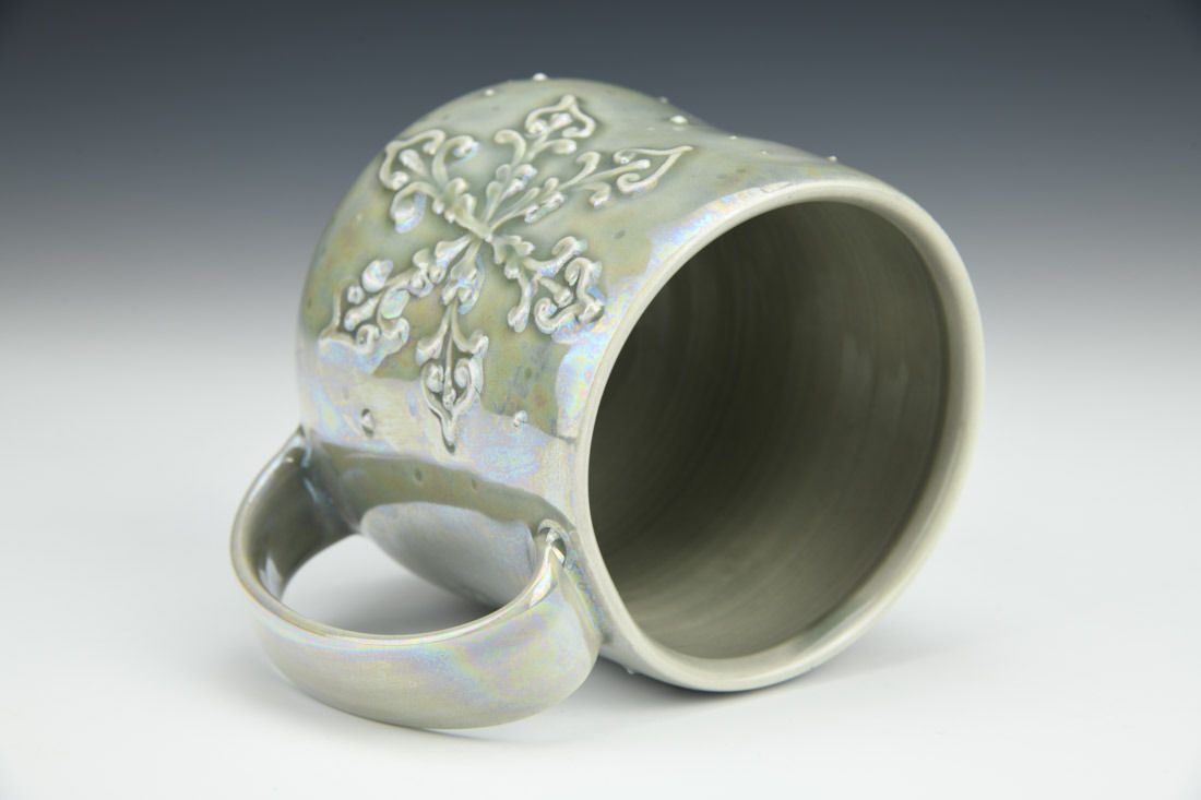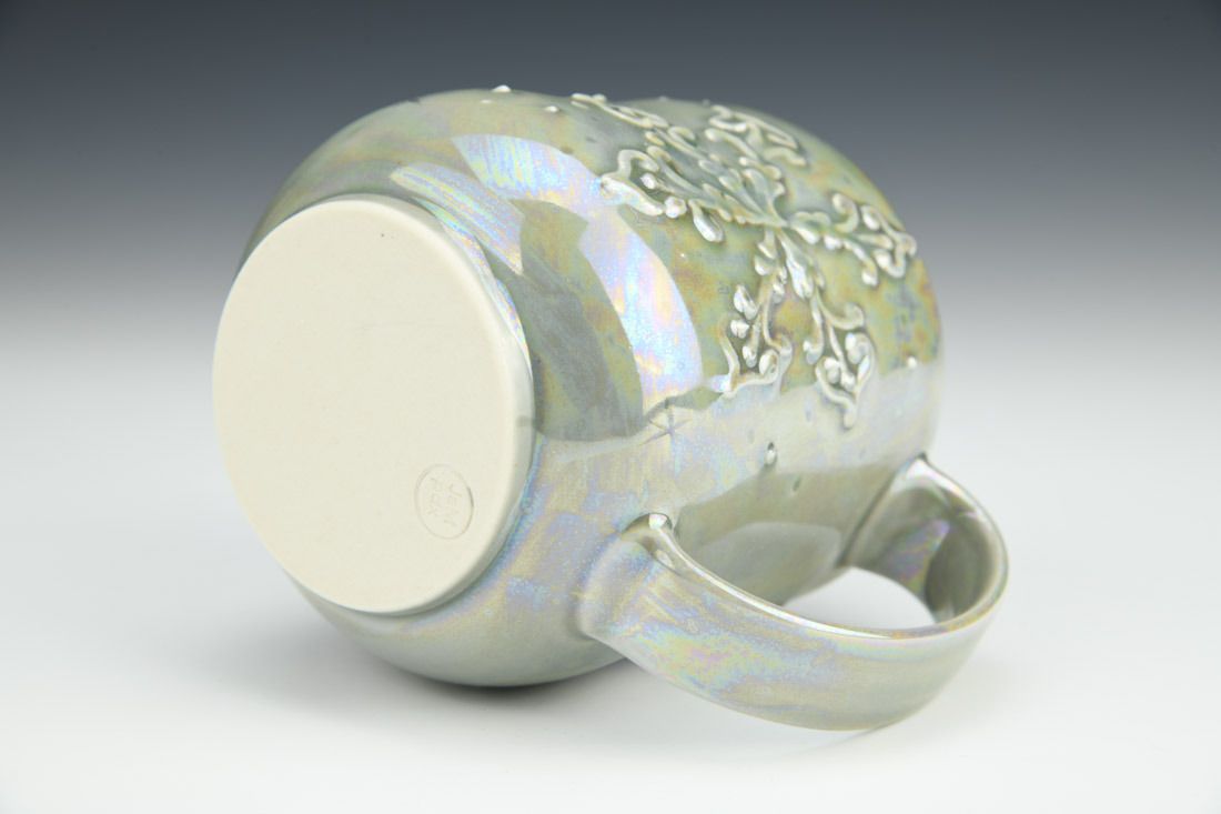 English Grolleg mid-range porcelain, wheel thrown, cake decorated with porcelain slip, carved, mother of pearl luster, mid-range fired, 4 x 4.75 x 3.5 inches.