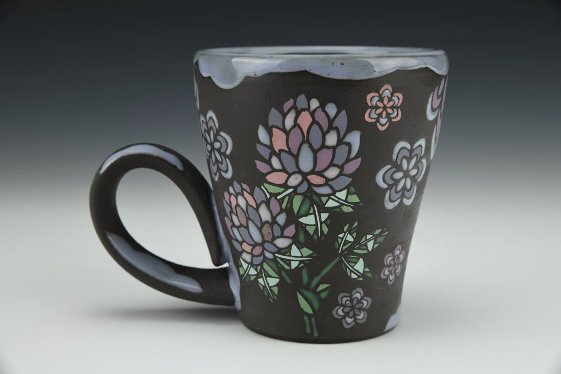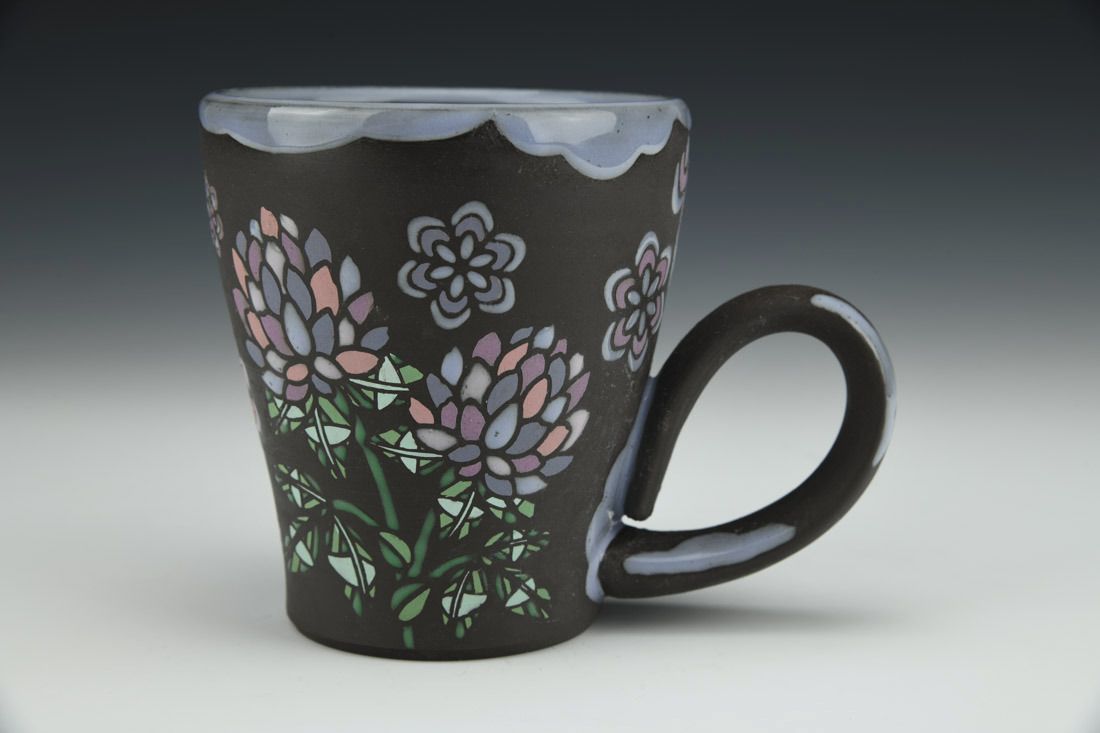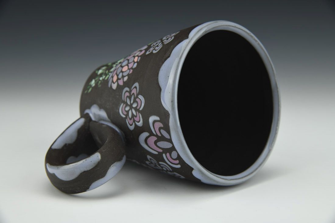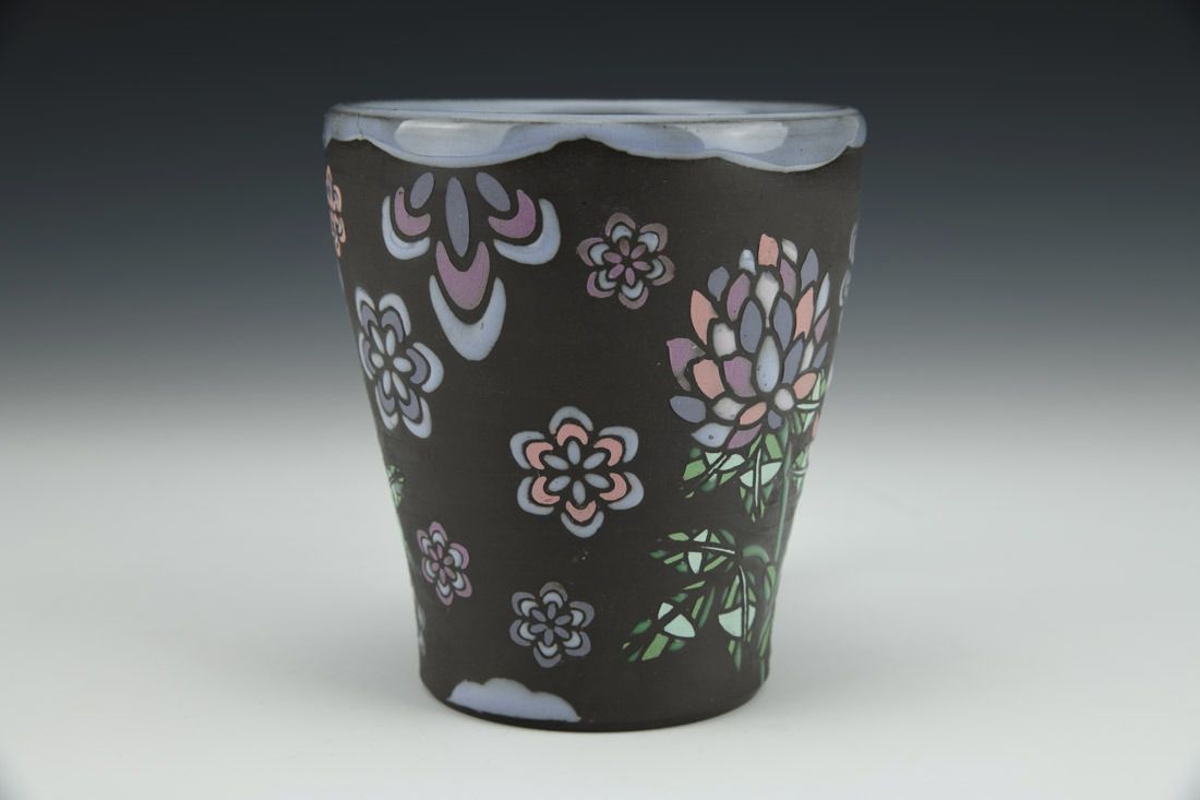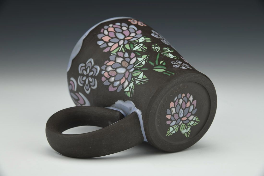 Dark stoneware, wheel thrown, underglaze, glaze, cone 6 oxidation fired, 4.25 x 5.5 x 4 inches.