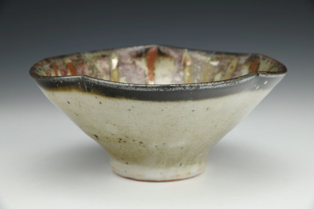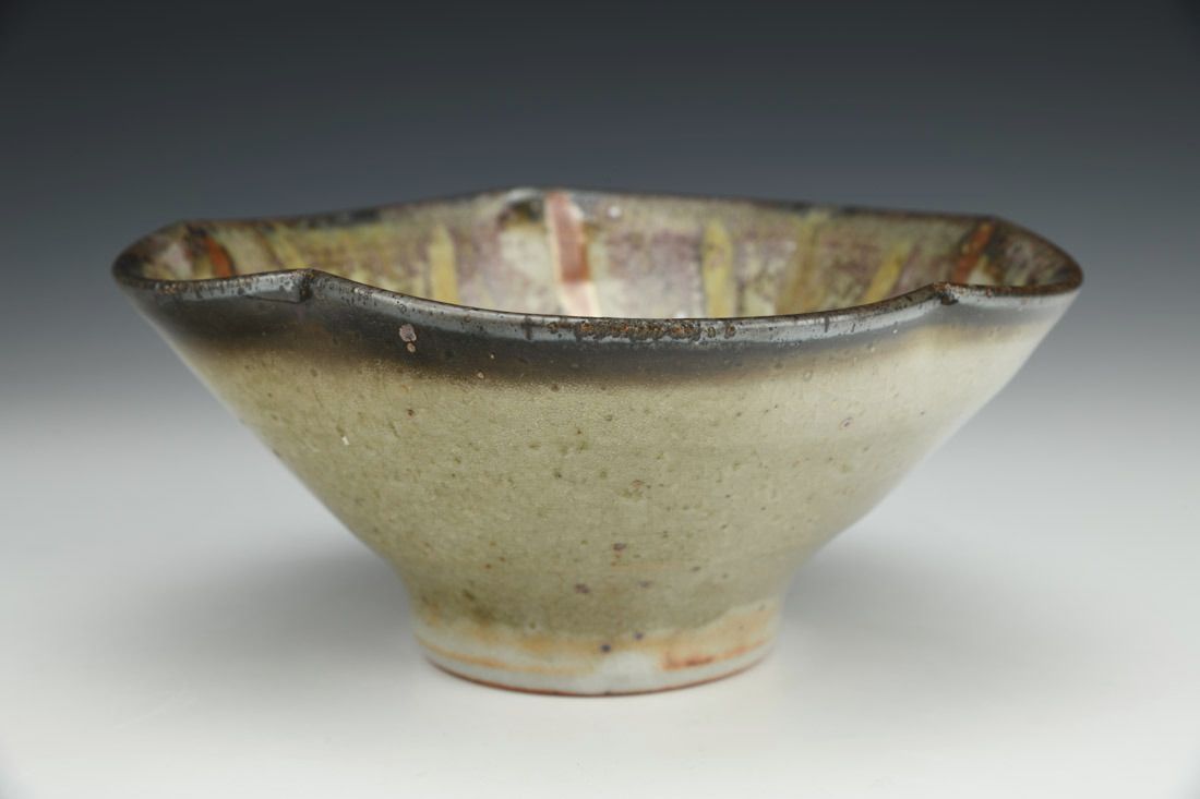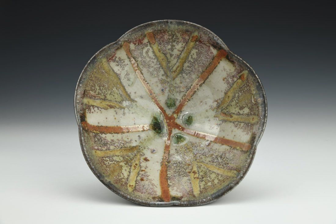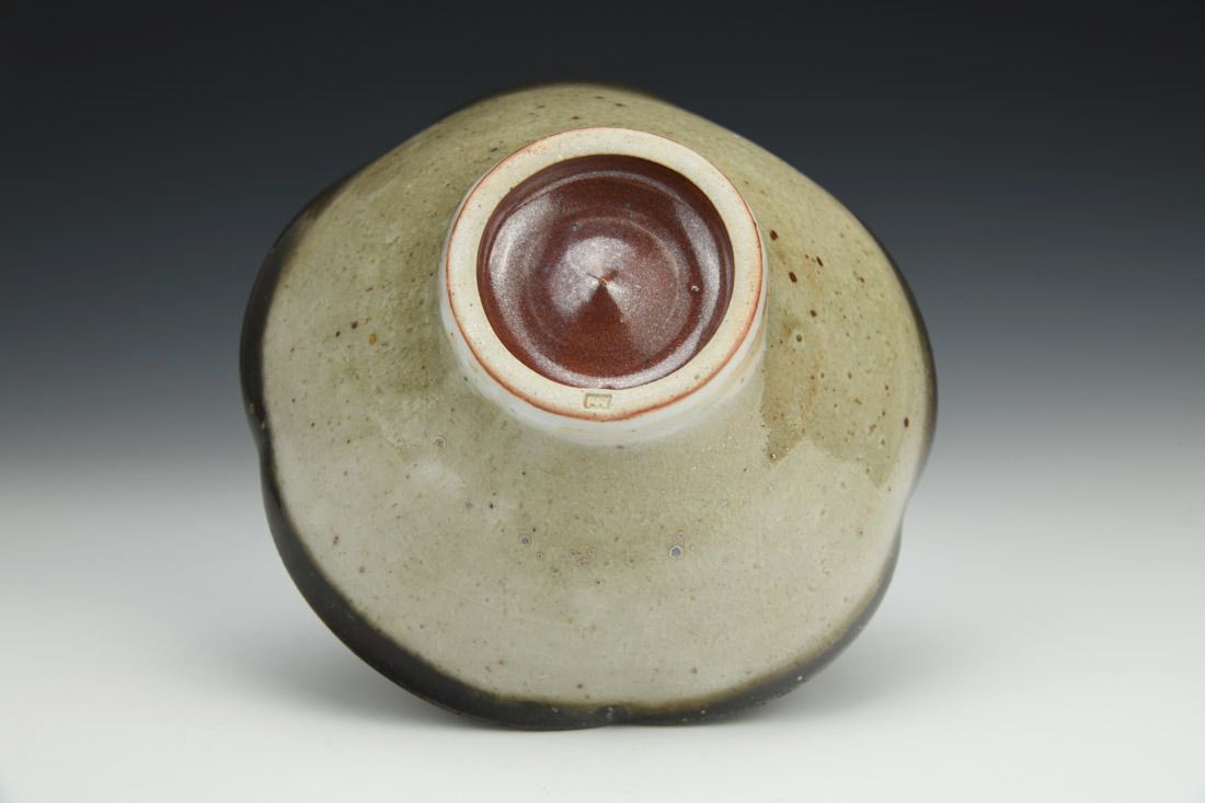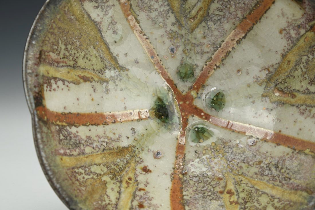 Stoneware, wheel thrown, shino glaze, wood ash, cone 10 reduction fired, 3 x 7 x 7 inches.