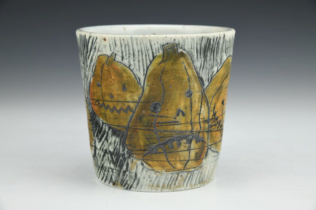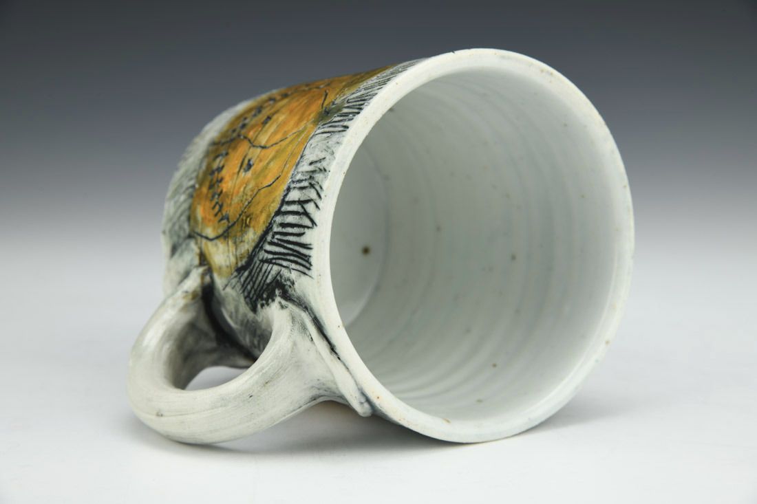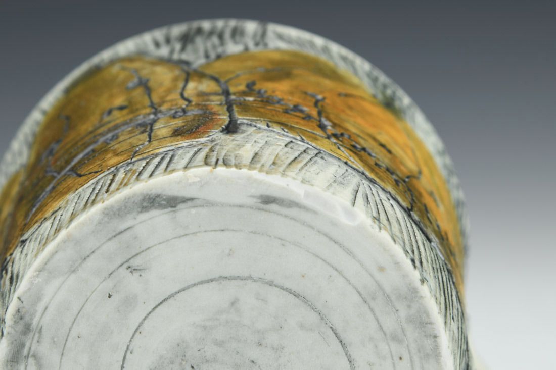 Porcelain, wheel thrown, carved, stain, wash, underglaze, glaze, cone 10 reduction fired, 4 x 5 x 3.75 inches.