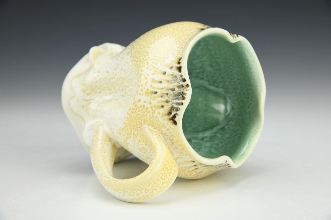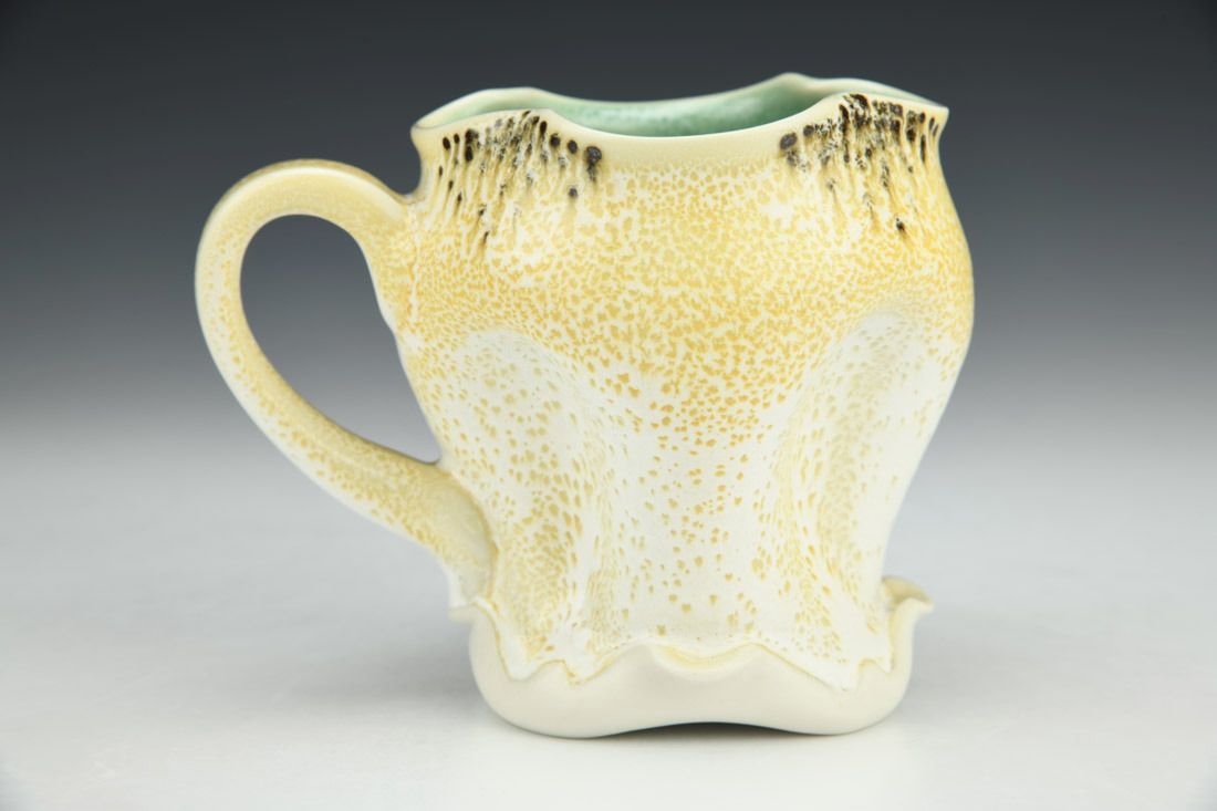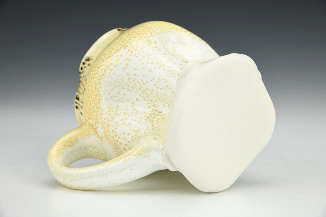Porcelain, wheel thrown and altered, cone 11 oxidation fired, 4.5 x 5 x 3 inches.