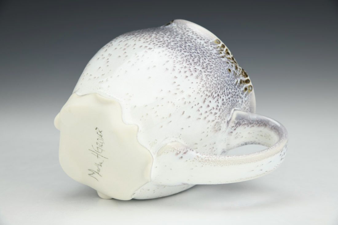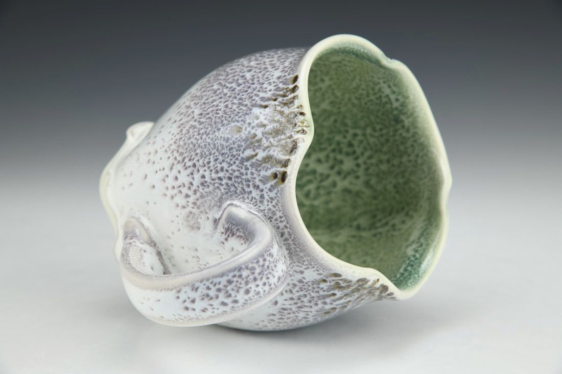 Porcelain, wheel thrown and altered, cone 11 oxidation fired, 4.5 x 5 x 3 inches.