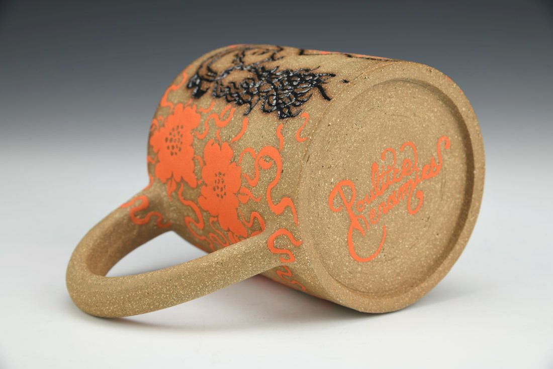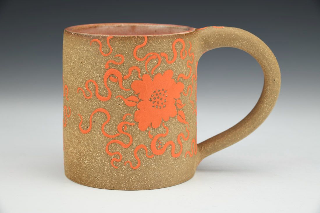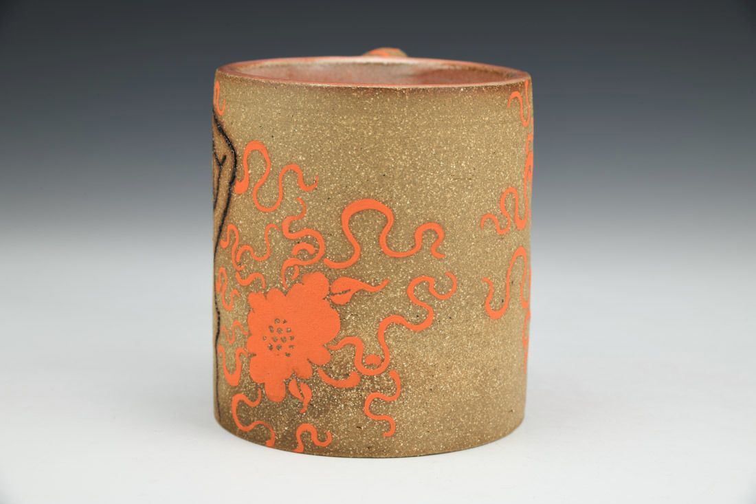 Brown stoneware, wheel thrown, hand carved, hand painted underglaze, inlaid glaze, cone 6 electric fired, 4 x 5.5 x 3.5 inches.