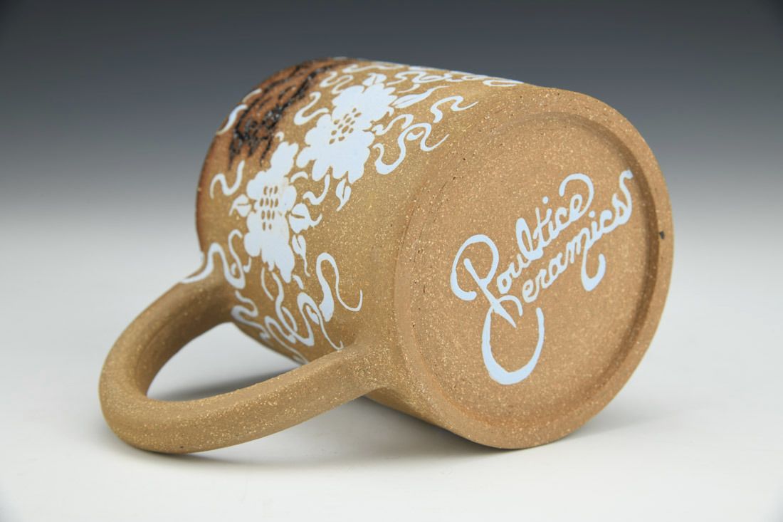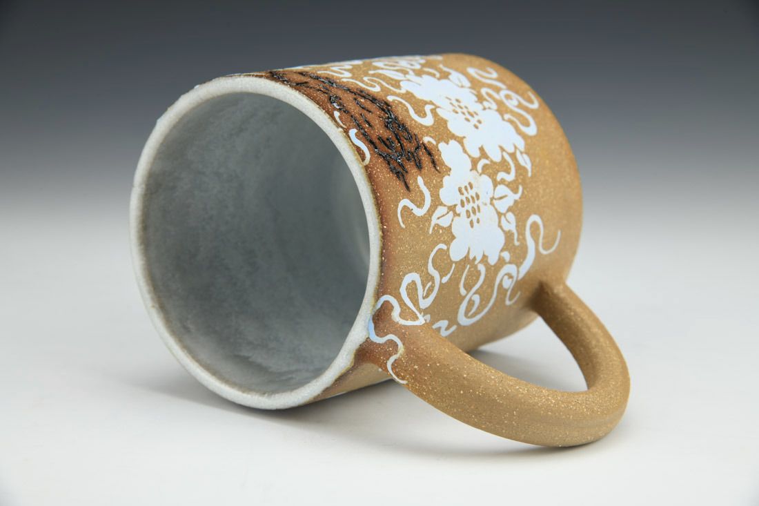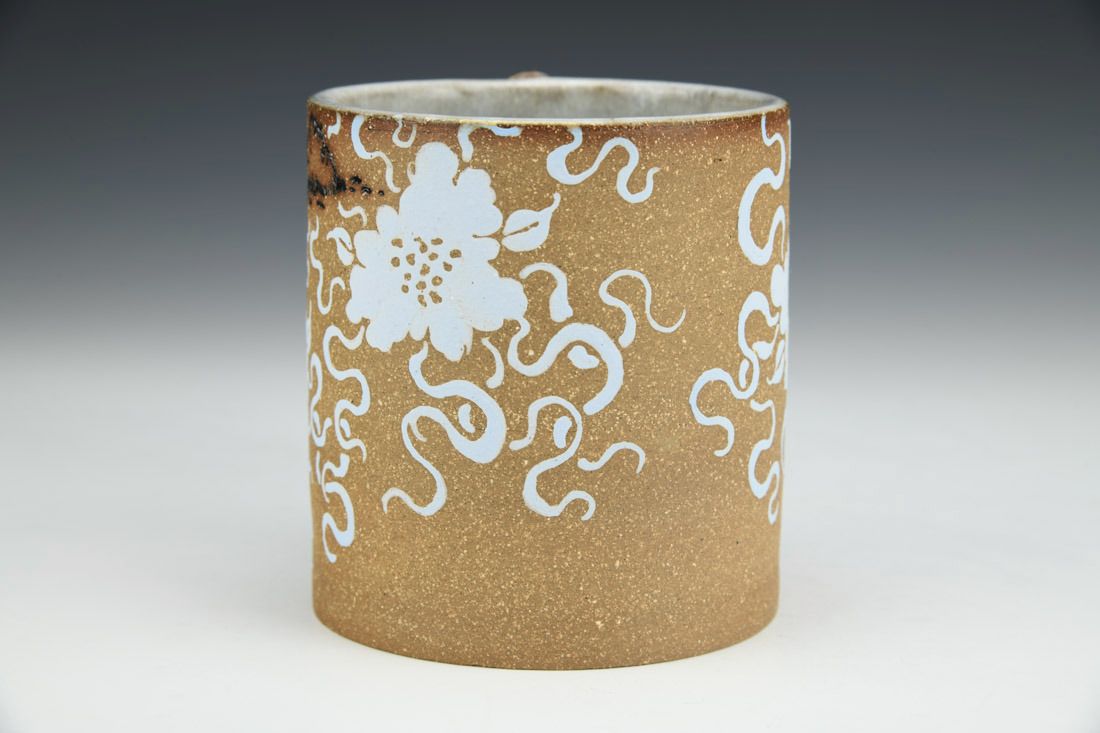 Brown stoneware, wheel thrown, hand carved, hand painted underglaze, inlaid glaze, cone 6 electric fired, 3.75 x 5.5 x 3.5 inches.