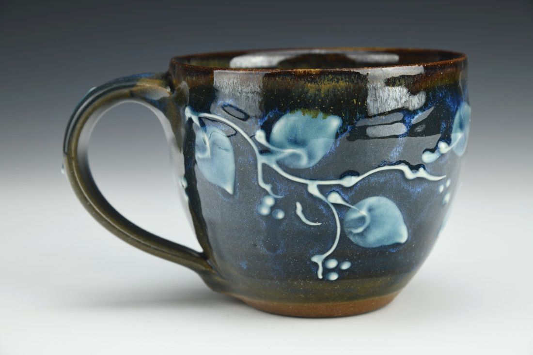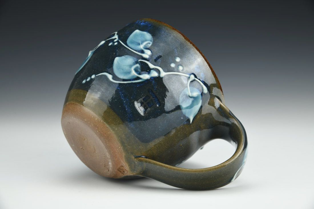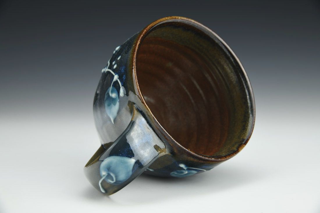 Stoneware, wheel thrown, slip trailed, cone 6 electric fired, 3.5 x 5.5 x 4 inches.