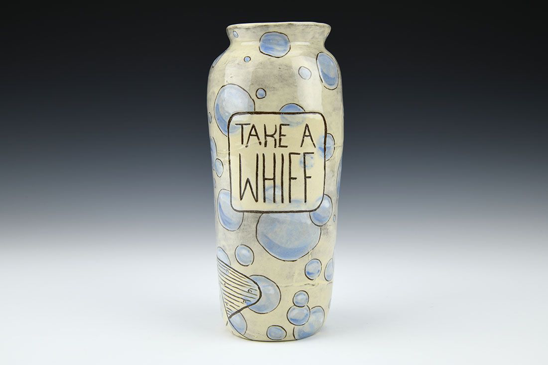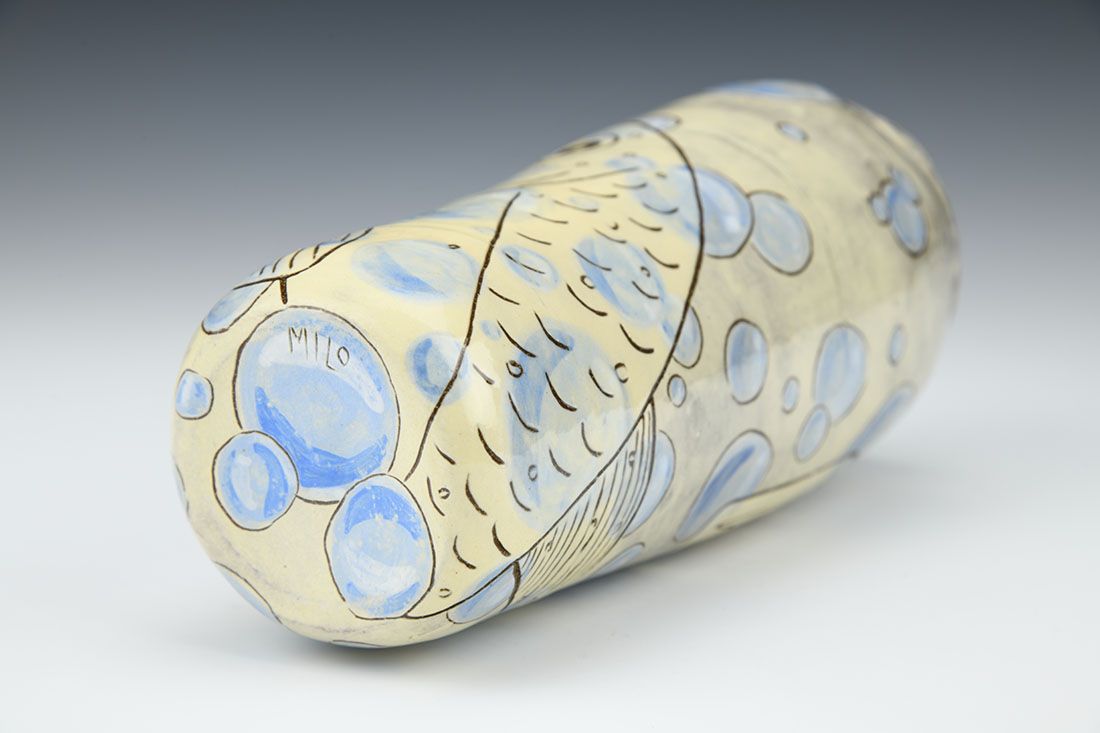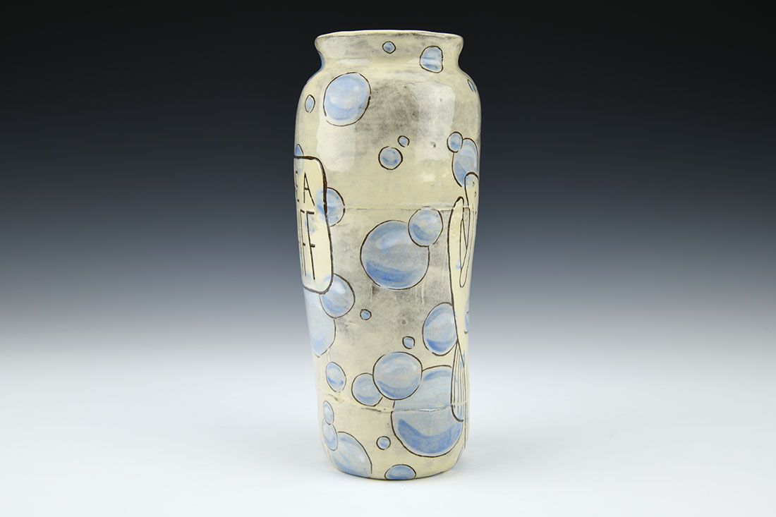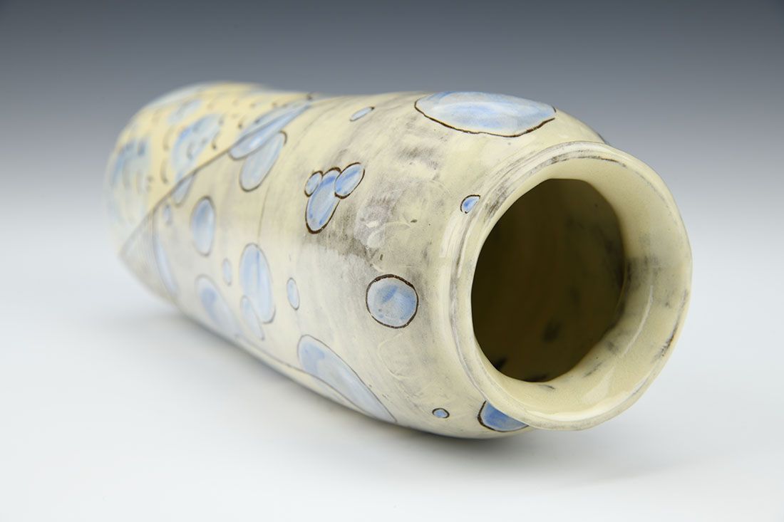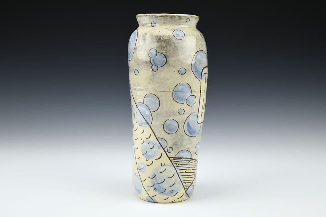 Stoneware, hand built, slip, underglaze, glaze, cone 6 electric fired, 7.5 x 3.25 x 3.25 inches.