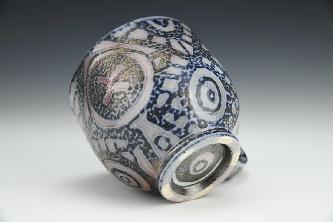 Porcelain, wheel thrown, water etched, cone 10 reduction soda fired, 3.75 x 5.5 x 4 inches.