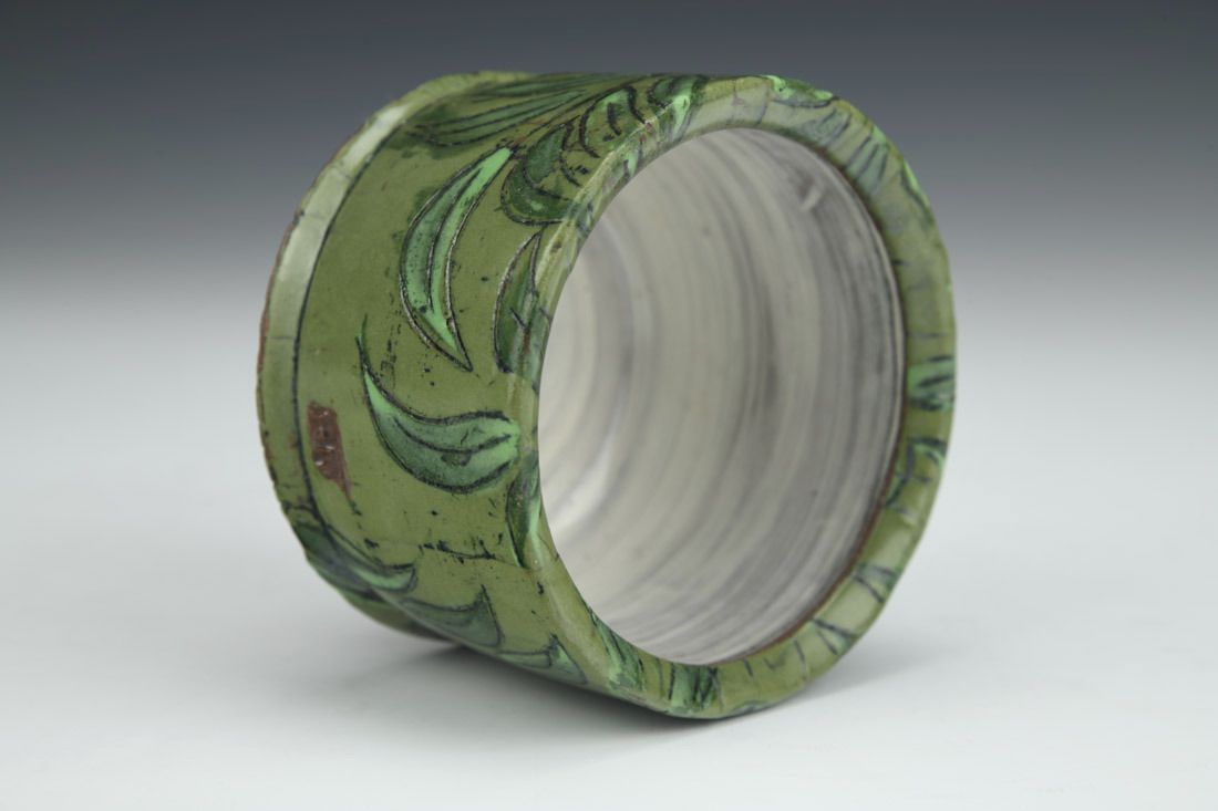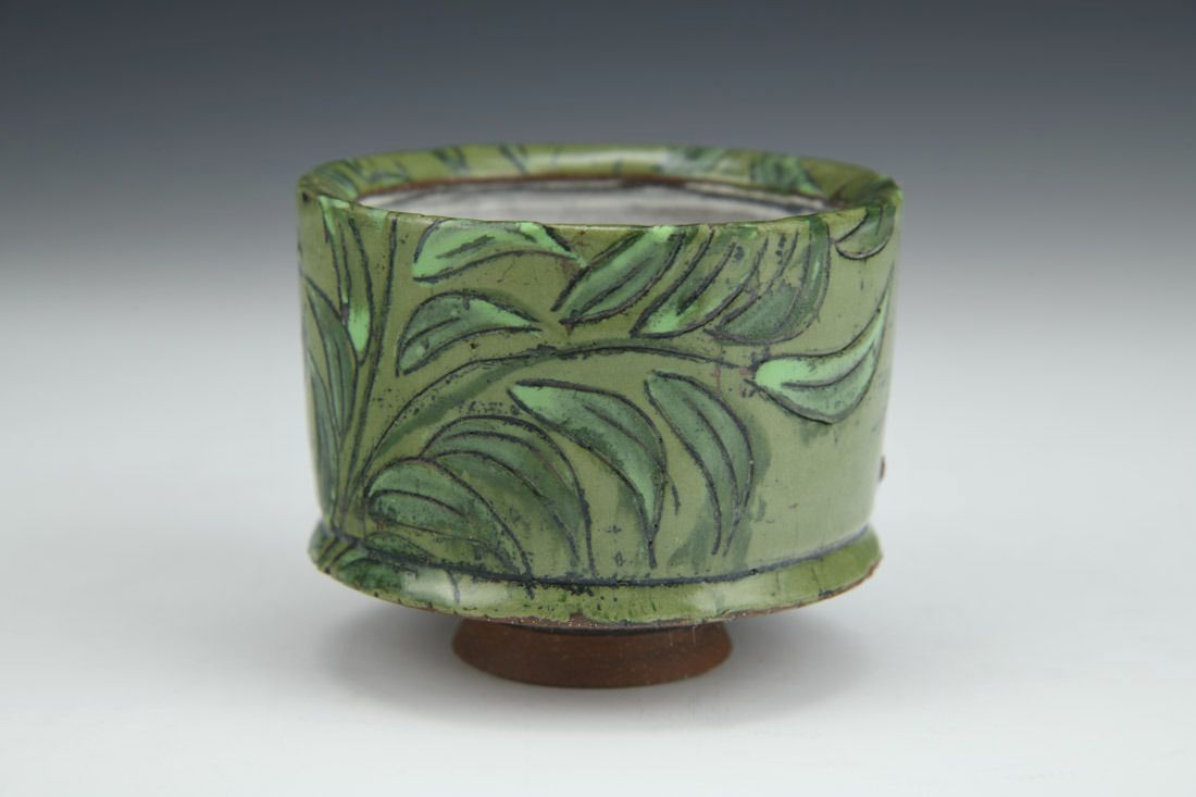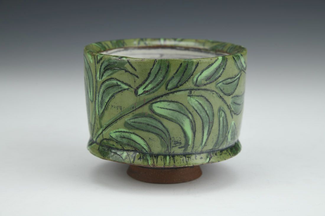 Earthenware, wheel thrown, hand painted newsprint transfers, carved and inlaid, porcelain slip, underglaze, cone 5 oxidation fired, 2.75 x 3 x 3 inches.