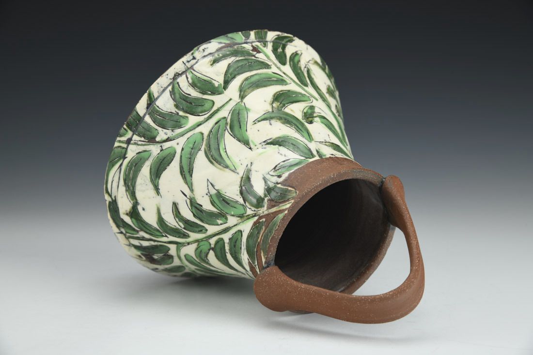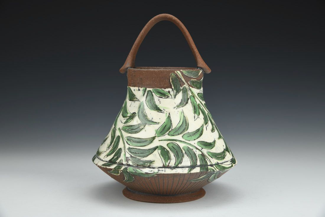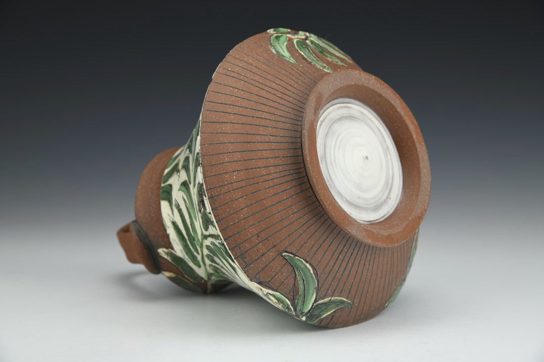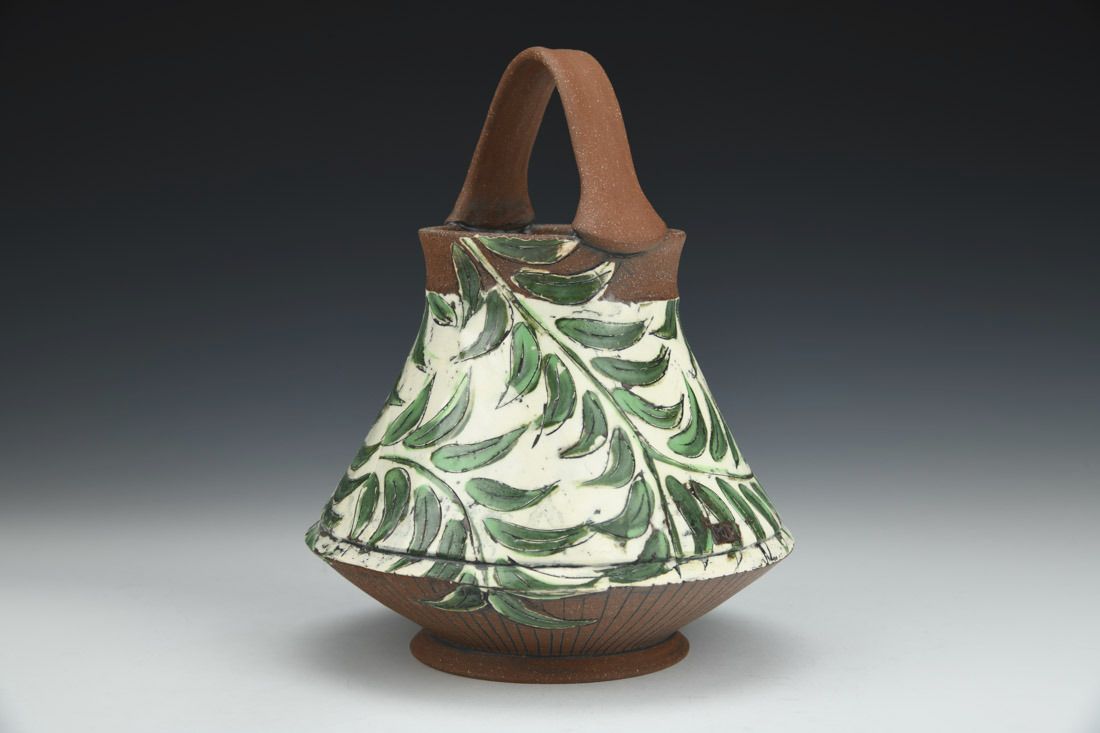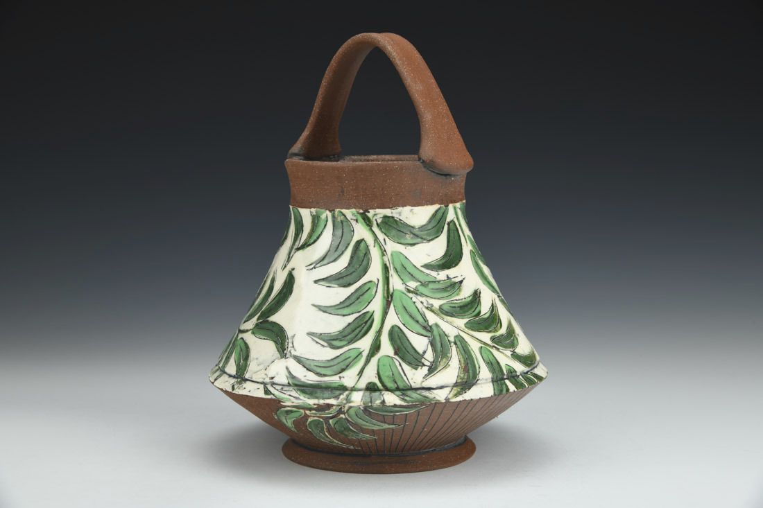 Earthenware, wheel thrown, hand painted newsprint transfers, carved and inlaid, porcelain slip, underglaze, cone 5 oxidation fired, 7.5 x 6 x 6 inches.