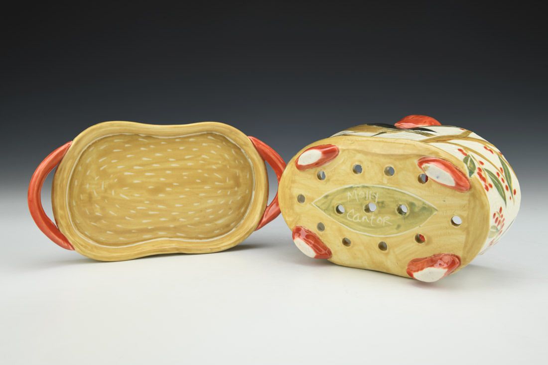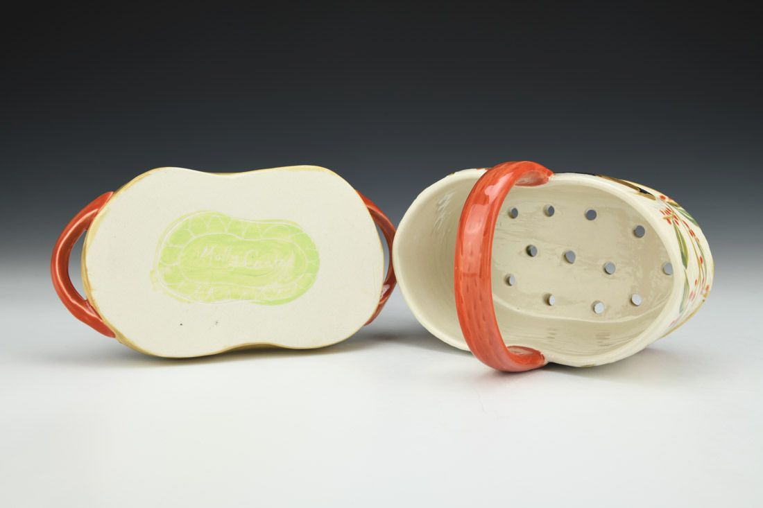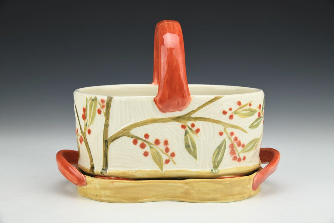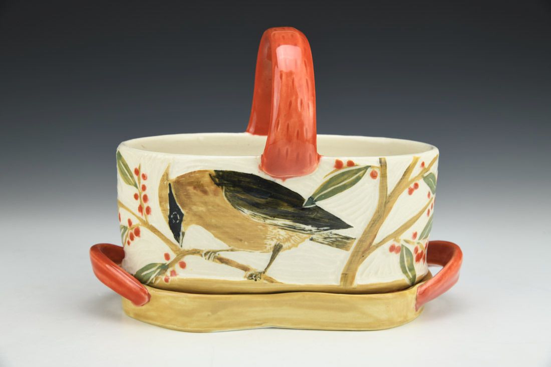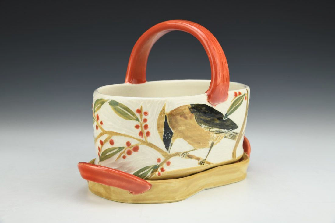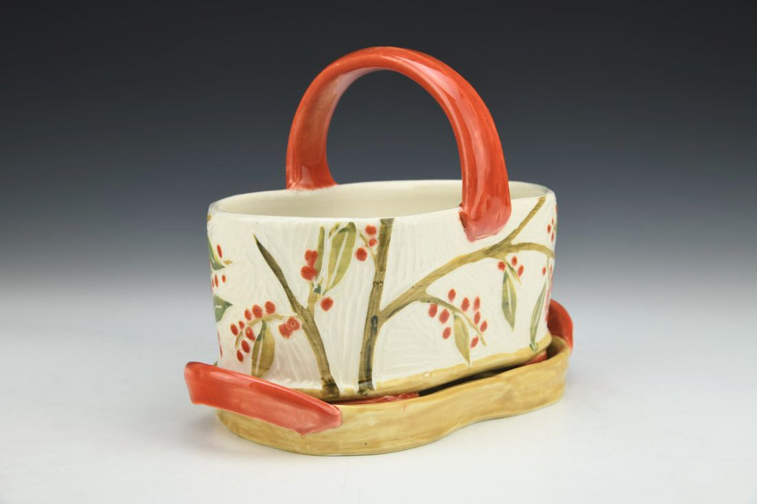 Porcelain, wheel thrown, altered and hand built, painted, sgraffito, slips, underglaze, glazes, electric fired, 6.5 x 6 x 5 inches.