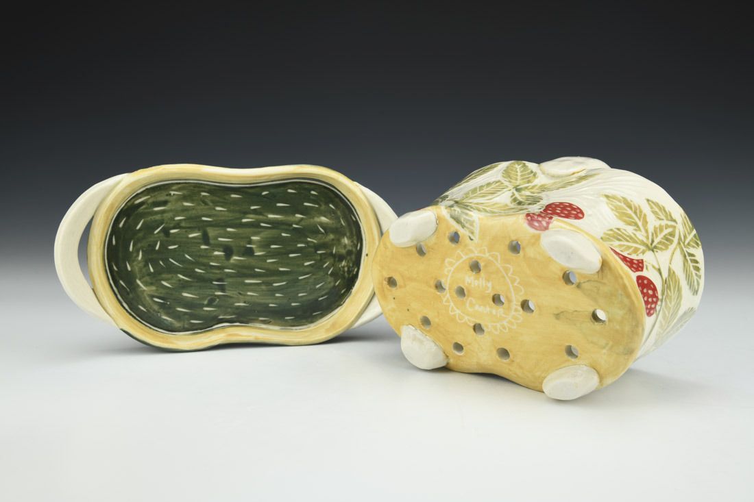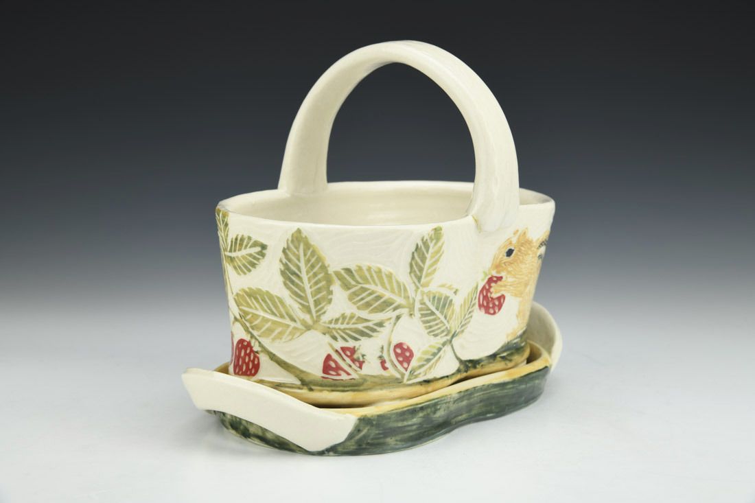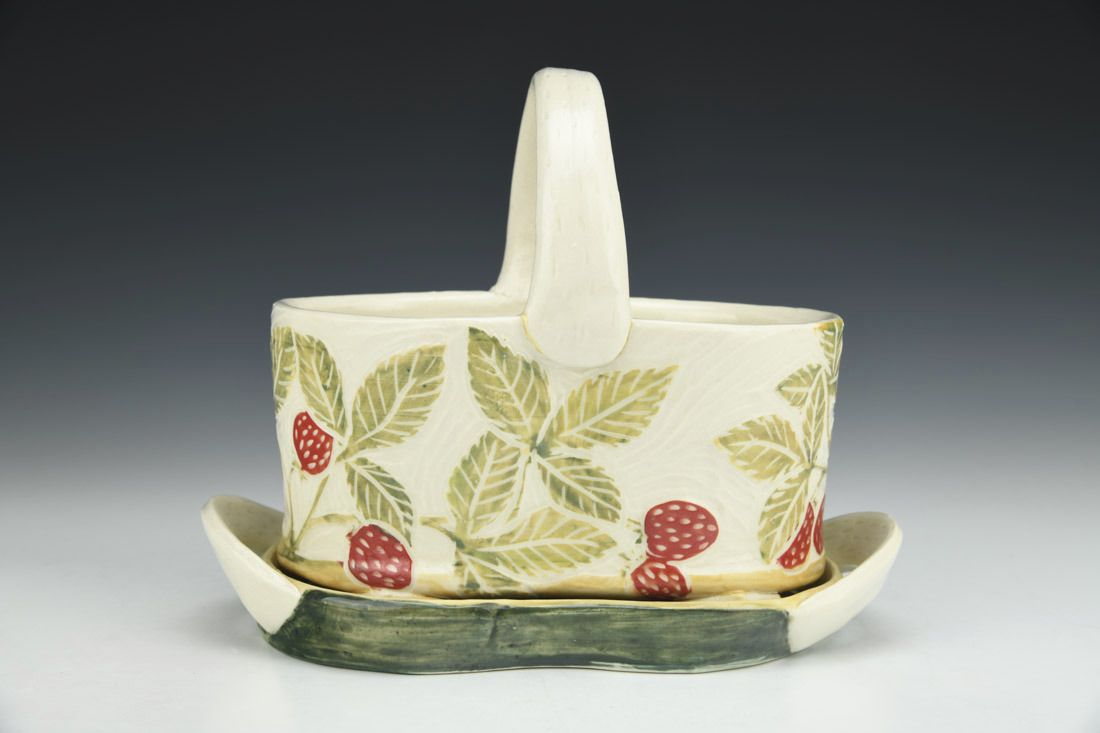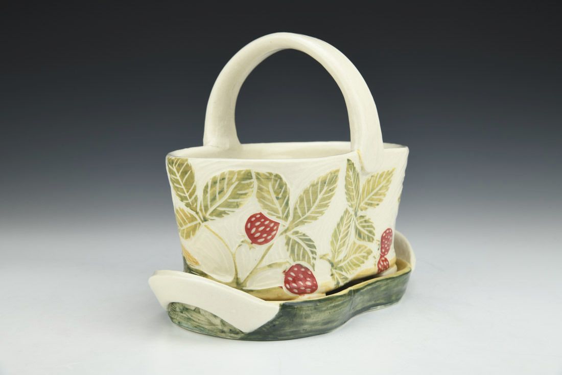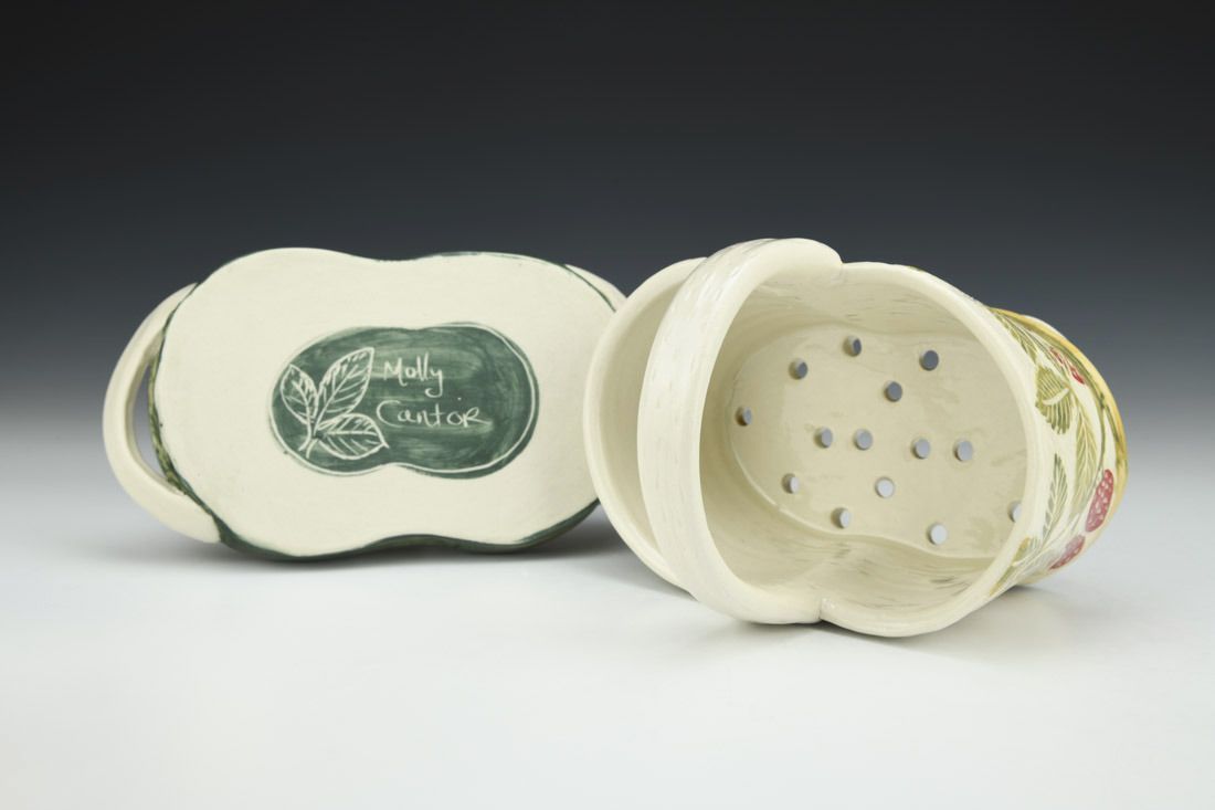 Porcelain, wheel thrown, altered and hand built, painted, sgraffito, slips, underglaze, glazes, electric fired, 6.5 x 6 x 5 inches.