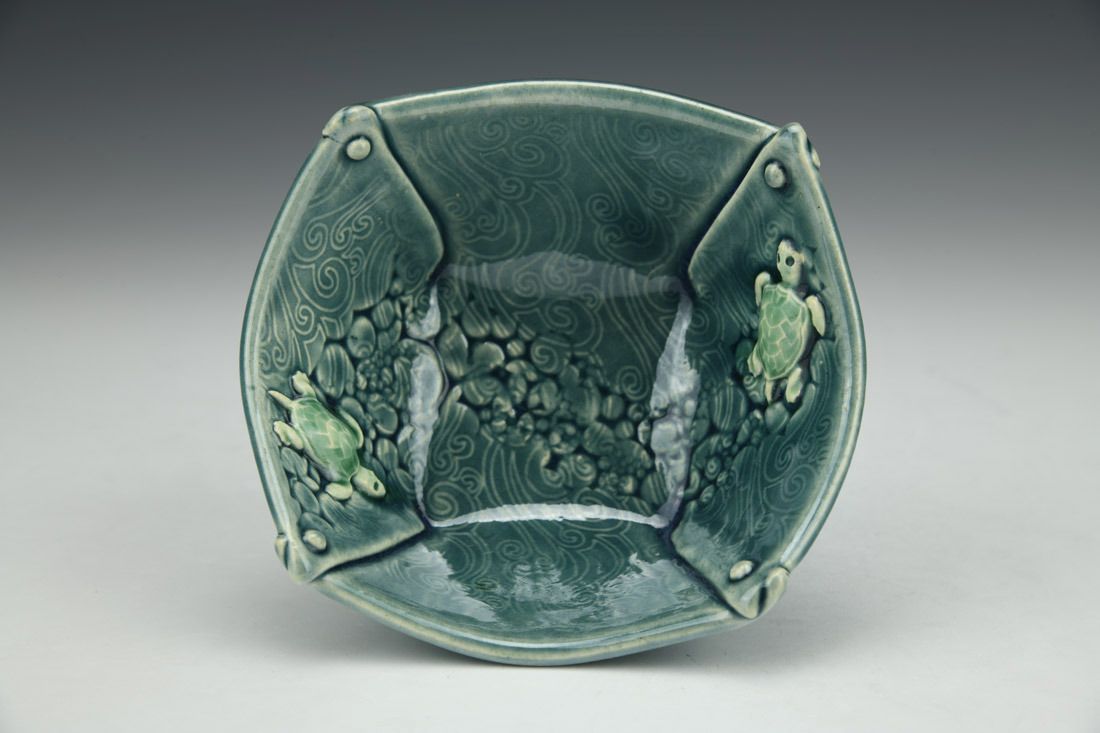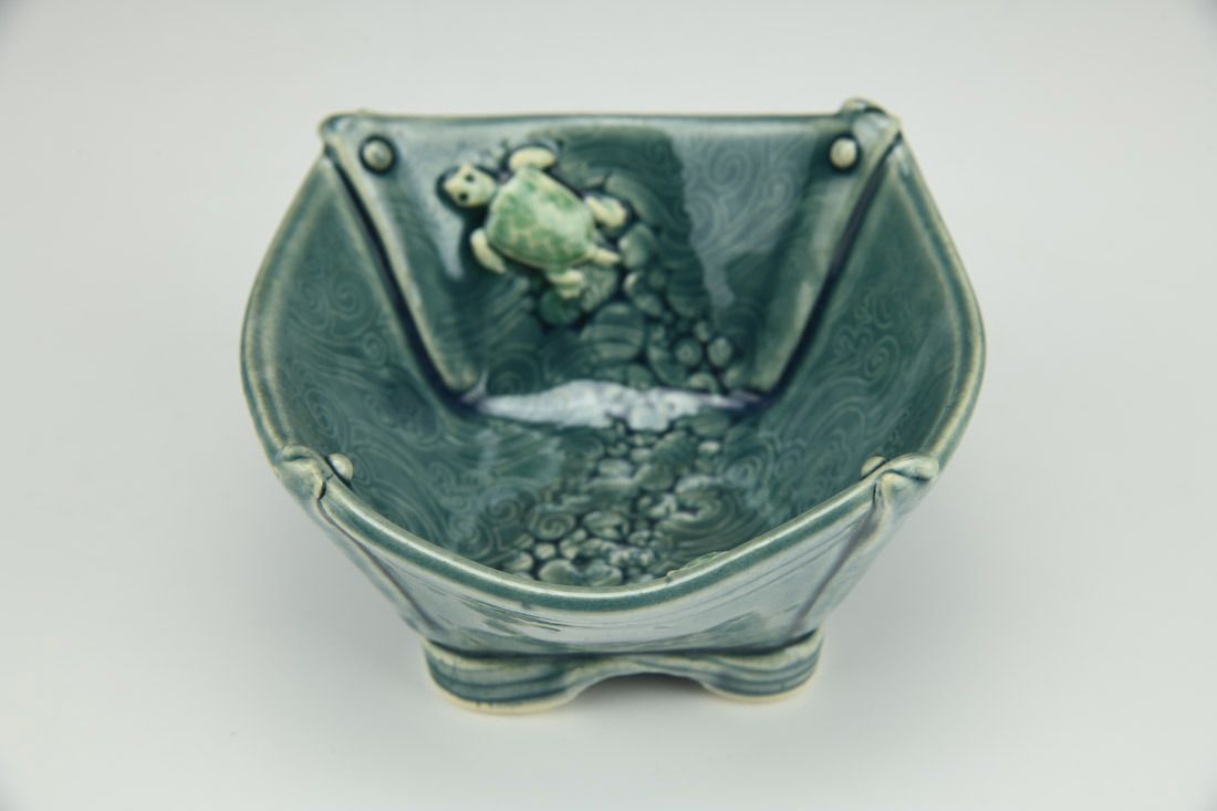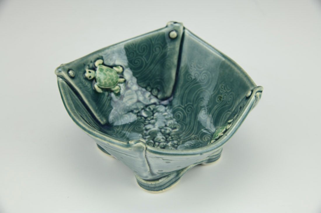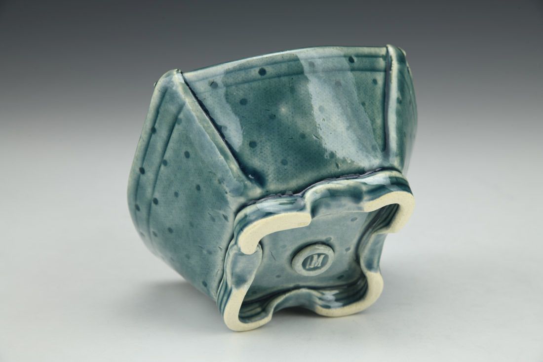 Stoneware, hand built with slabs, textured, transparent colored glaze, cone 6 oxidation fired, 2.5 x 4.5 x 4.25 inches.