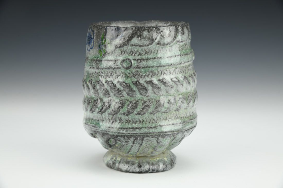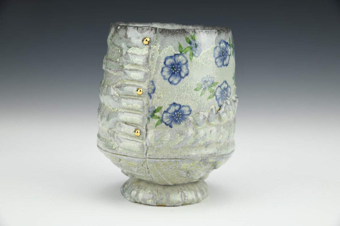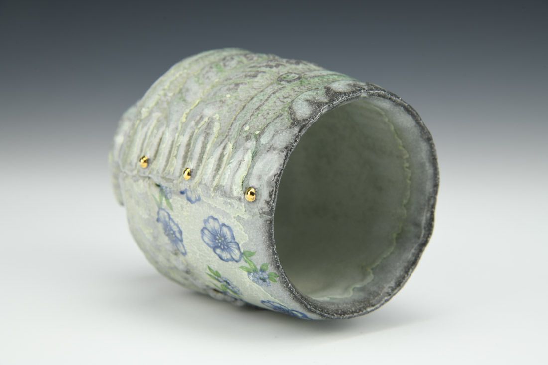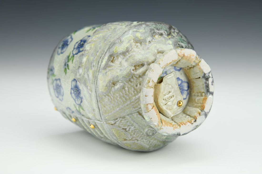 White stoneware, hand built, decal, luster, cone 10 soda fired, 4 x 3.25 x 3.25 inches.