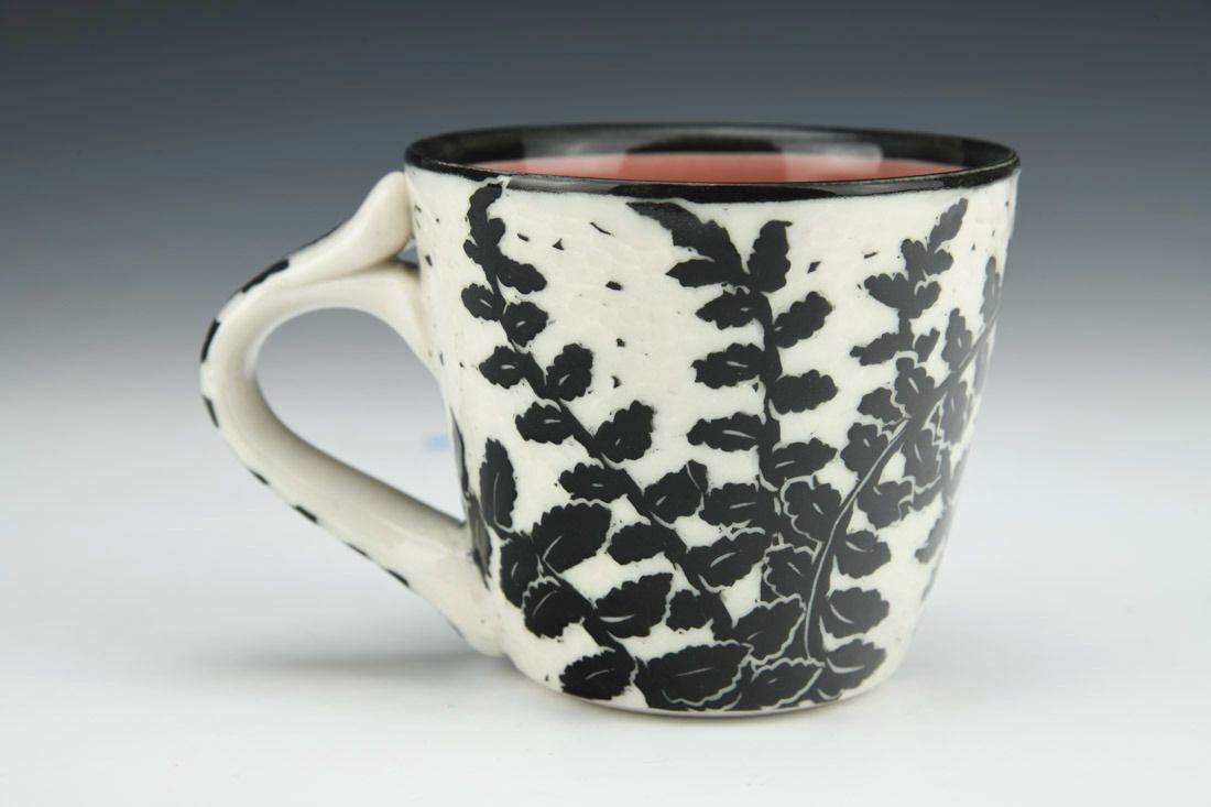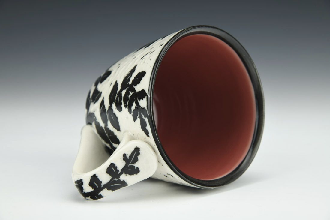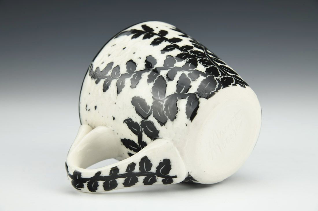 Porcelain, wheel thrown, sgraffito, underglaze, cone 5 oxidation fired, 3.25 x 4.75 x 3.5 inches.