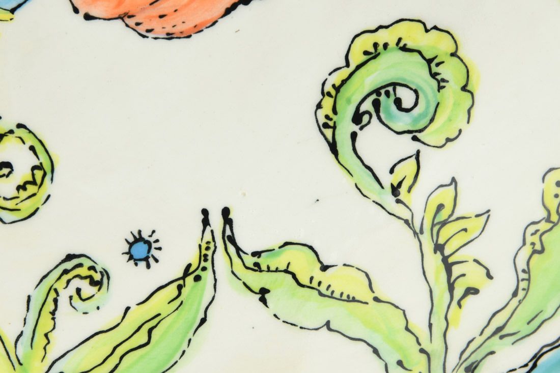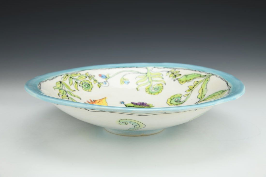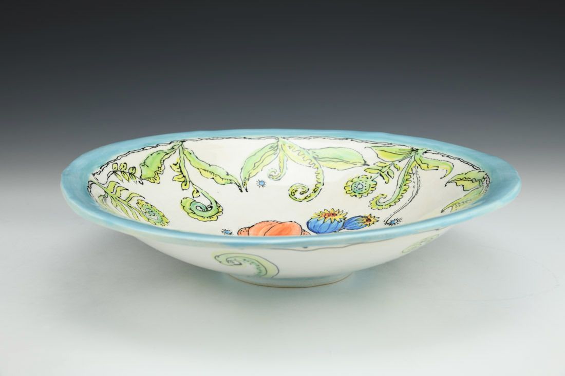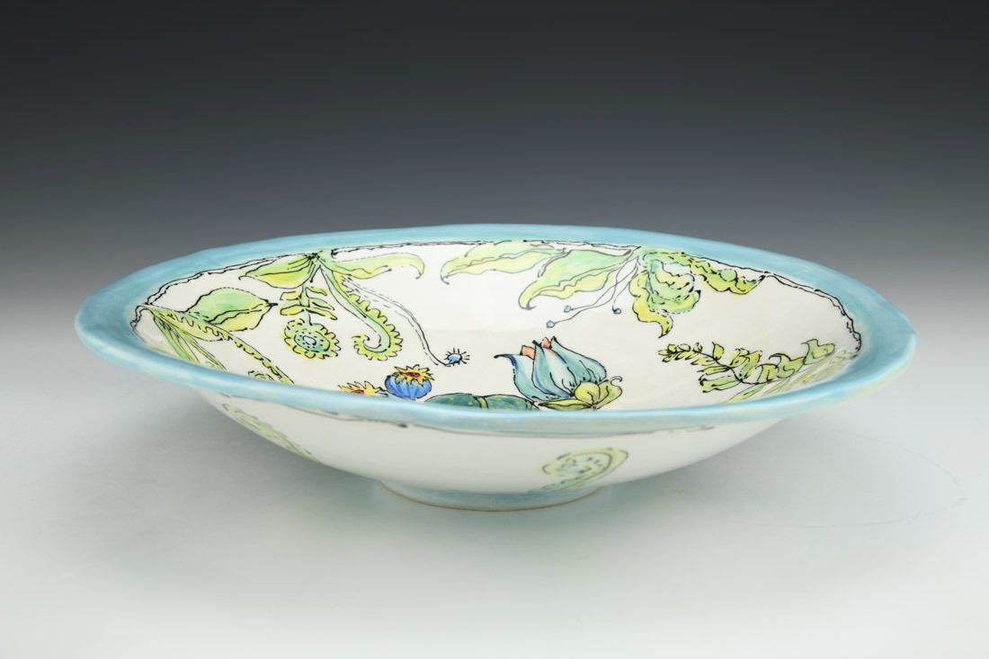 White Bear clay, hand built, painted, cone 6 oxidation fired, 2.75 x 12 x 12 inches.