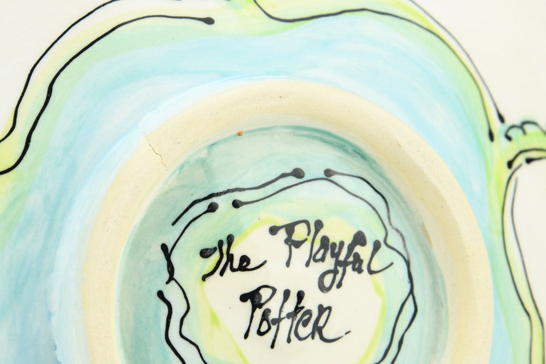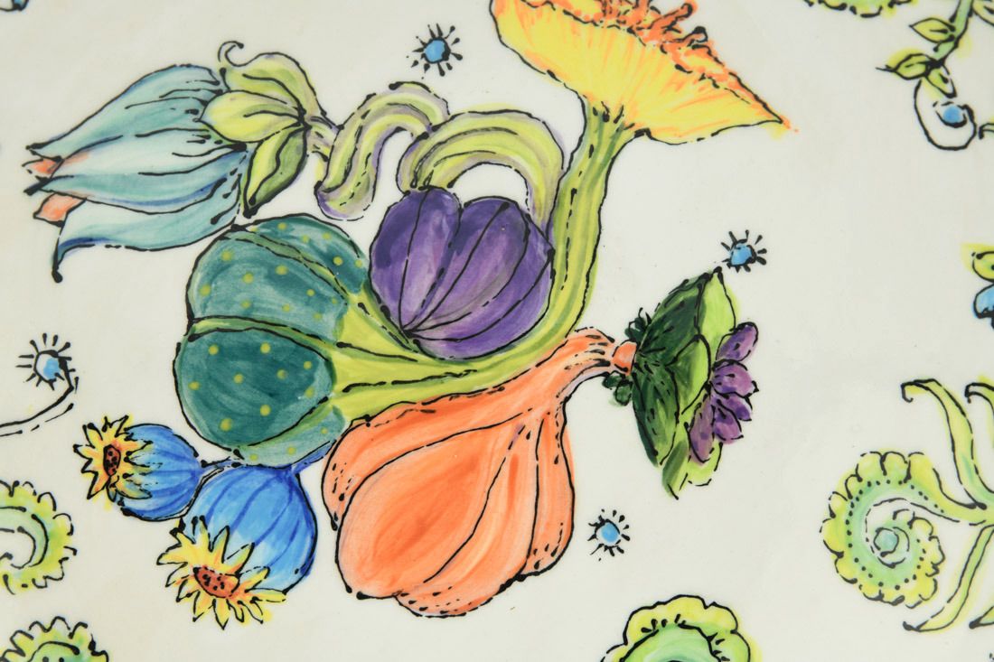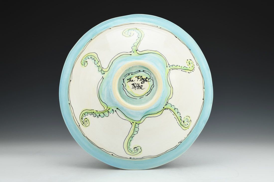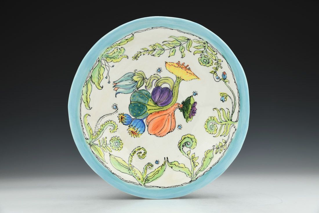 White Bear clay, hand built, painted, cone 6 oxidation fired, 2.75 x 12 x 12 inches.