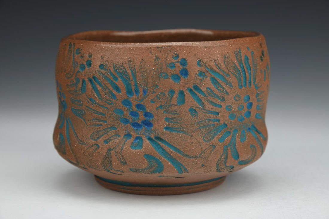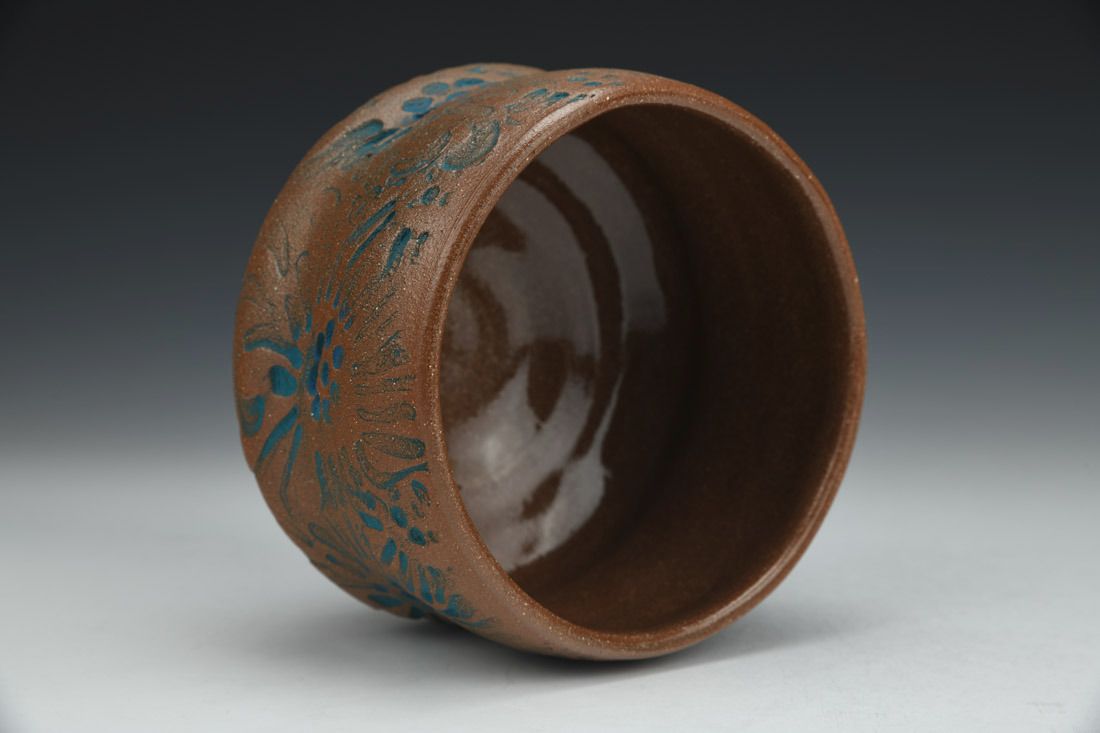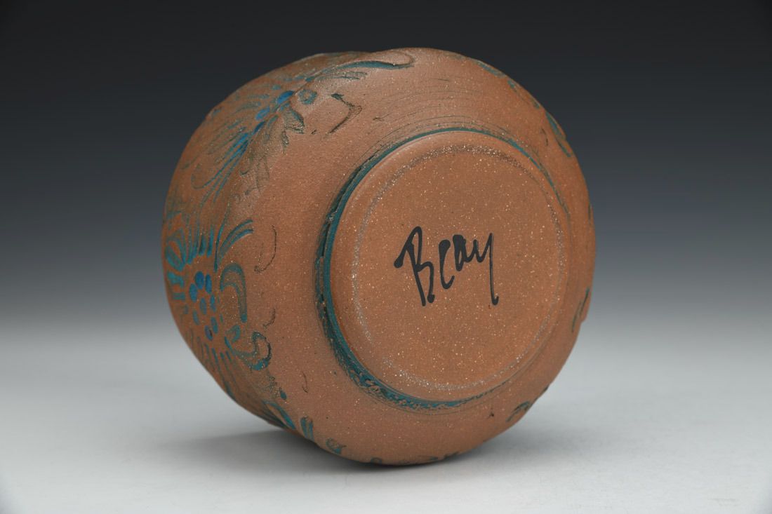 Terra cotta, wheel thrown and altered, stamped, slip, underglaze, glaze, 3.25 x 4.75 x 4.75 inches.