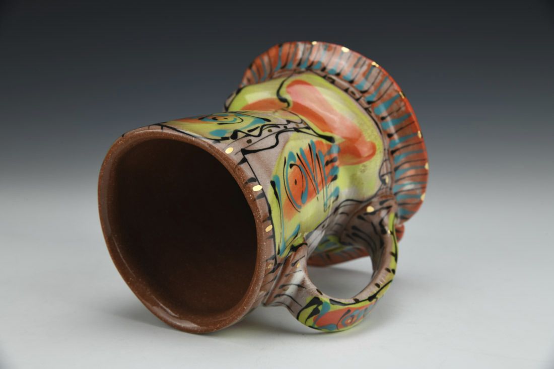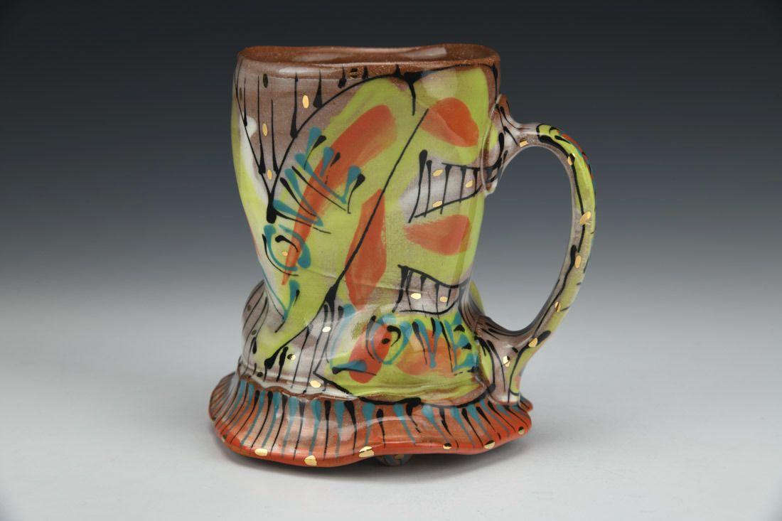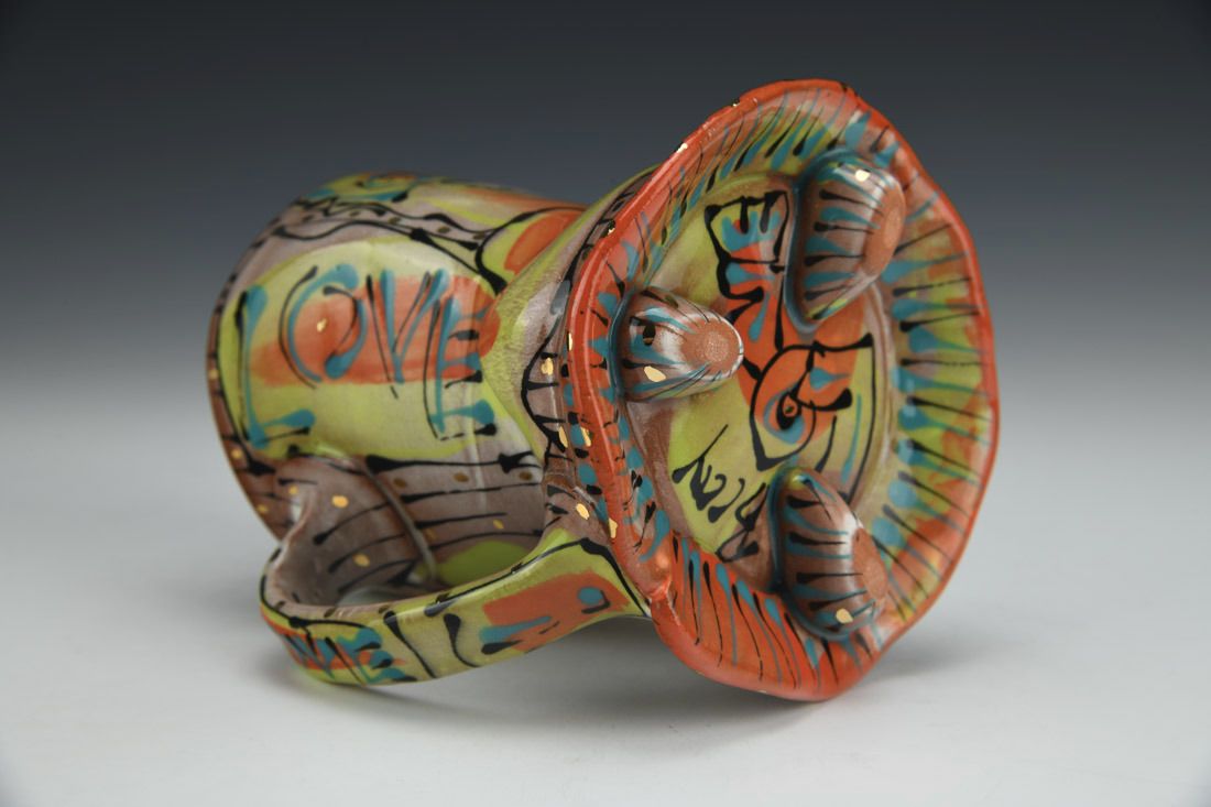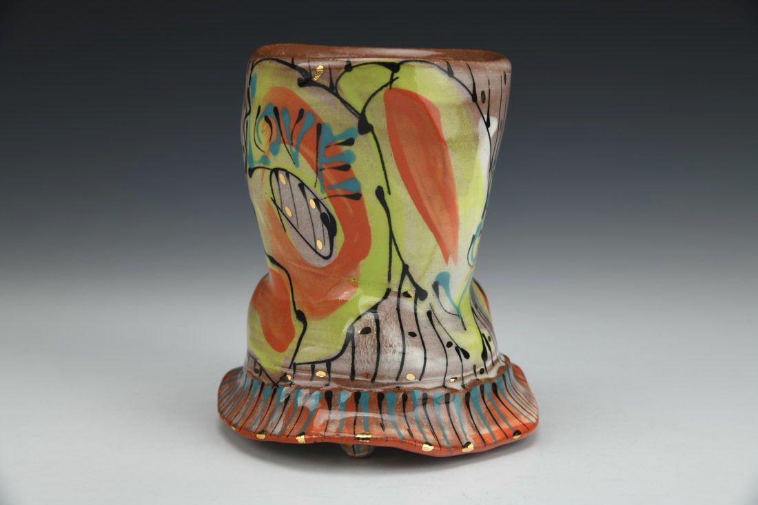 Terra cotta, wheel thrown, altered and hand built, slip, underglaze, glaze, gold luster, cone 1 electric fired, 5 x 5 x 4.5 inches.