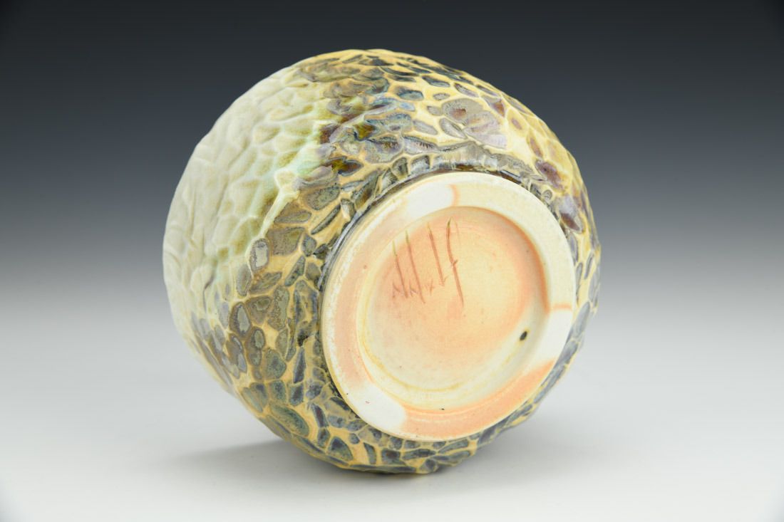 Porcelain, wheel thrown and altered, glaze, woodfired in soda kiln, 3 x 4.5 x 4.5 inches.