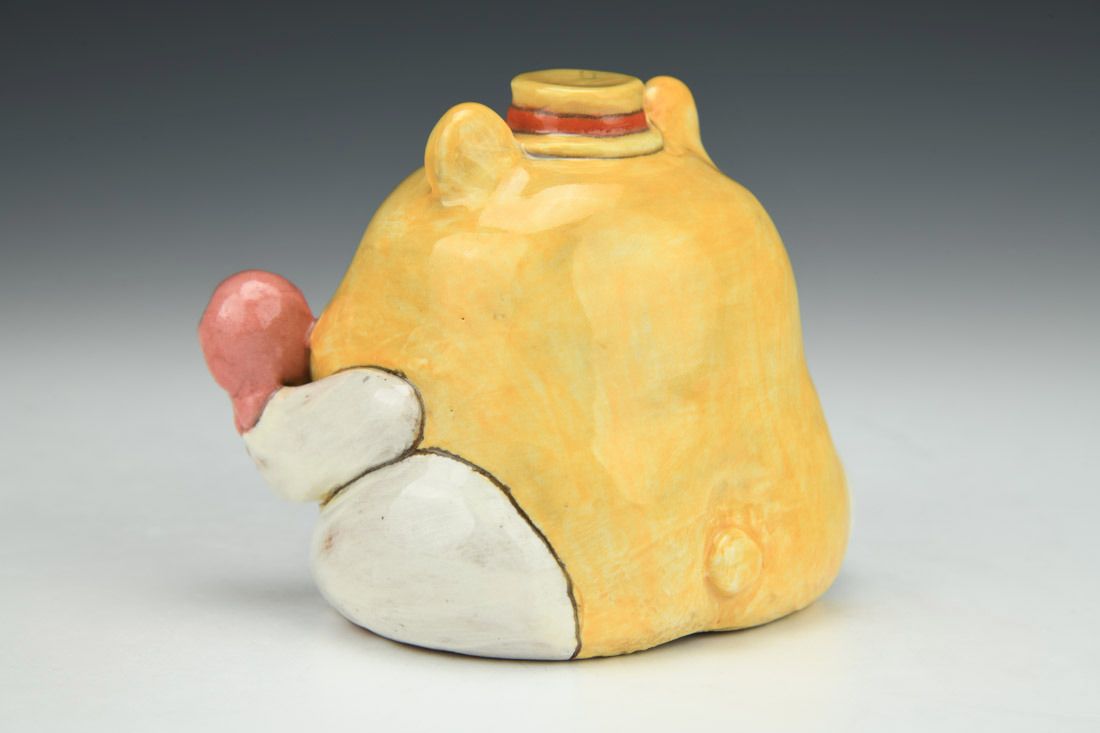 Red stoneware, wheel thrown and altered with sculpted elements, painted, sgraffito, white porcelain slip, underglaze, glaze, cone 5 electric fired, 3.75 x 4.25 x 4 inches.