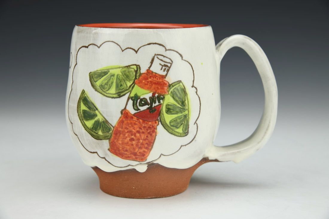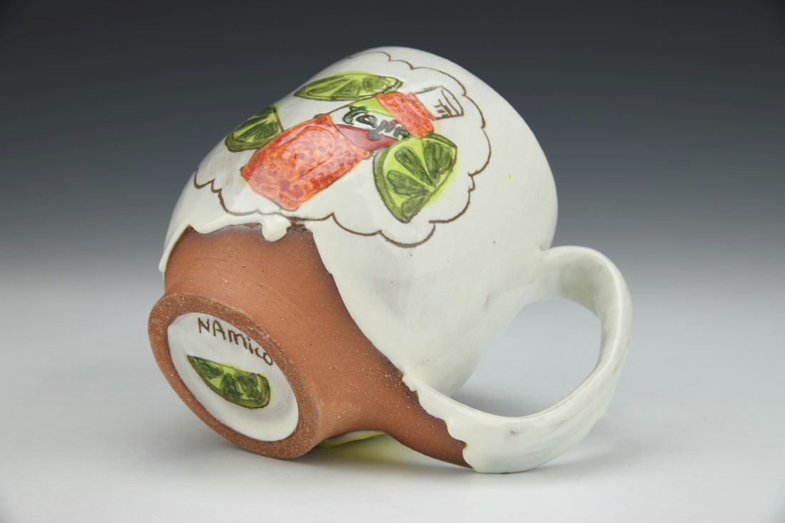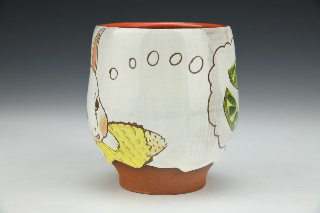 Red stoneware, wheel thrown, painted, sgraffito, white porcelain slip, underglaze, glaze, cone 5 electric fired, 4.25 x 5.5 x 3.75 inches.
