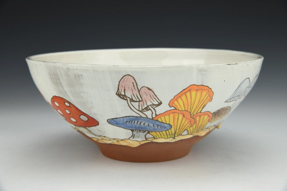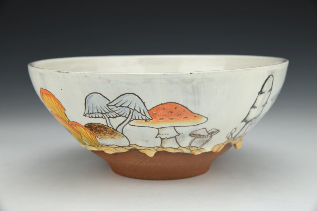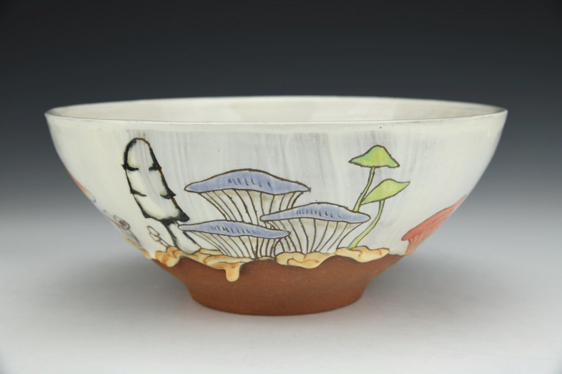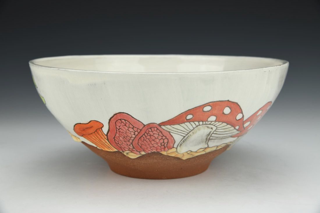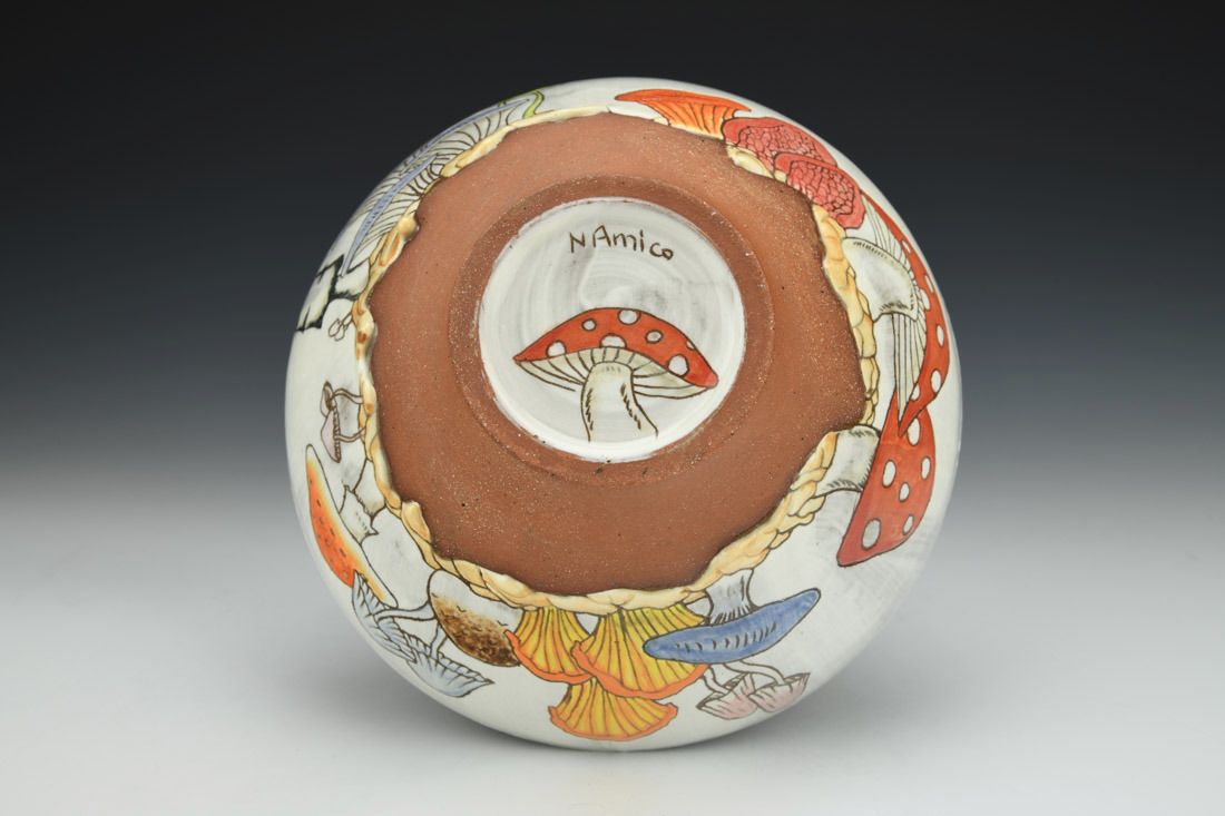 Red stoneware, wheel thrown, painted, sgraffito, white porcelain slip, underglaze, glaze, cone 5 electric fired, 3.75 x 8.5 x 8.25 inches.