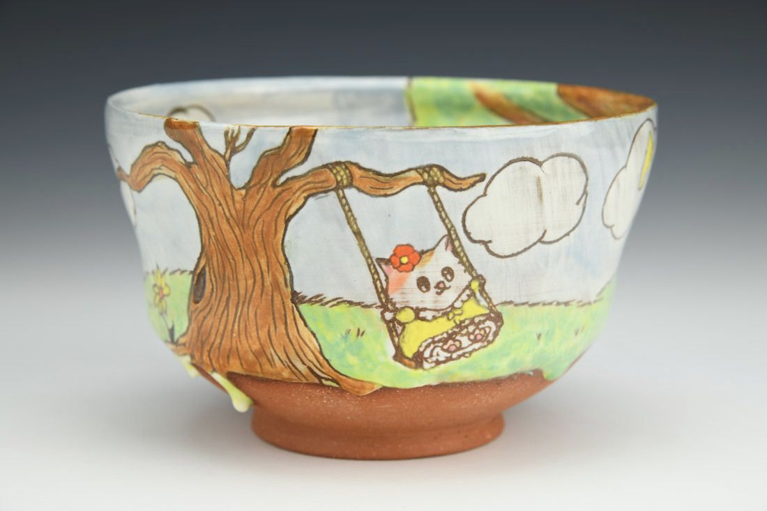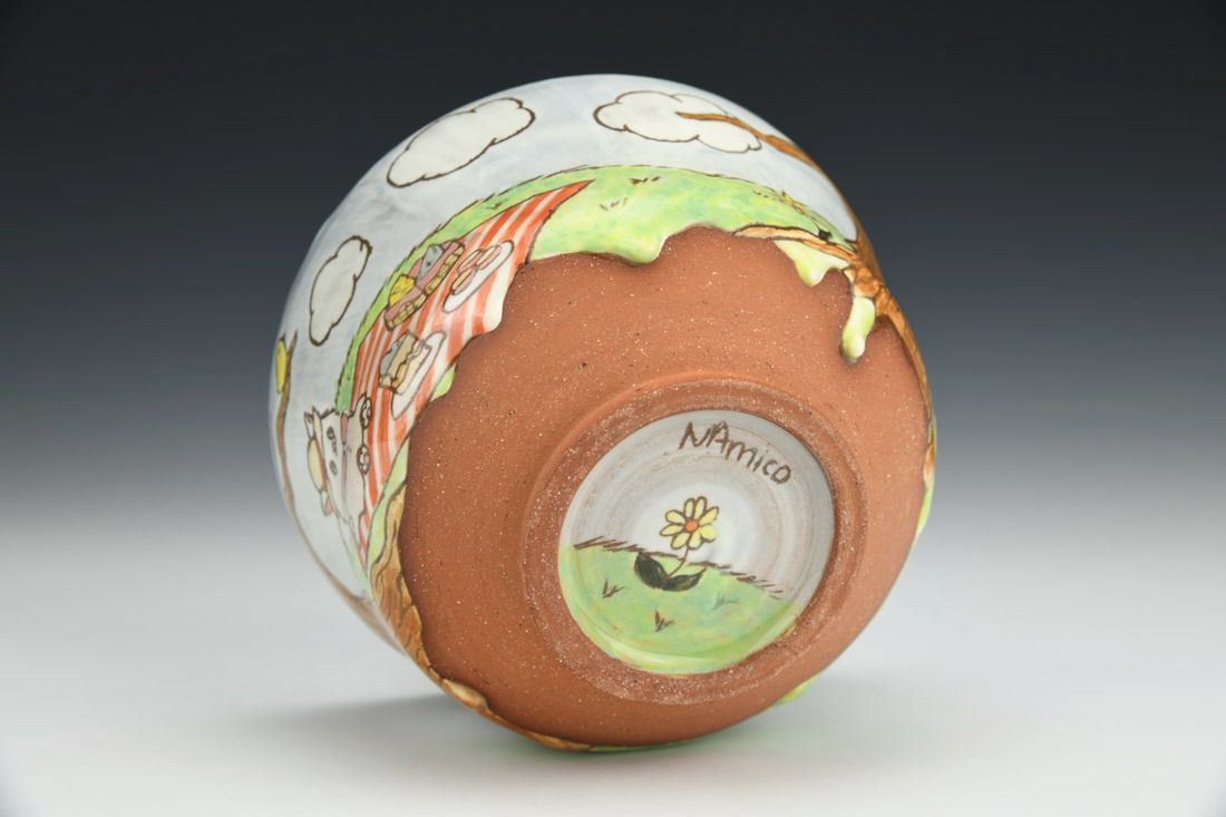 Red stoneware, white porcelain slip, wheel thrown, sgraffito, underglaze painted, glaze, cone 5 fired, 3.25 x 5 x 5 inches.