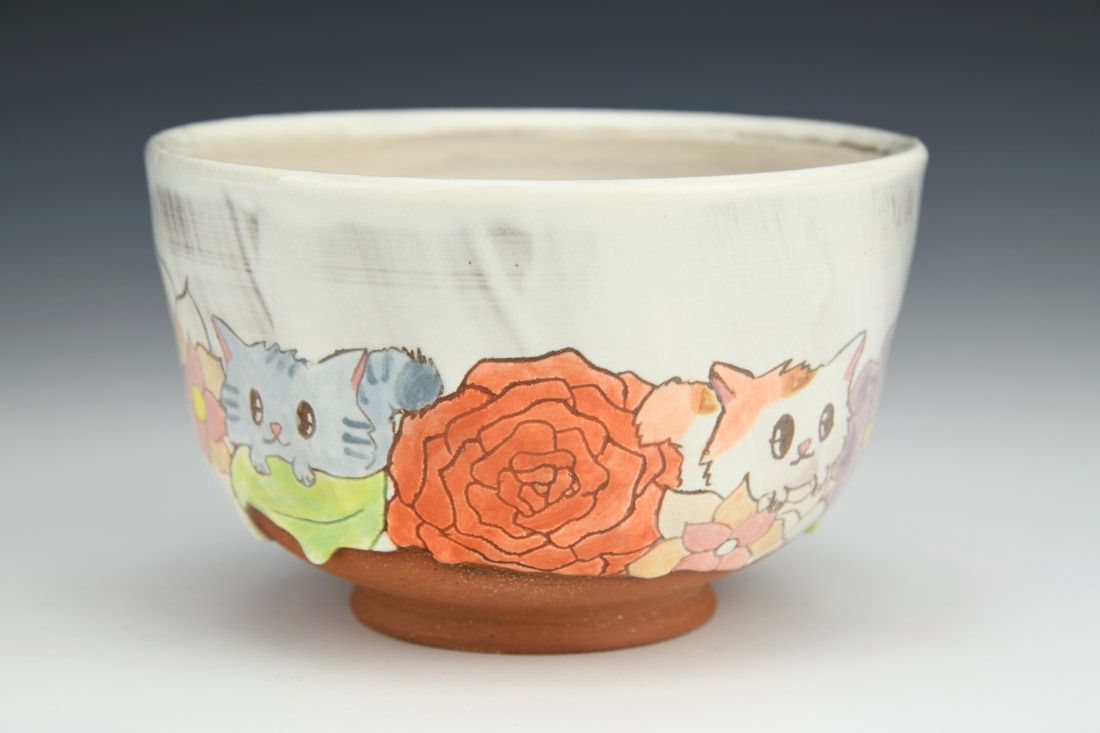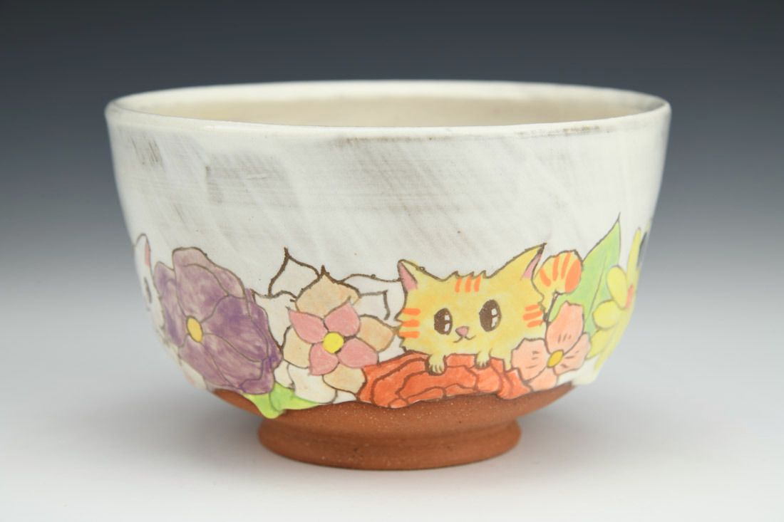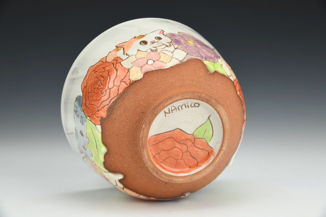 Red stoneware, white porcelain slip, wheel thrown, sgraffito, underglaze painted, glaze, cone 5 fired, 3 x 5 x 5 inches.
