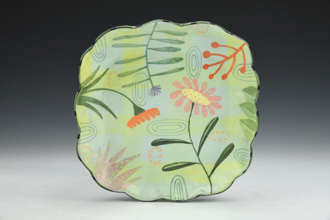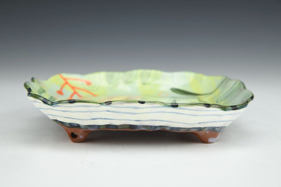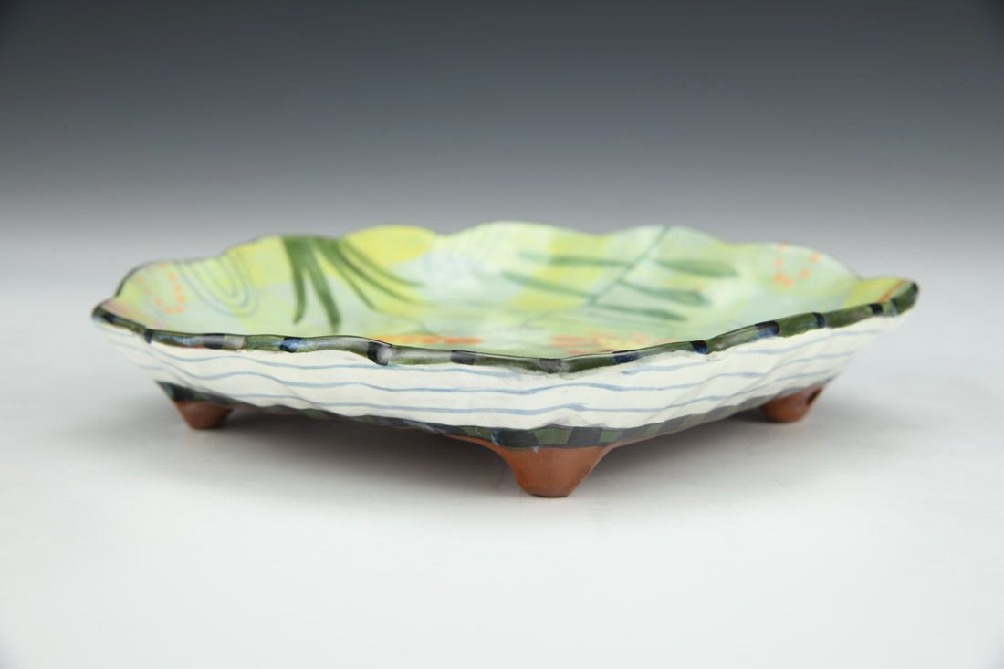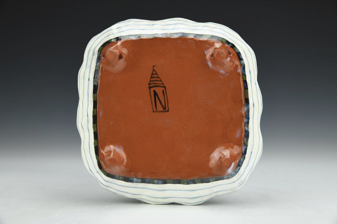 Red earthenware, hand built, underglaze, glaze, cone 05 electric fired, 6 x 6 x 1.25 inches.