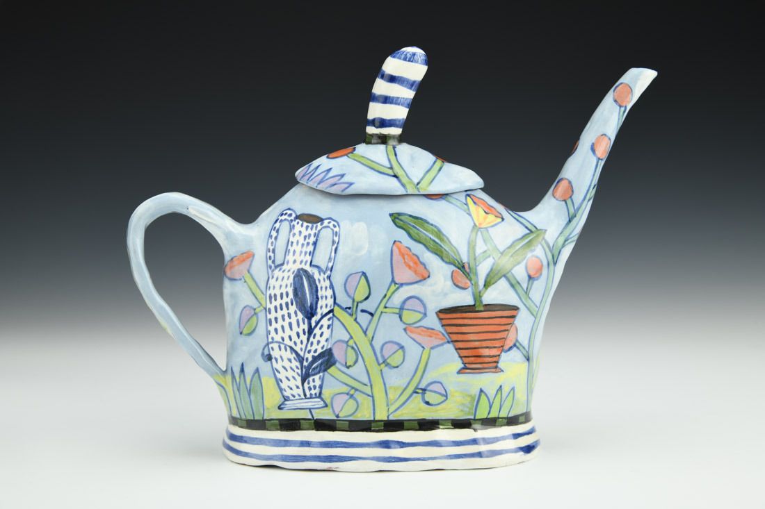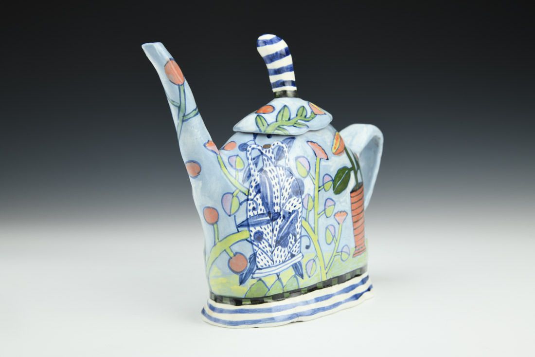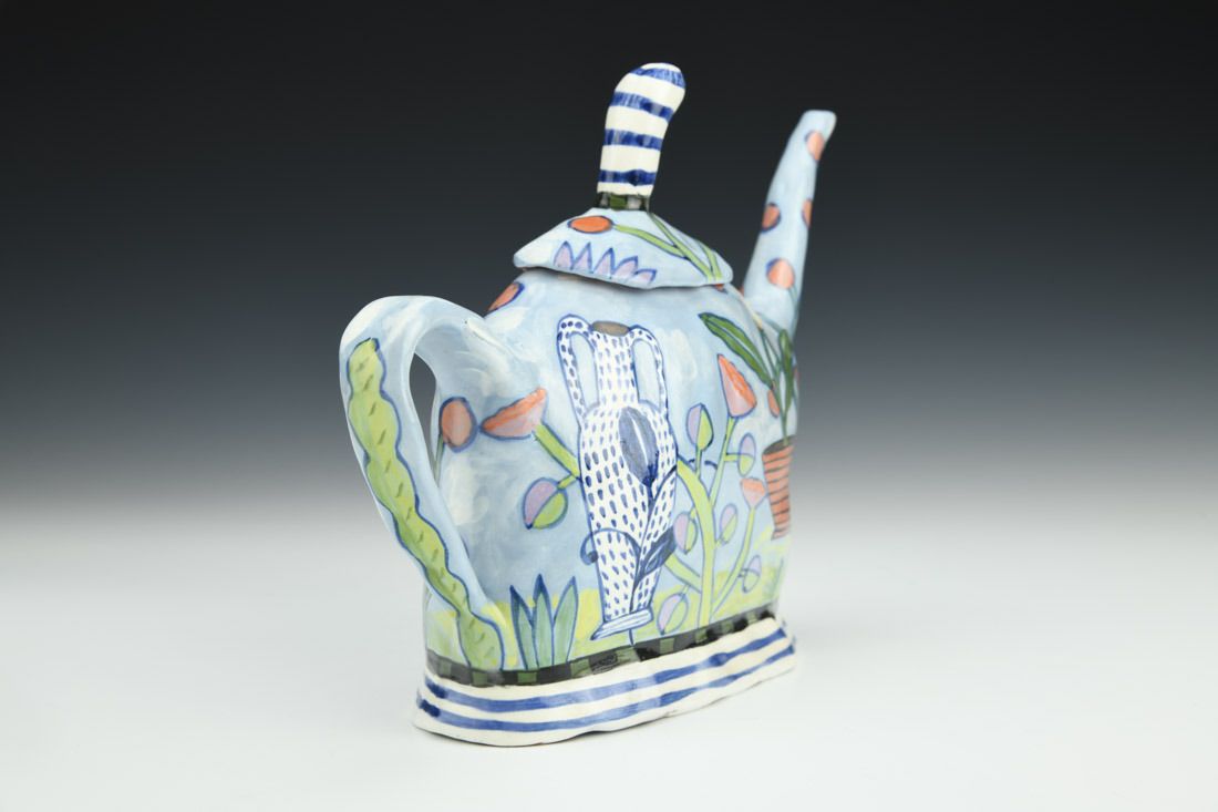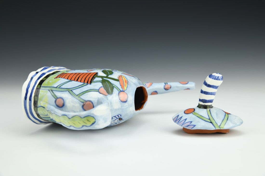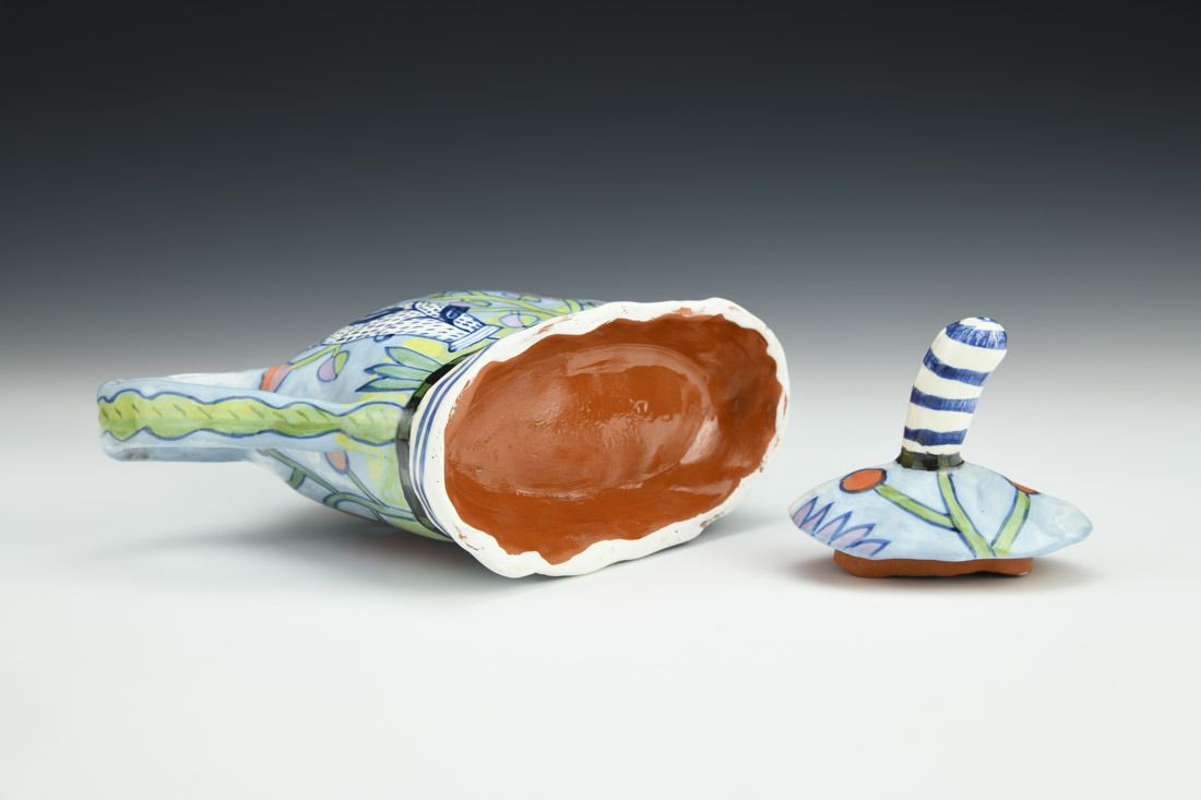 Red earthenware, hand built, underglaze, glaze, cone 04 fired, 6 x 8.5 x 2.5 inches.