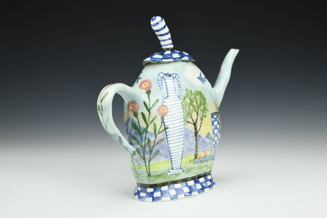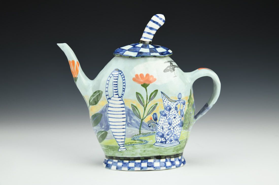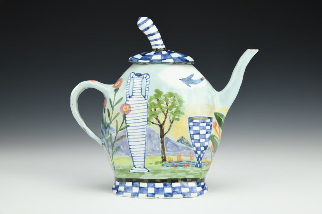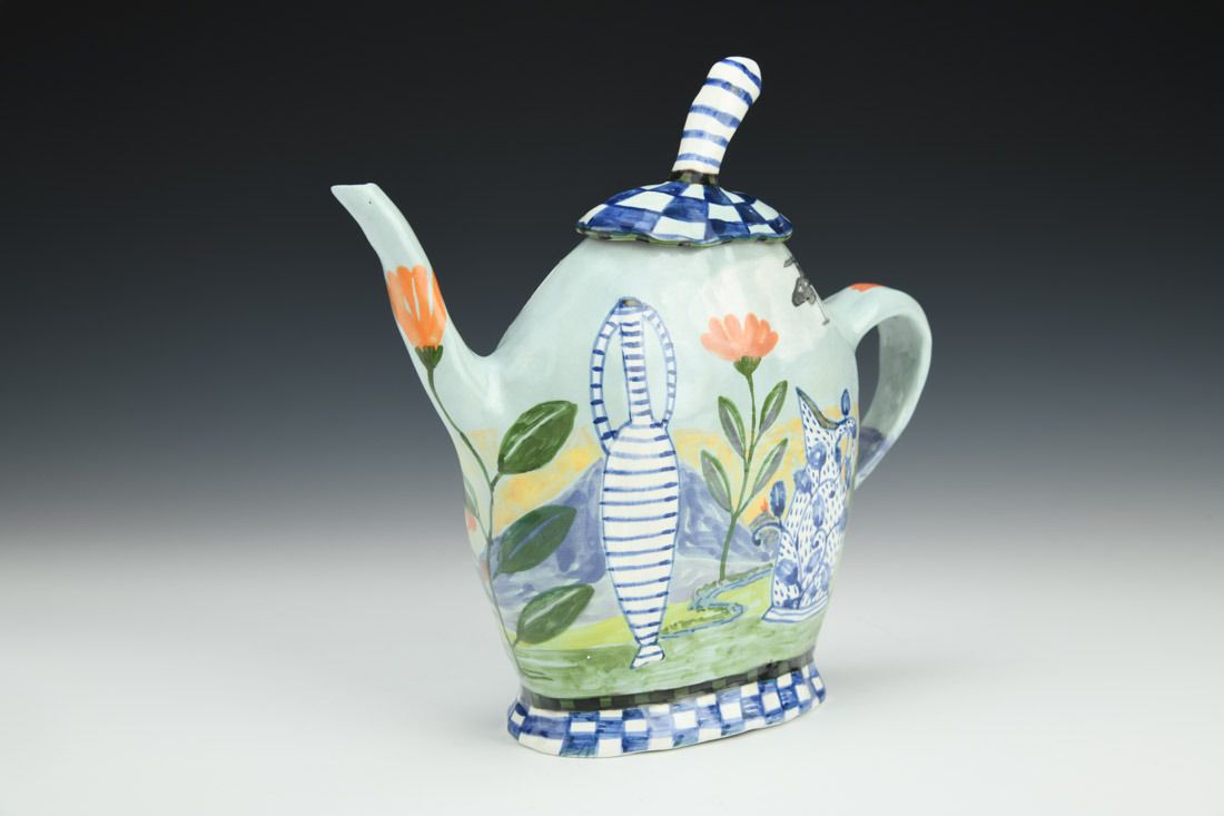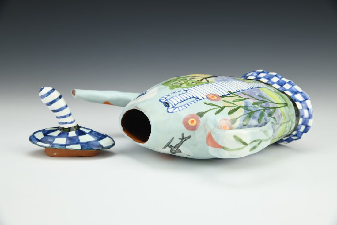 Red earthenware, hand built, underglaze, glaze, cone 04 fired, 7.5 x 8 x 2.5 inches.