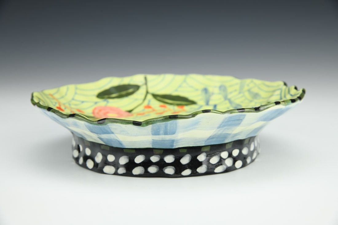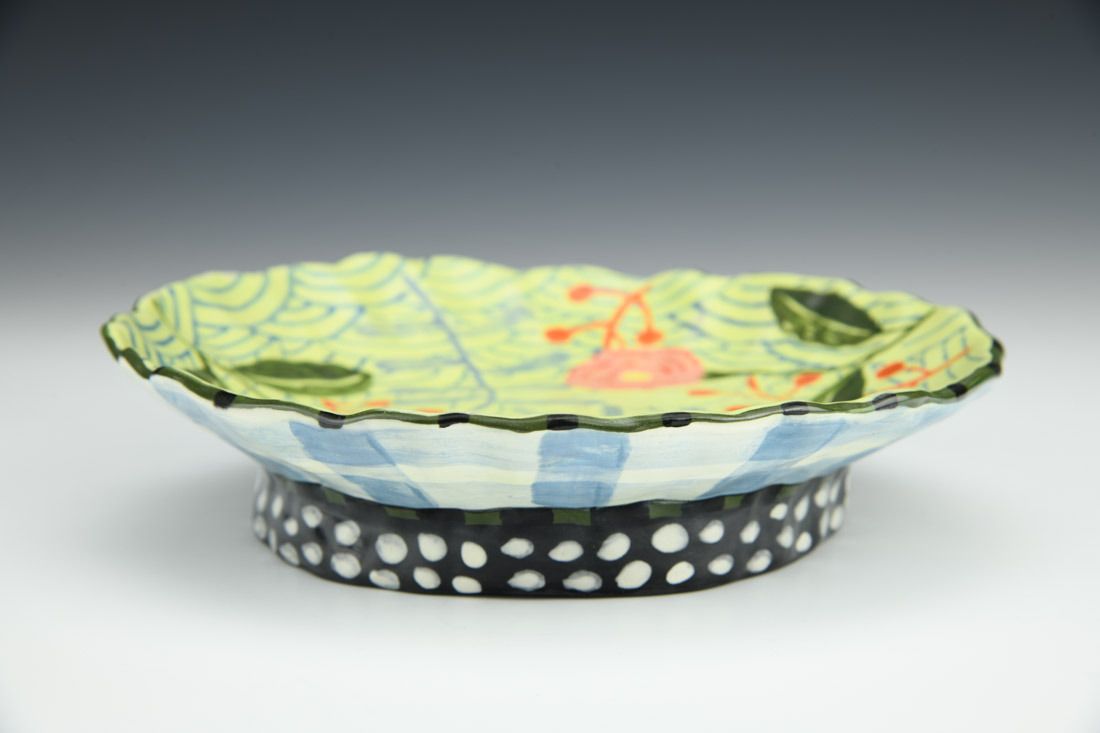 Red earthenware, hand built, underglaze, glaze, cone 04 fired, 1.5 x 6.75 x 6.75 inches.