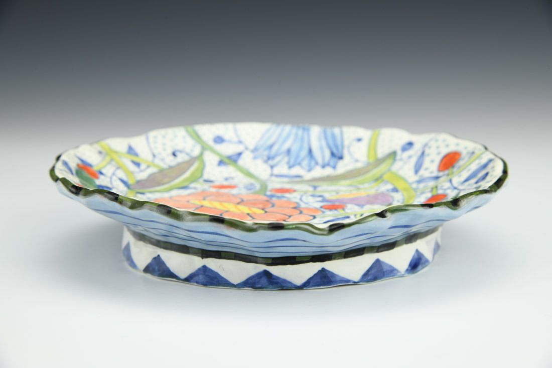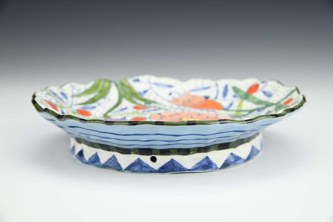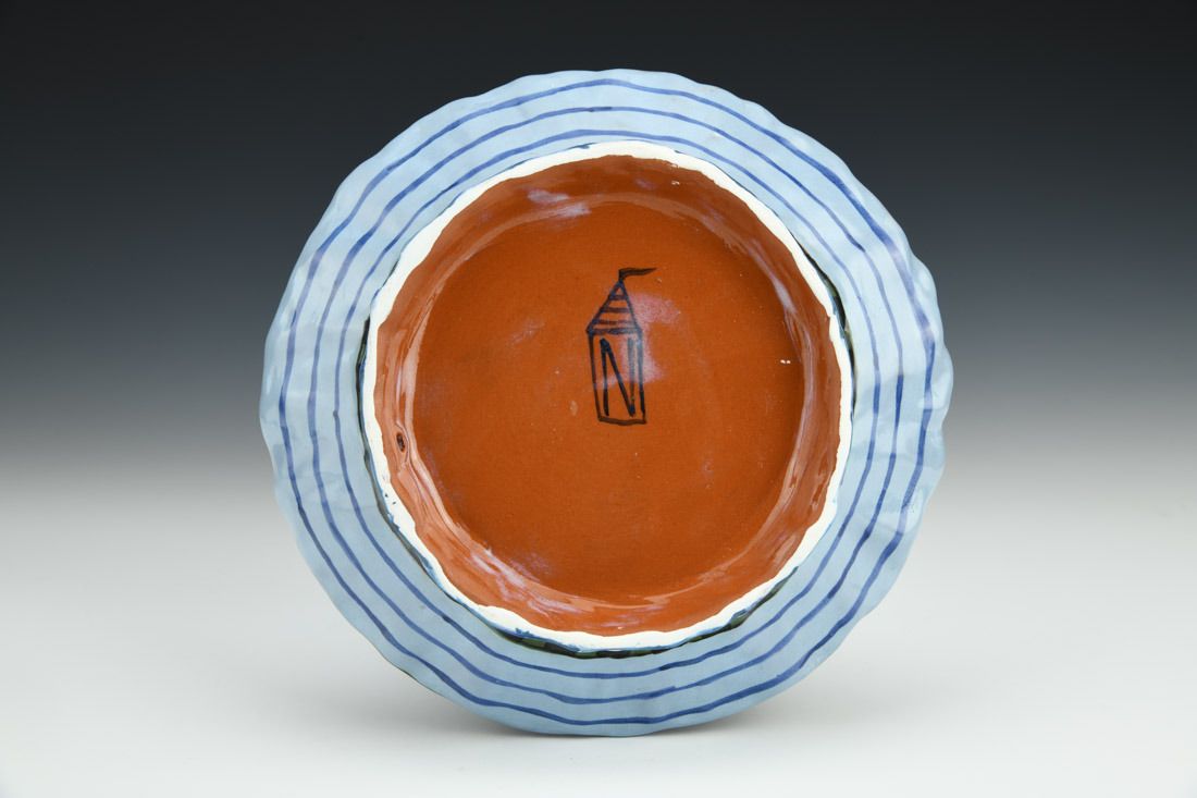 Red earthenware, hand built, underglaze, glaze, cone 04 fired, 1.5 x 6.75 x 6.75 inches.