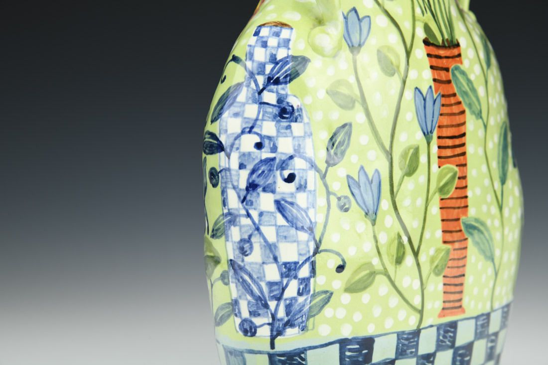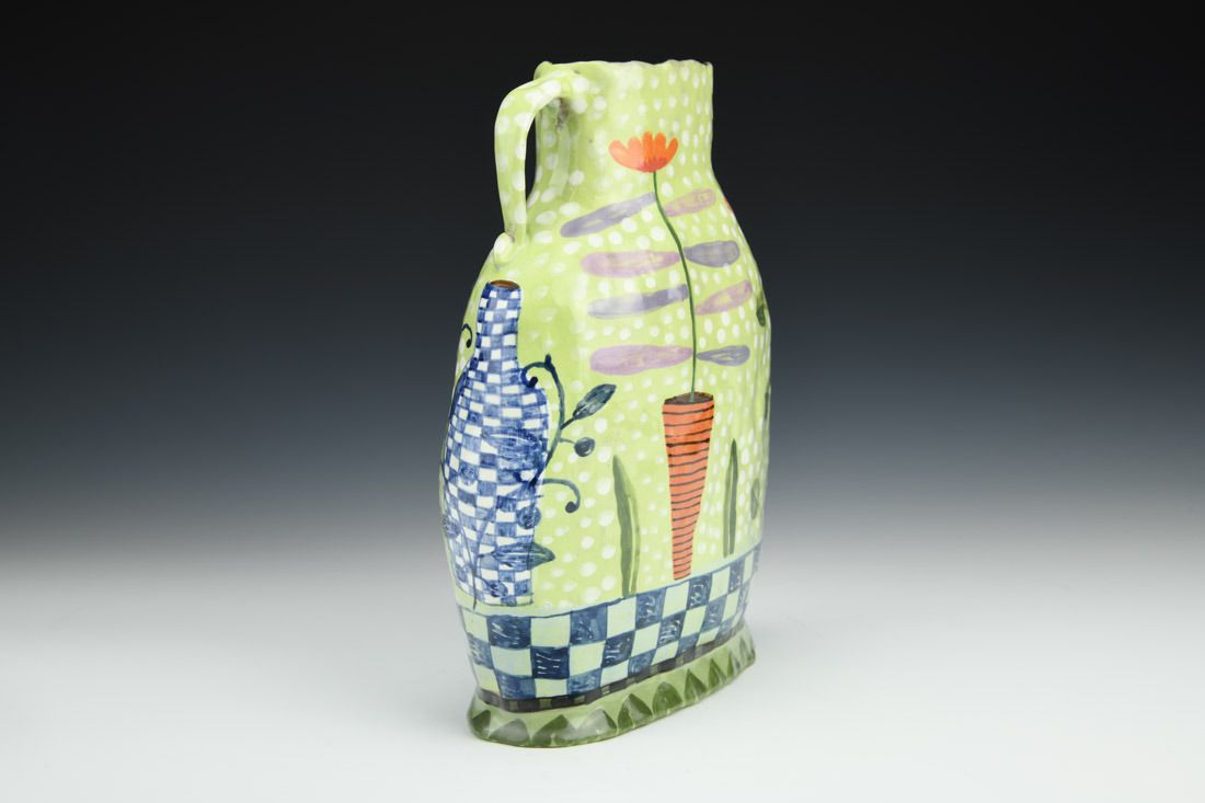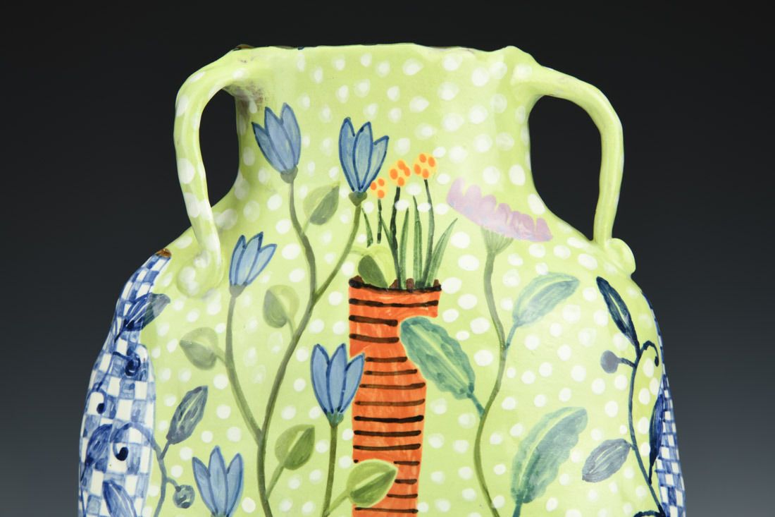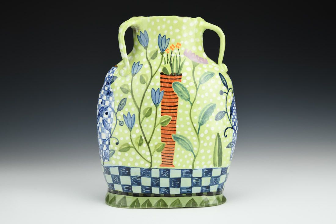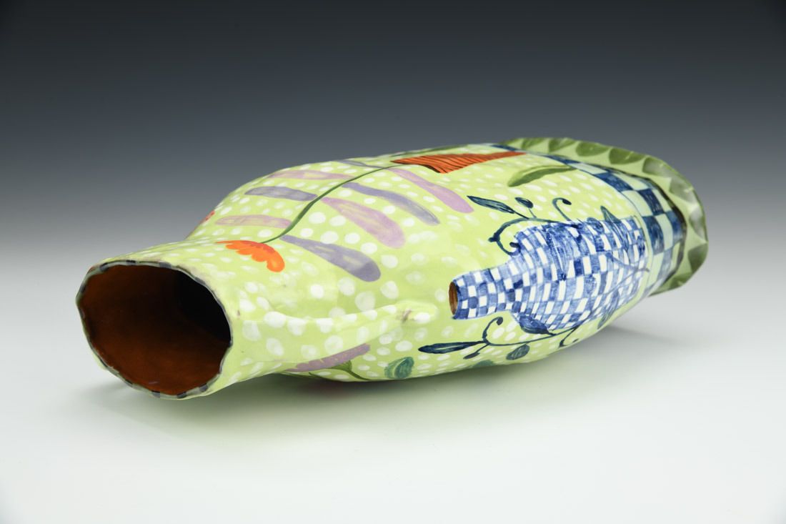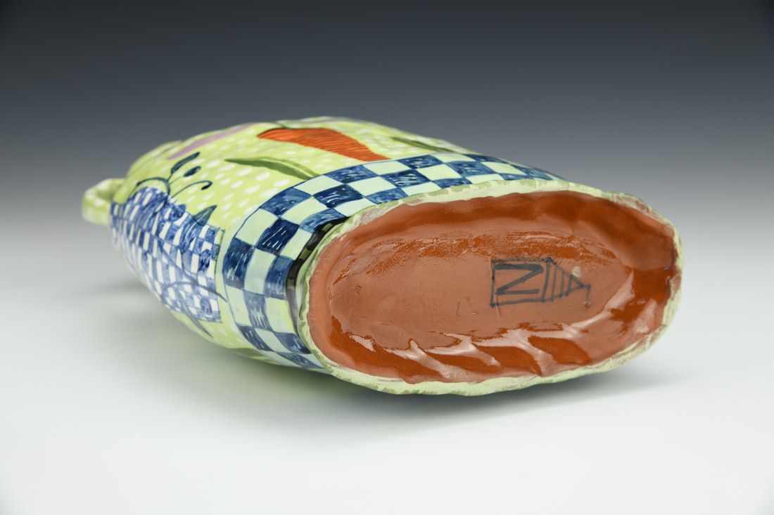 Red earthenware, hand built, underglaze, glaze, cone 04 fired, 10 x 8 x 3.5 inches.