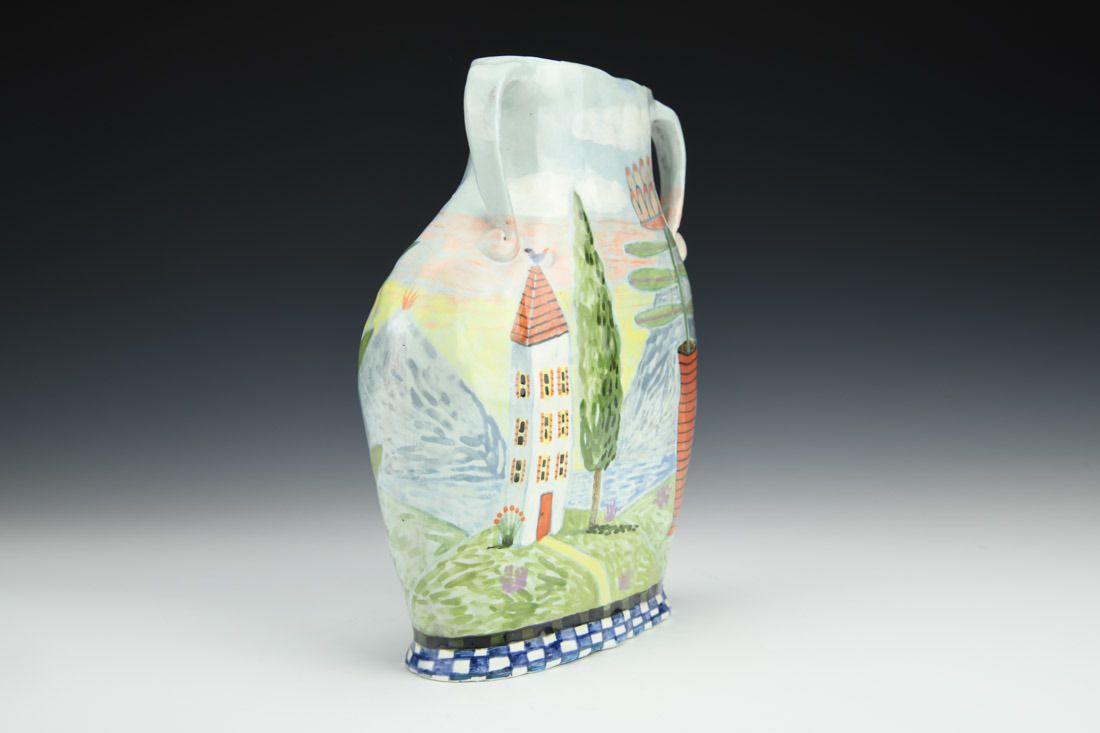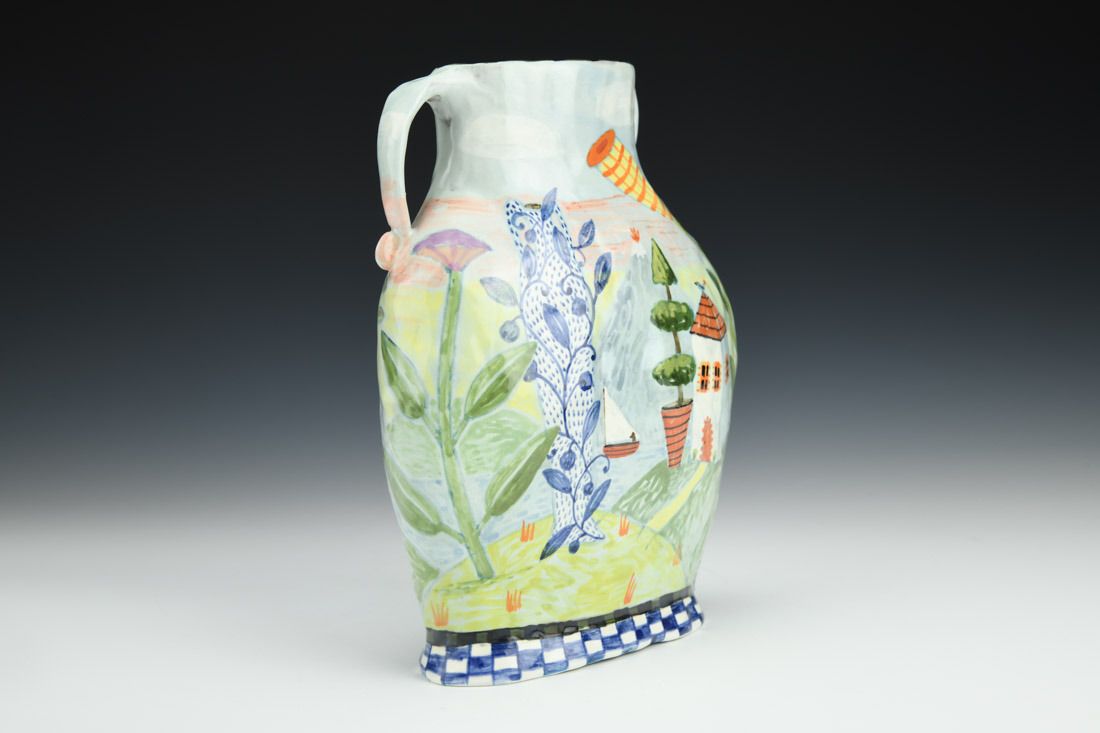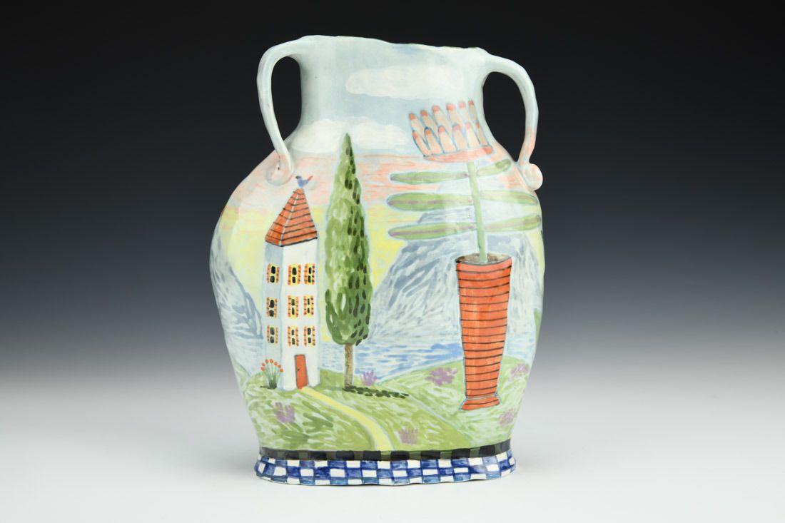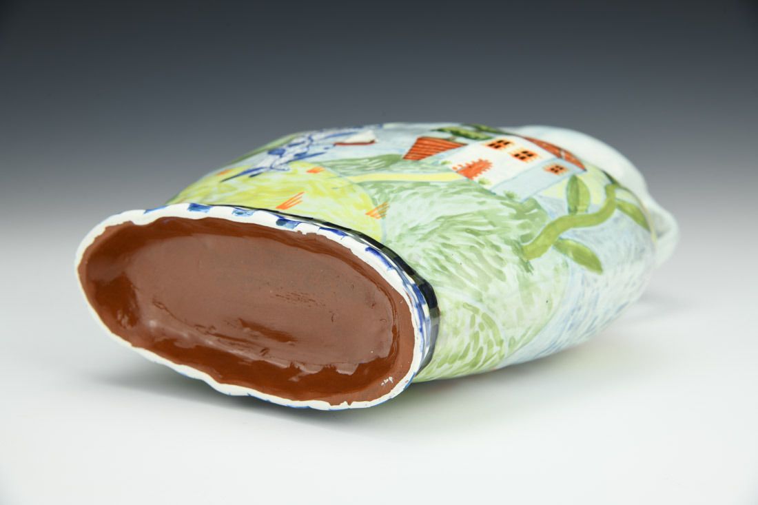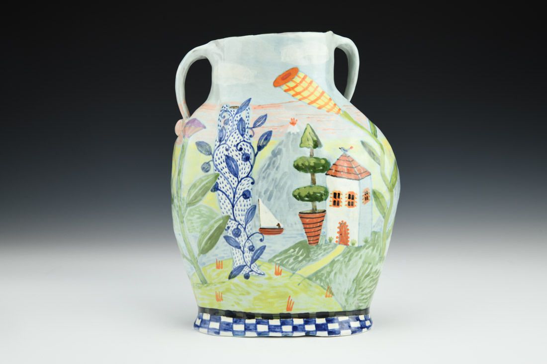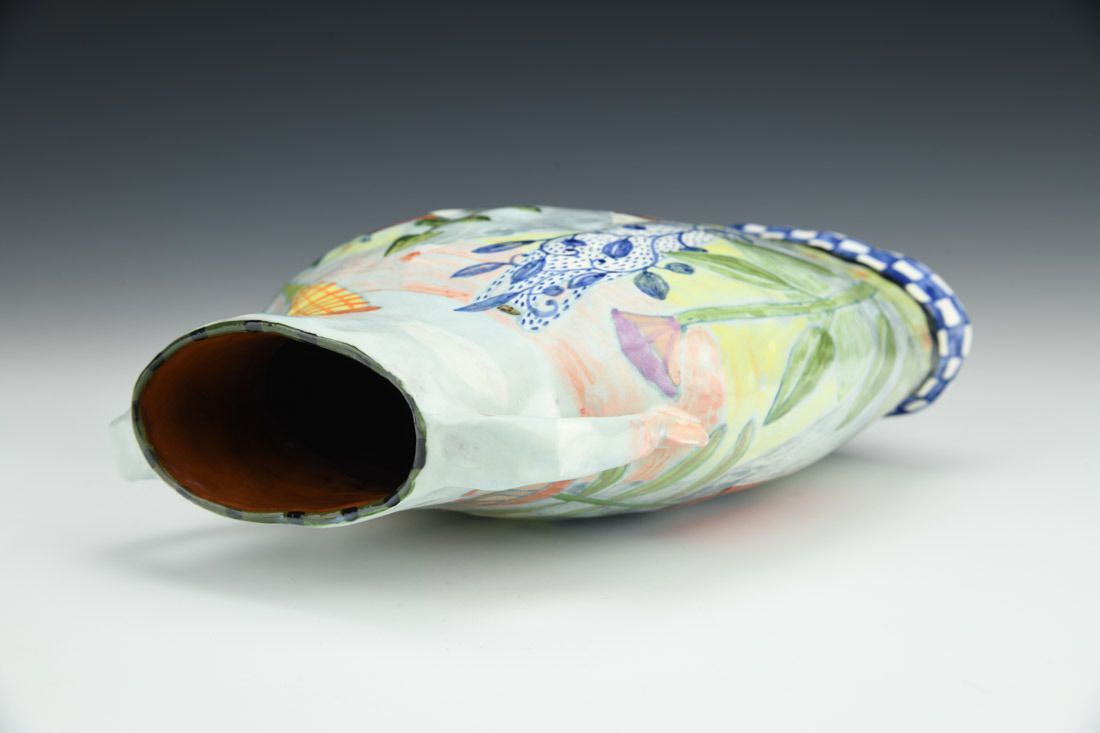 Red earthenware, hand built, underglaze, glaze, cone 04 fired, 8 x 6 x 2.5 inches.
