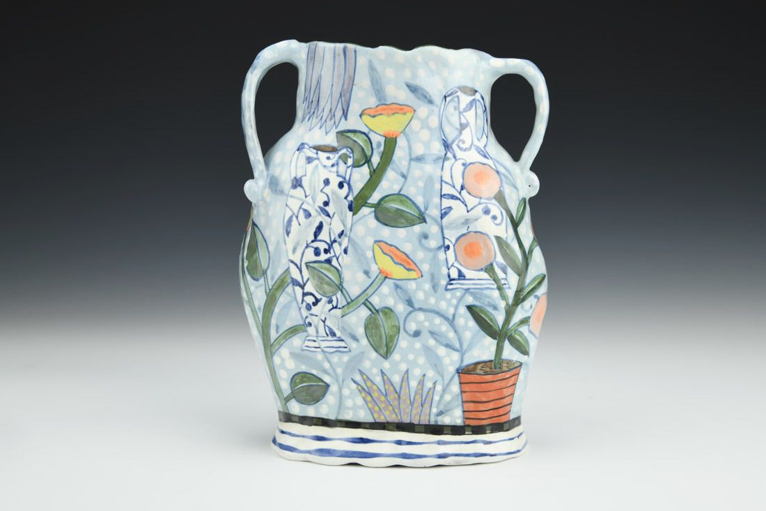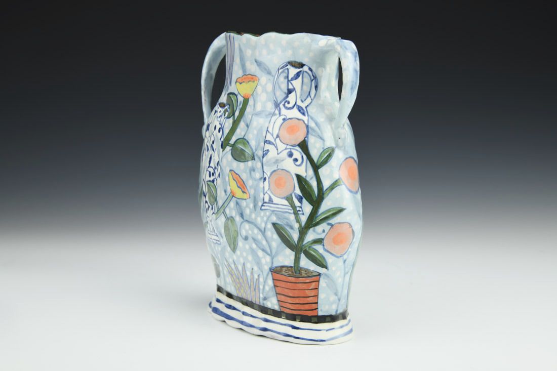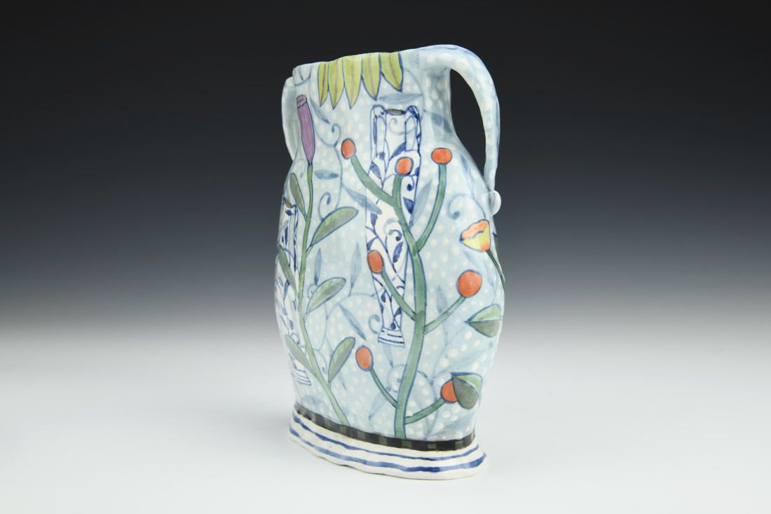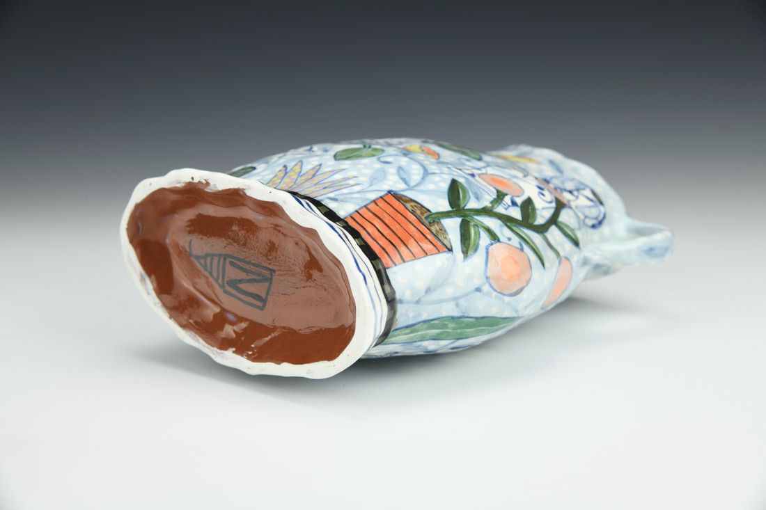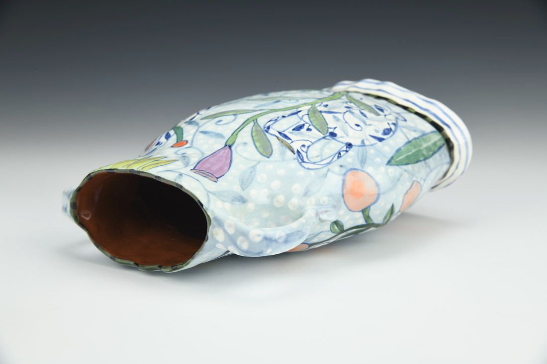 Red earthenware, hand built, underglaze, glaze, cone 04 fired, 7 x 6 x 2.5 inches.