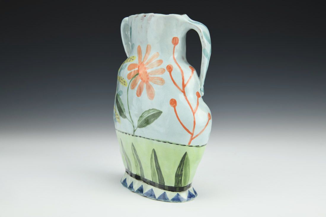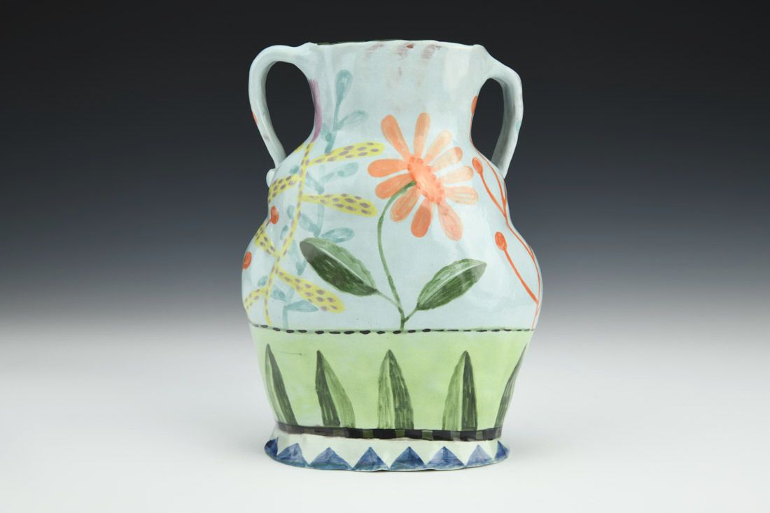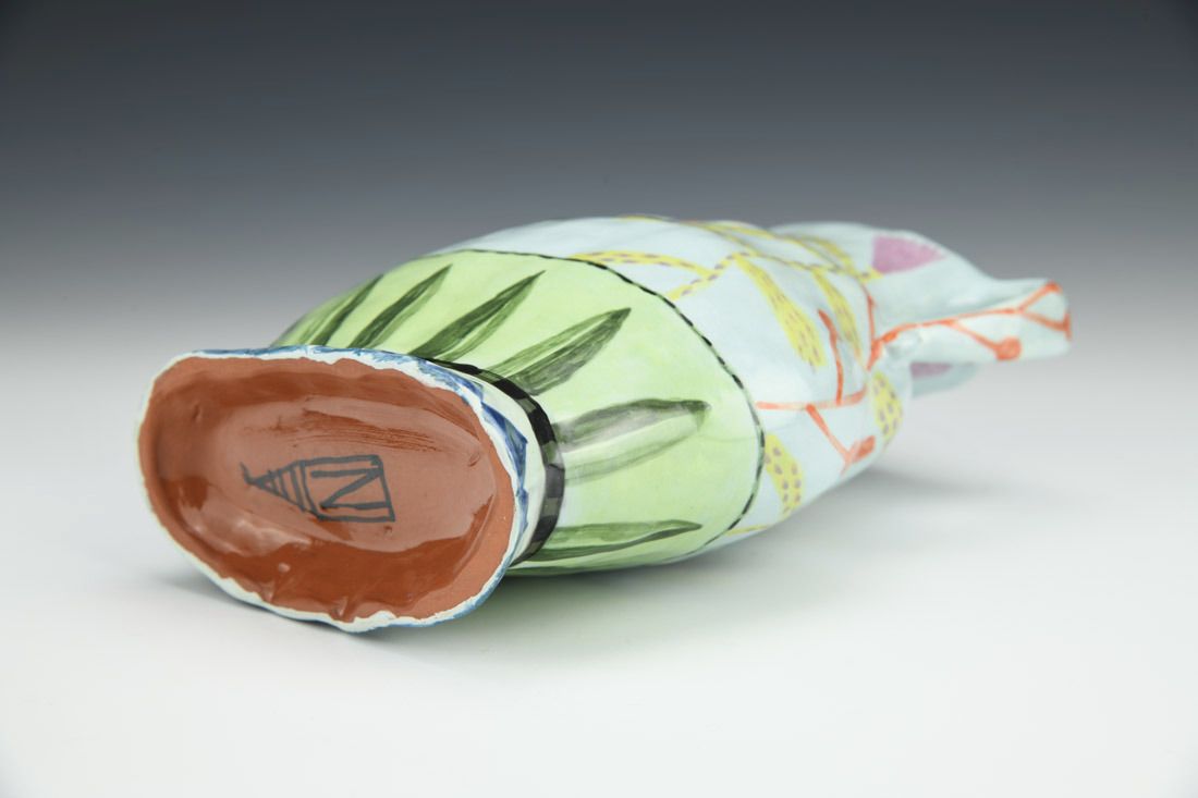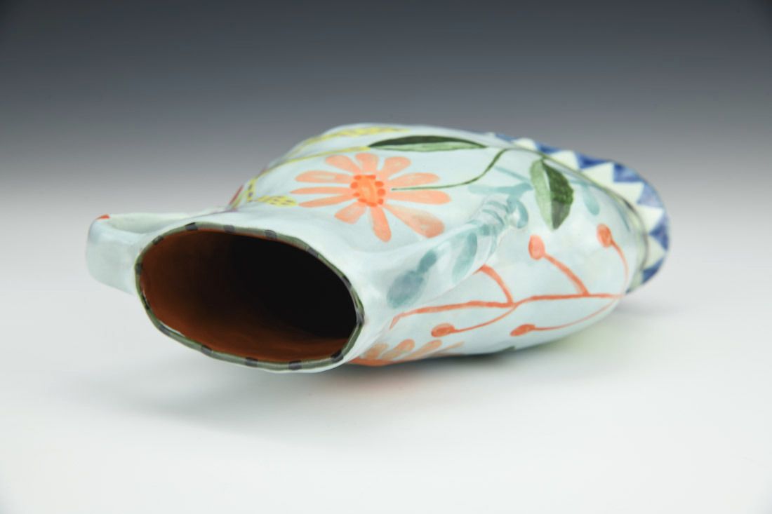 Red earthenware, hand built, underglaze, glaze, cone 04 fired, 7 x 5 x 2 inches.