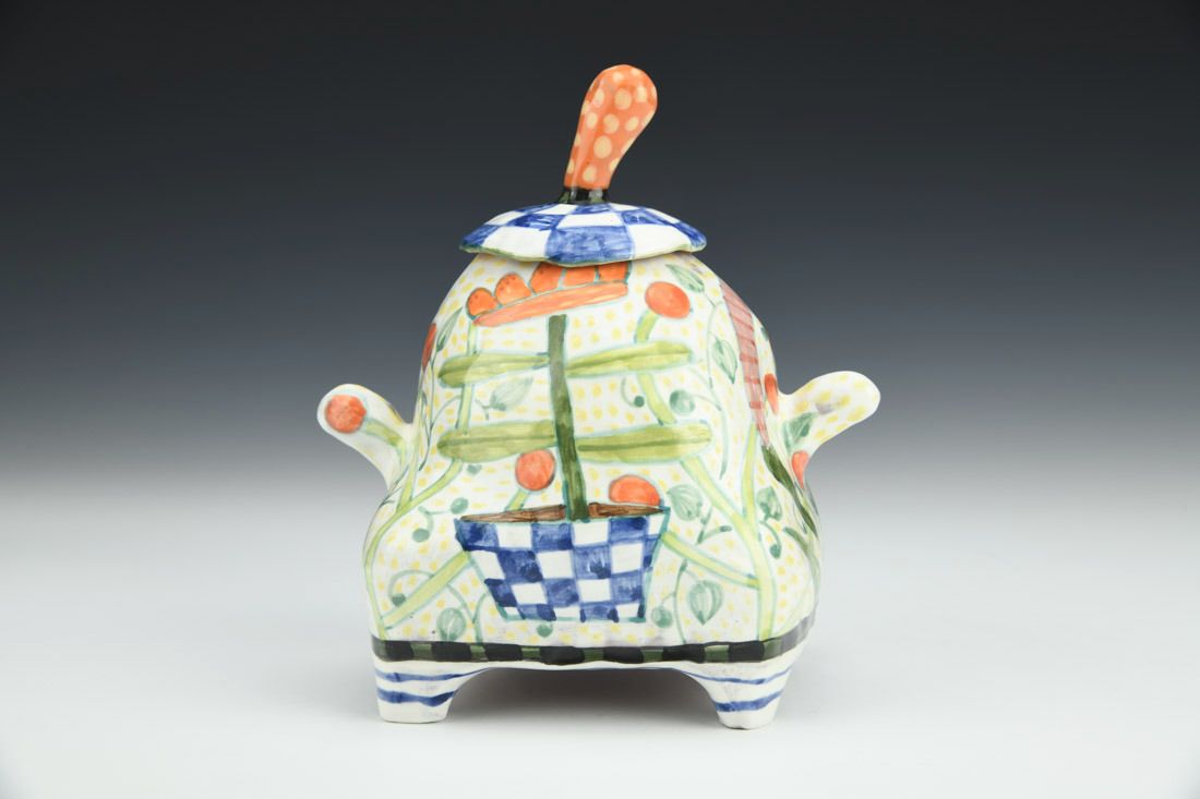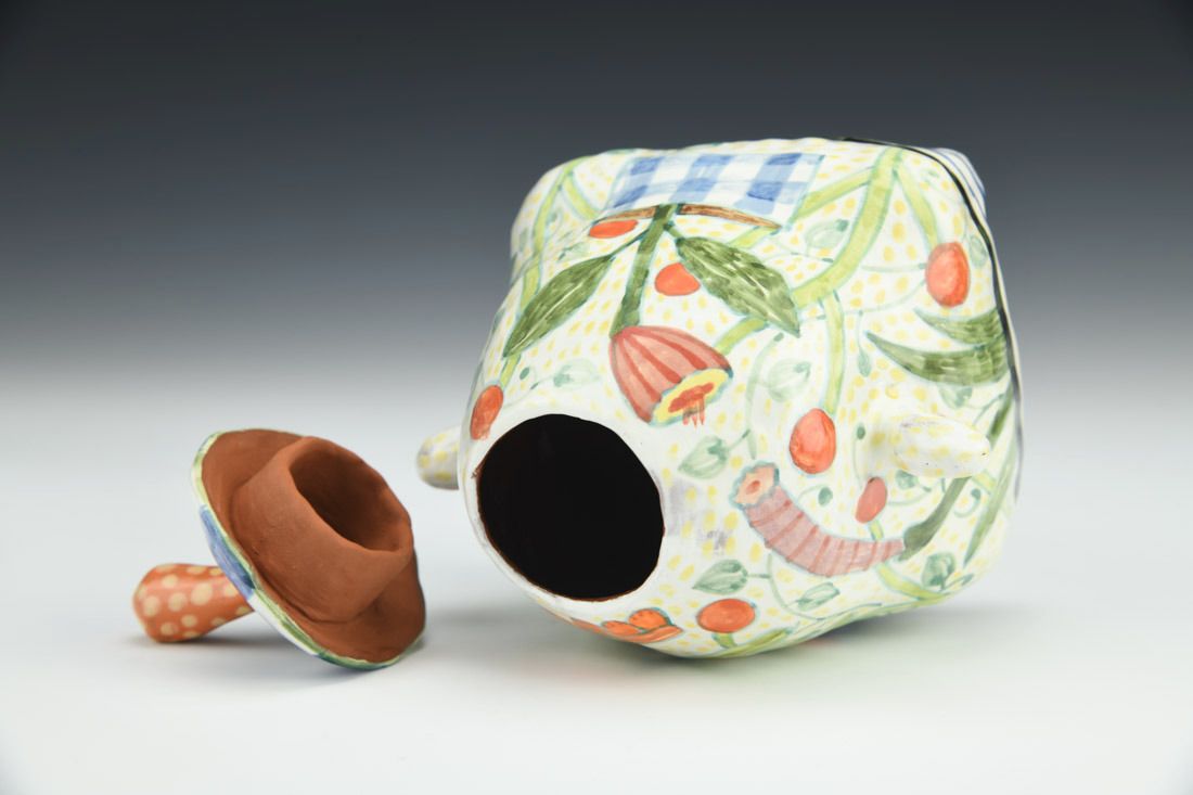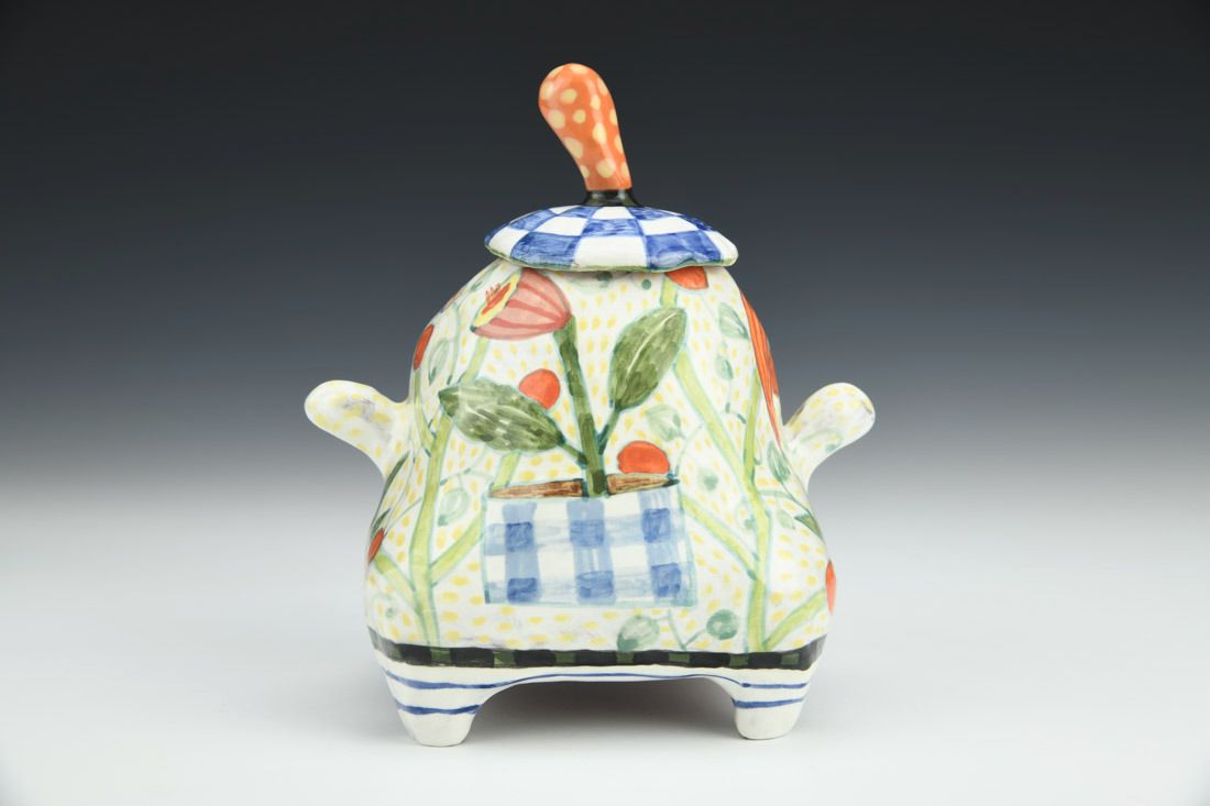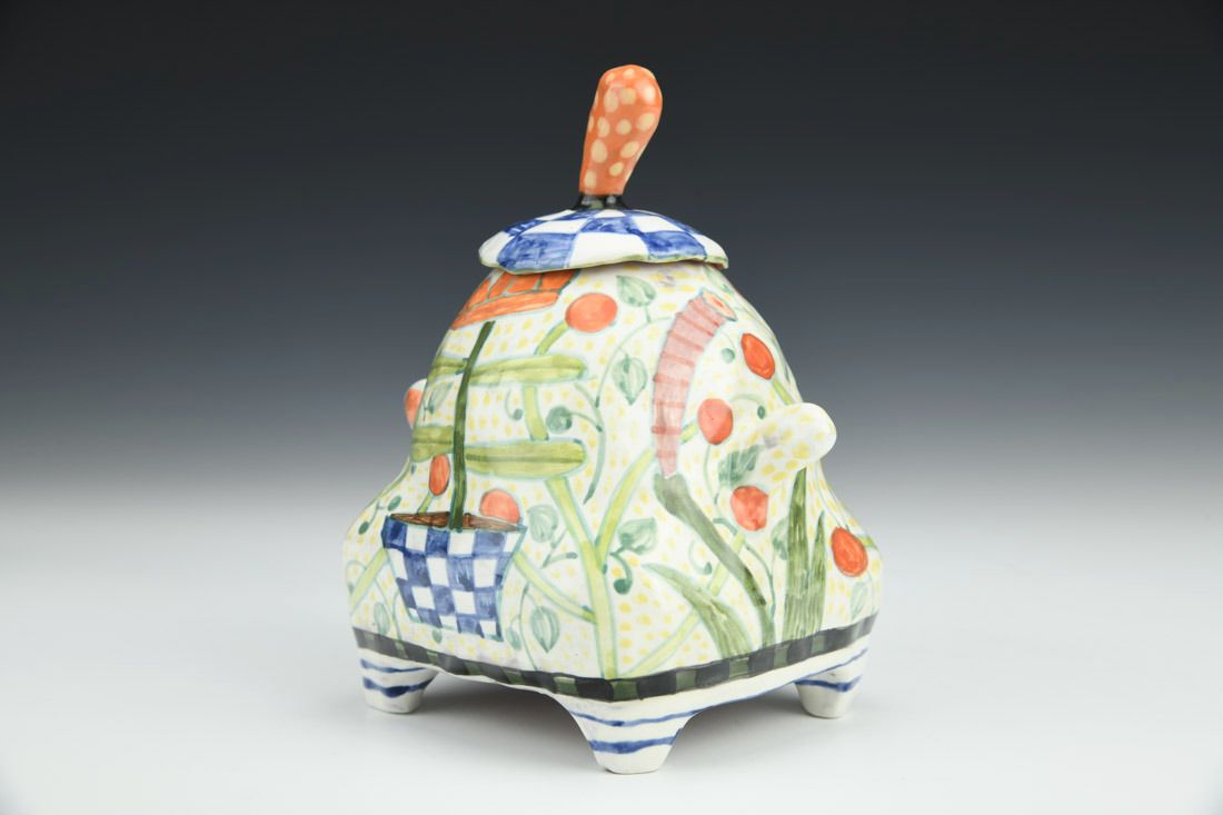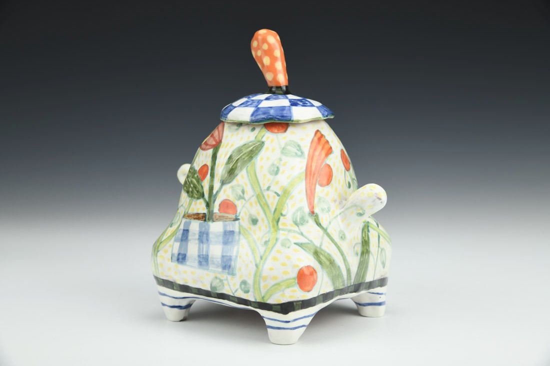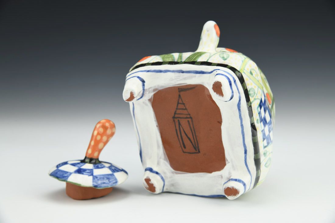Red earthenware, hand built, underglaze, glaze, cone 04 fired, 6 x 3.5 x 3.5 inches.