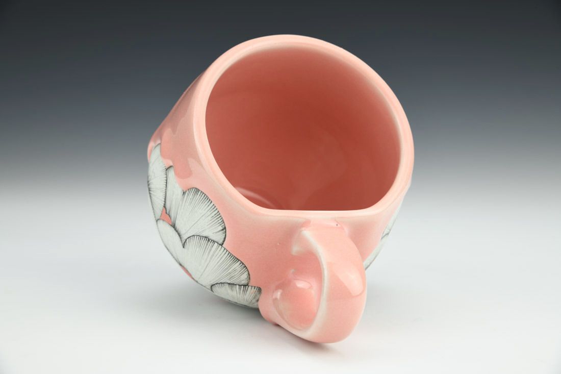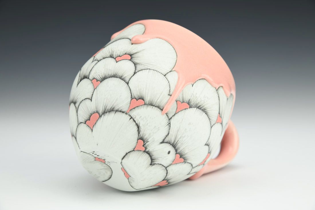White stoneware, slip cast, hand drawn, slip, underglaze, coral pink glaze, cone 5 oxidation fired, 4 x 5.25 x 4 inches.