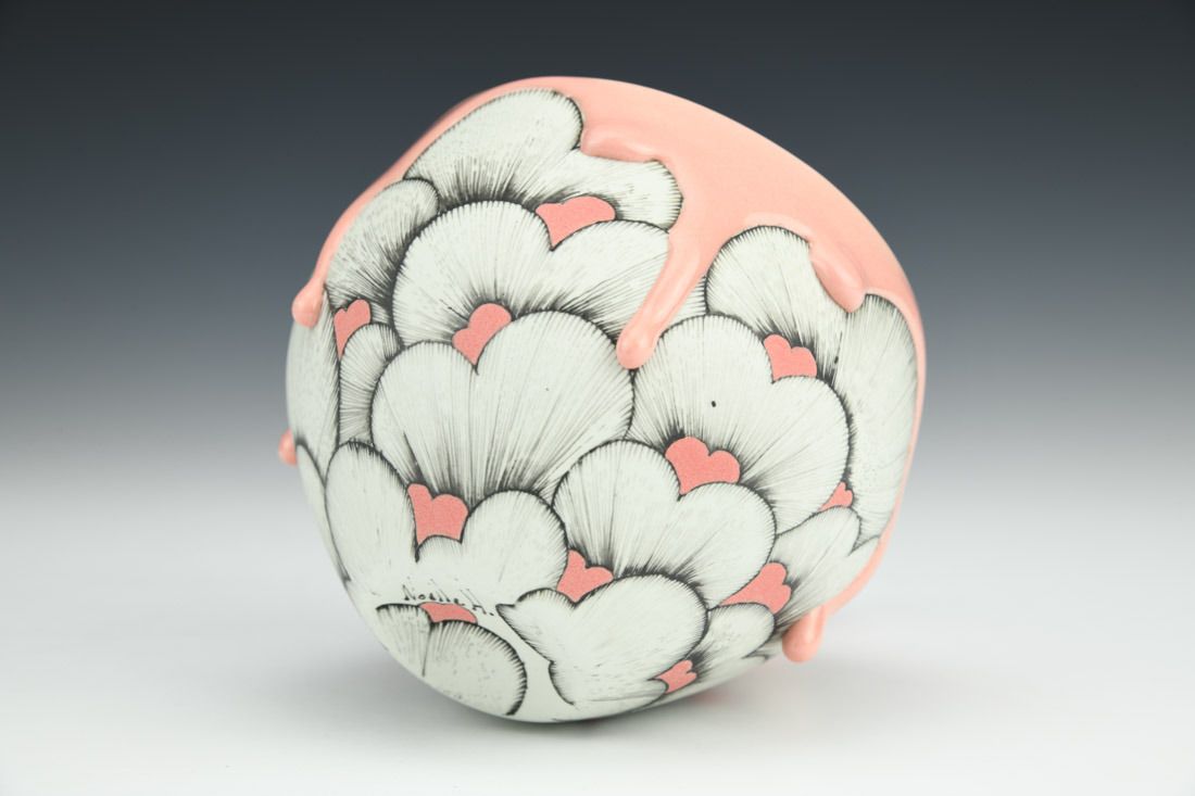 White stoneware, slip cast, hand drawn, slip, underglaze, coral pink glaze, cone 5 oxidation fired, 4 x 5.25 x 4 inches.