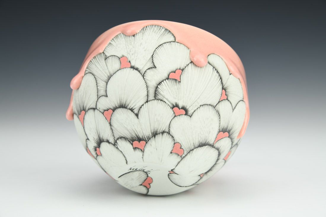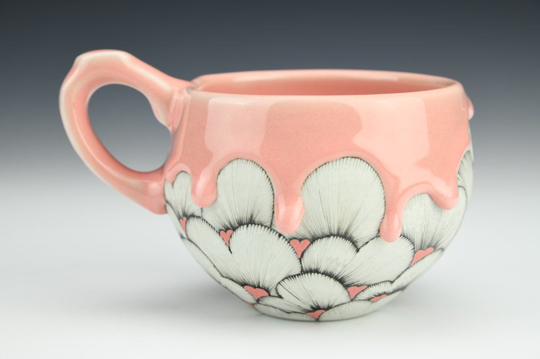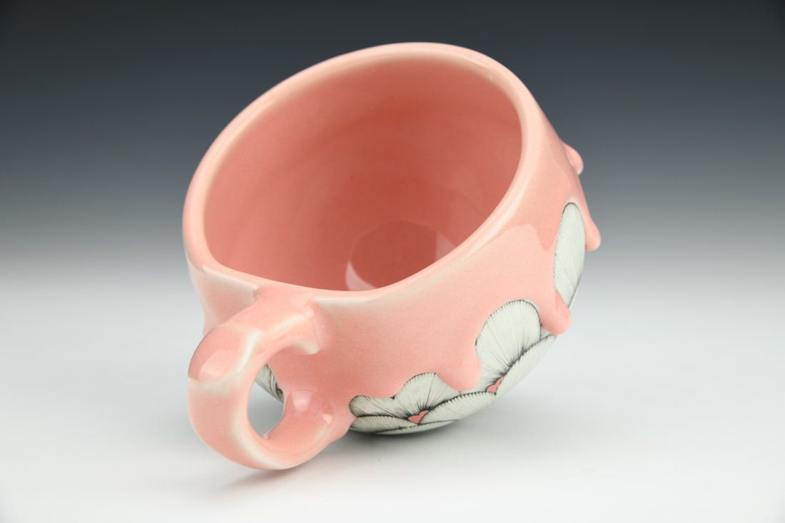 White stoneware, slip cast, hand drawn, slip, underglaze, coral pink glaze, cone 5 oxidation fired, 3.5 x 5.5 x 4.25 inches.