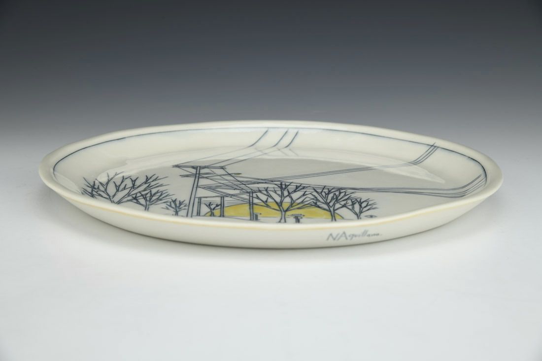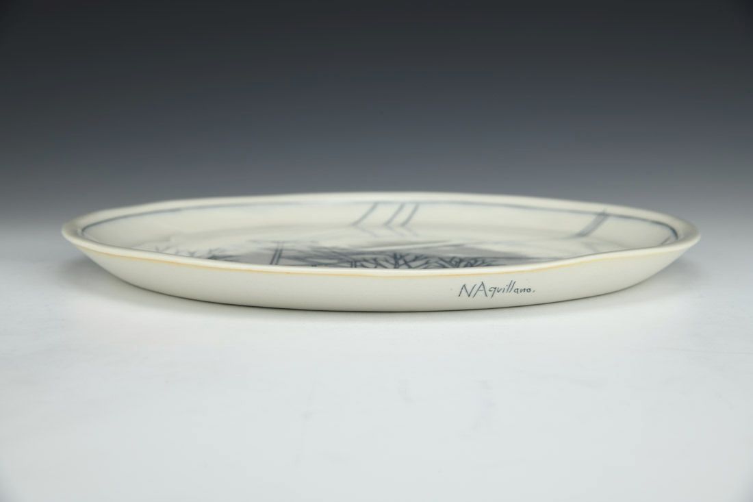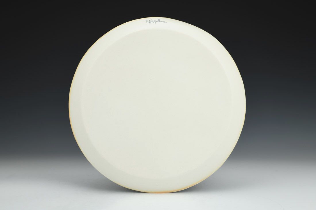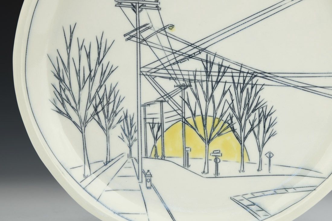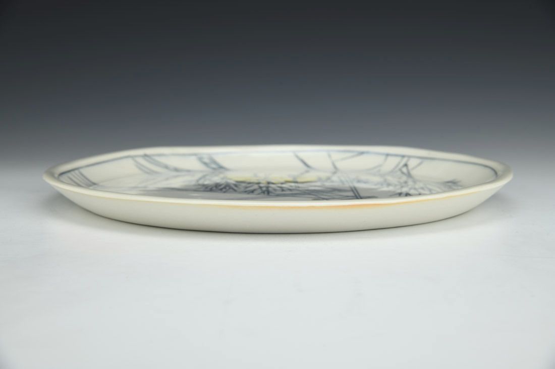 Porcelain, slipcast, mishima, cone 10 oxidation fired, 0.75 x 10.5 x 10.5 inches.