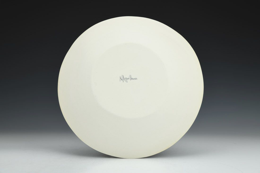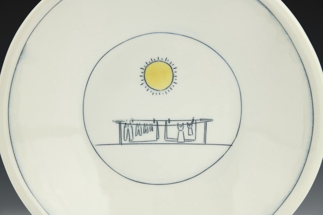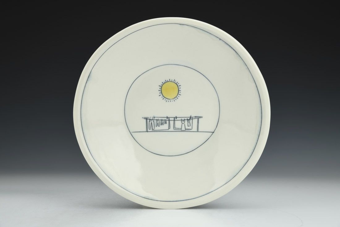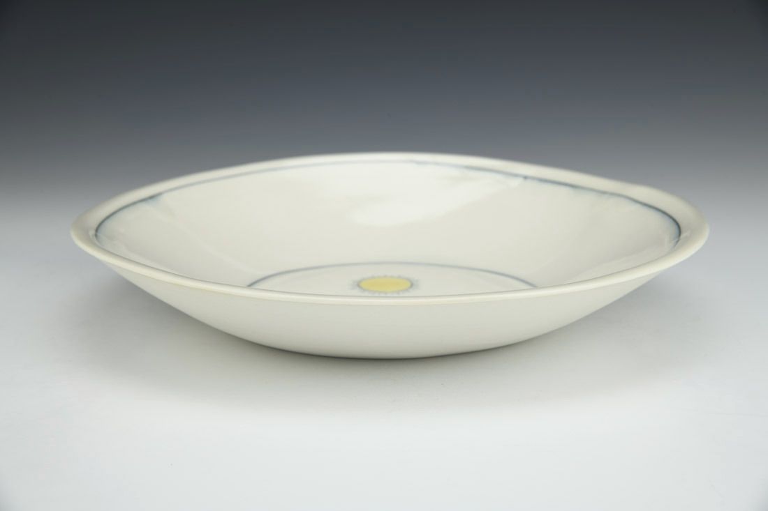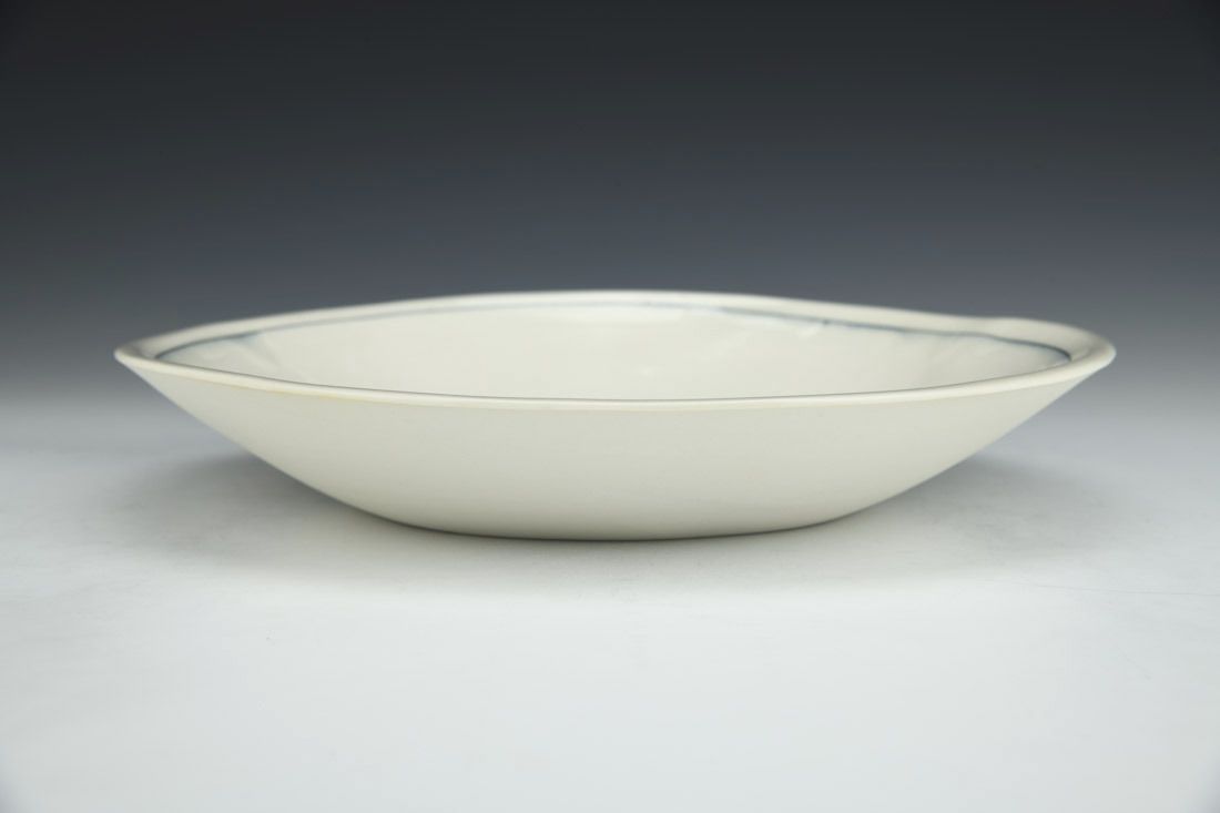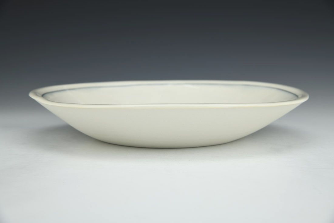 Porcelain, slipcast, mishima, cone 10 oxidation fired, 1.75 x 9.5 x 9.5 inches.