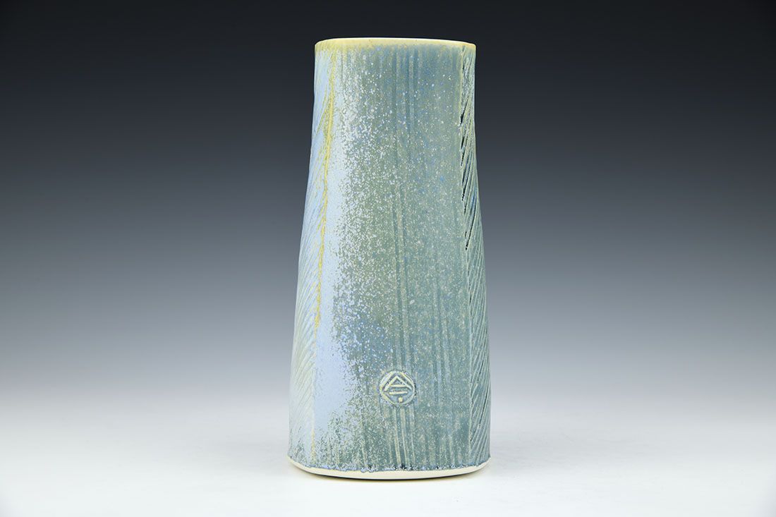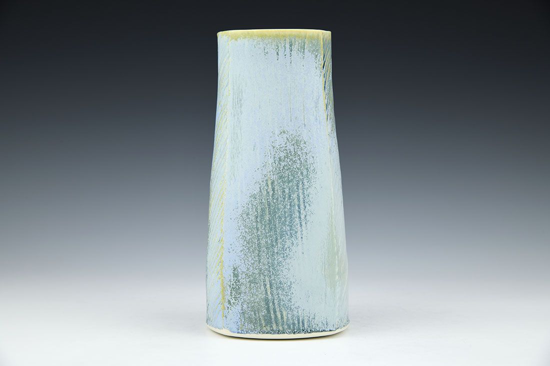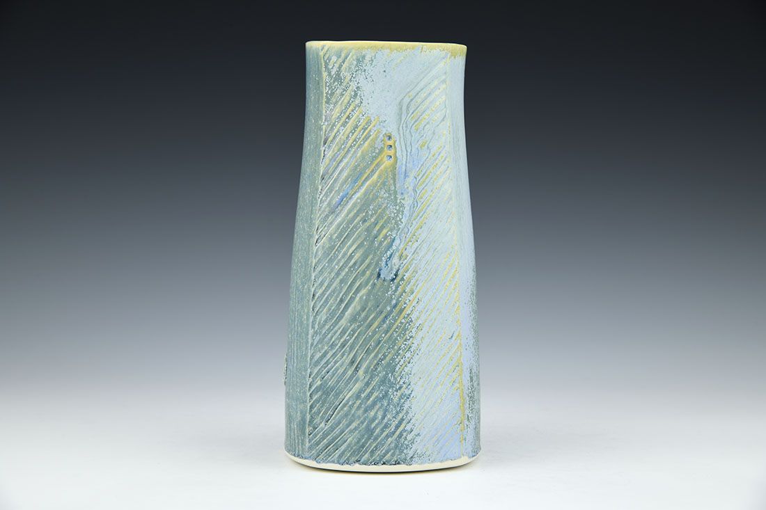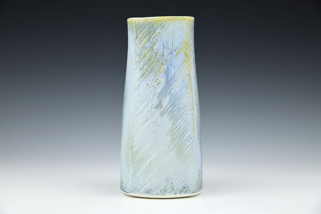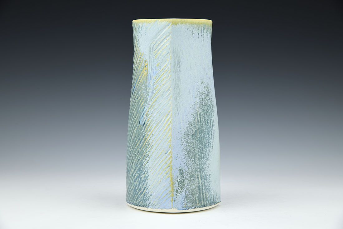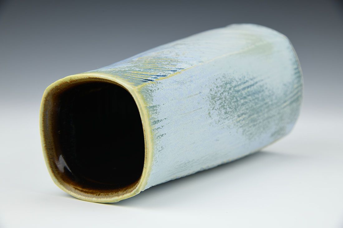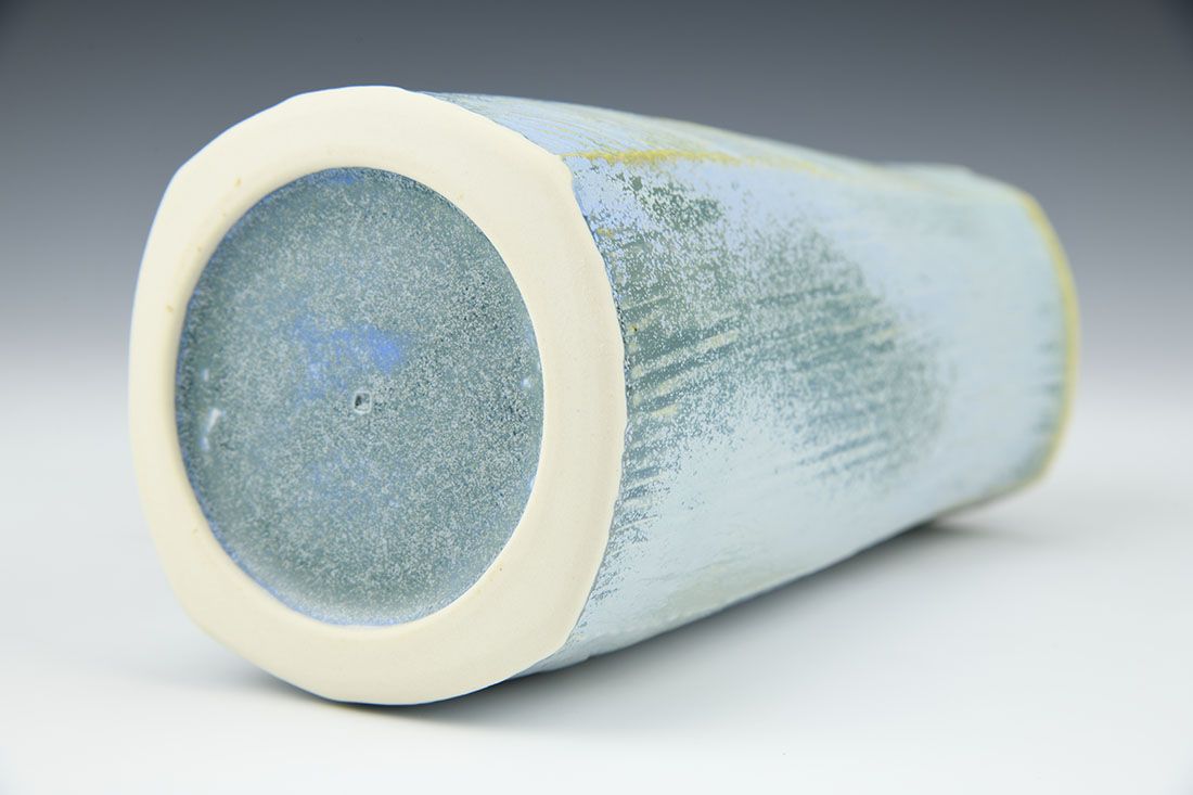 Porcelain, wheel thrown and altered, cone 6 electric fired, 7.25 x 3.5 x 3.5 inches.